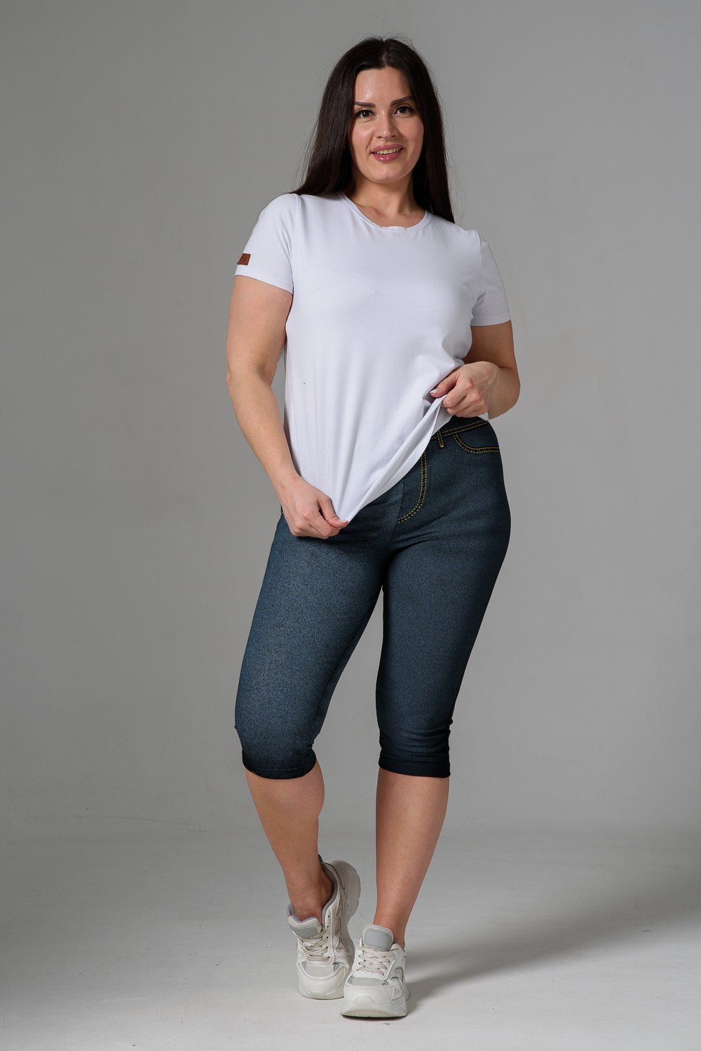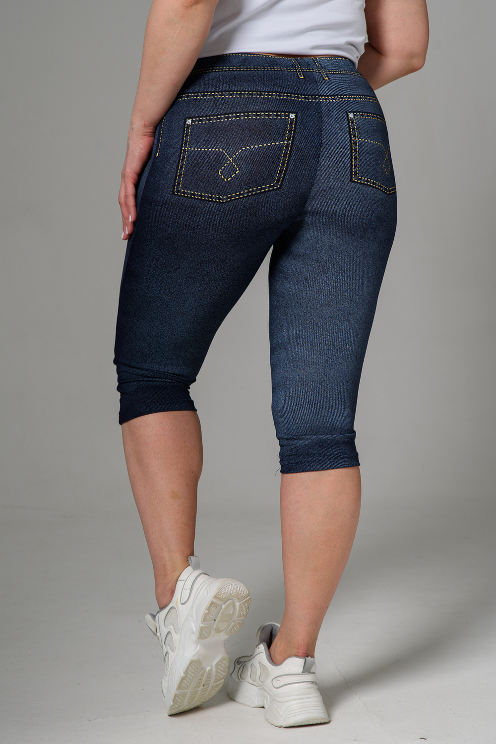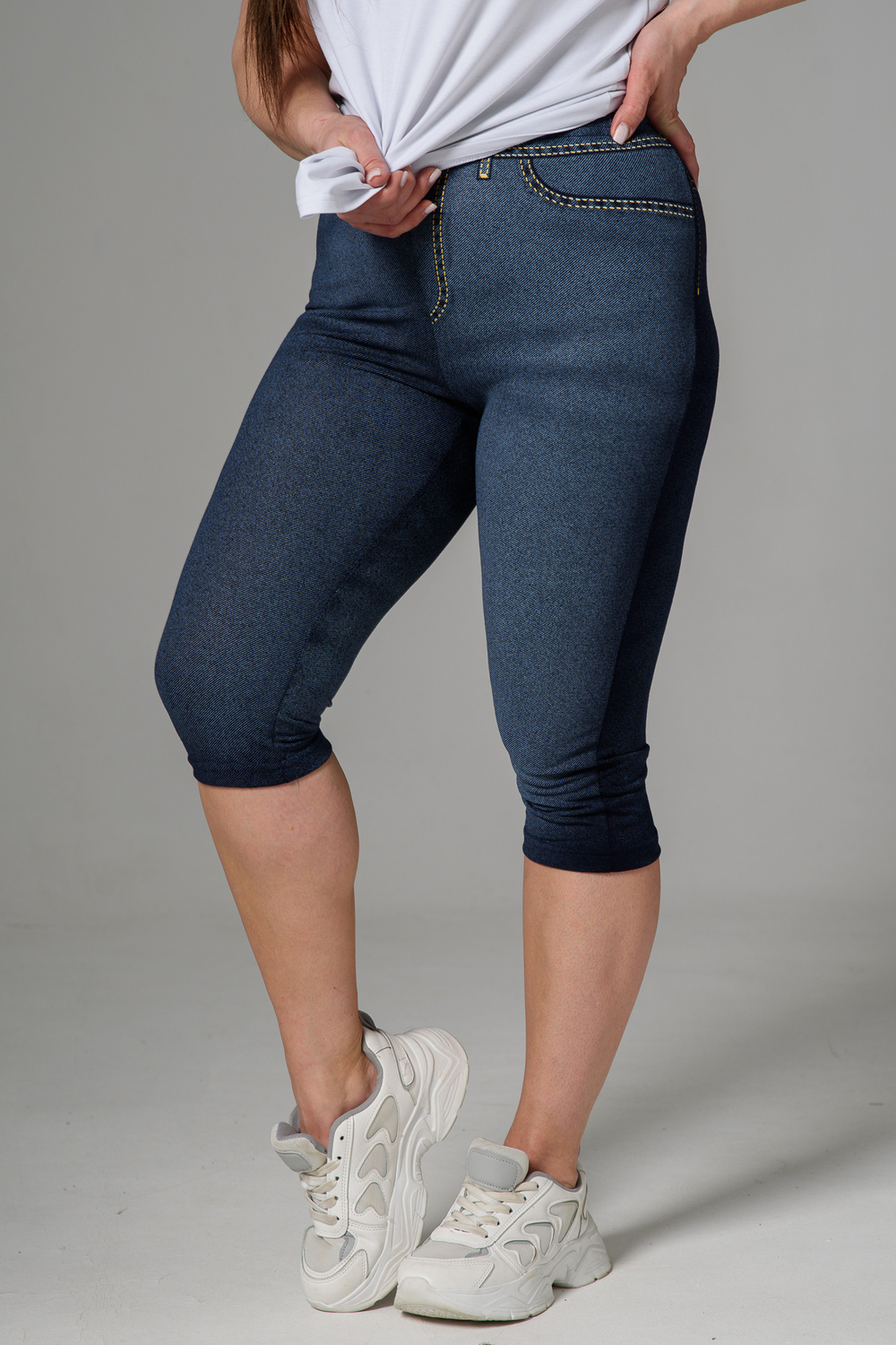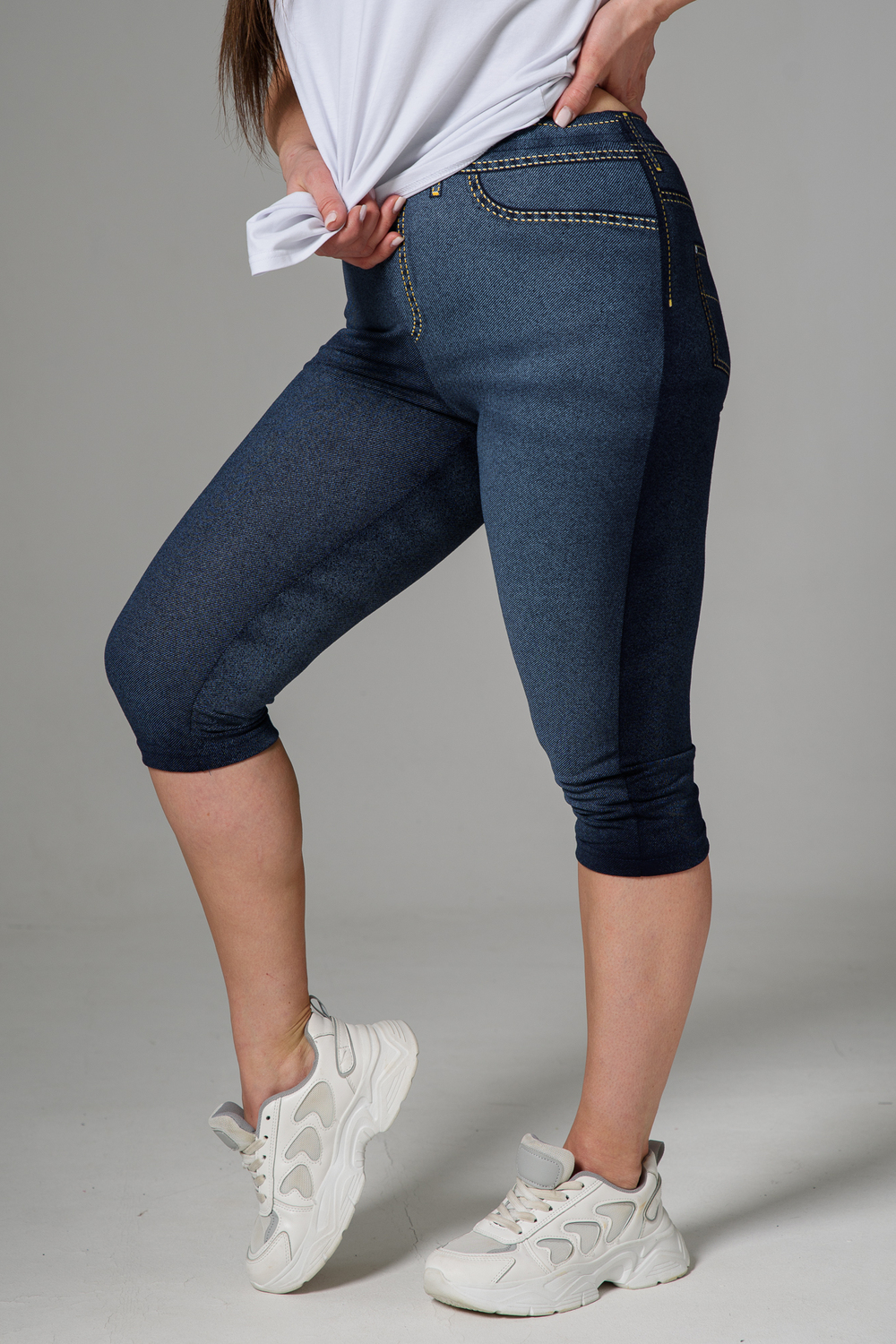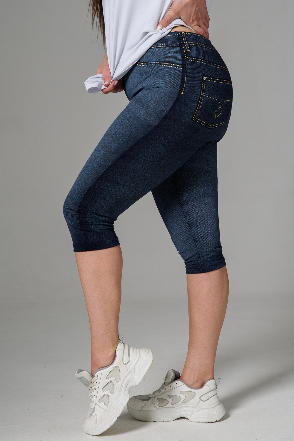 Бриджи облегающие, чуть ниже колена. На передней и задней части принт, имитирующий джинсы