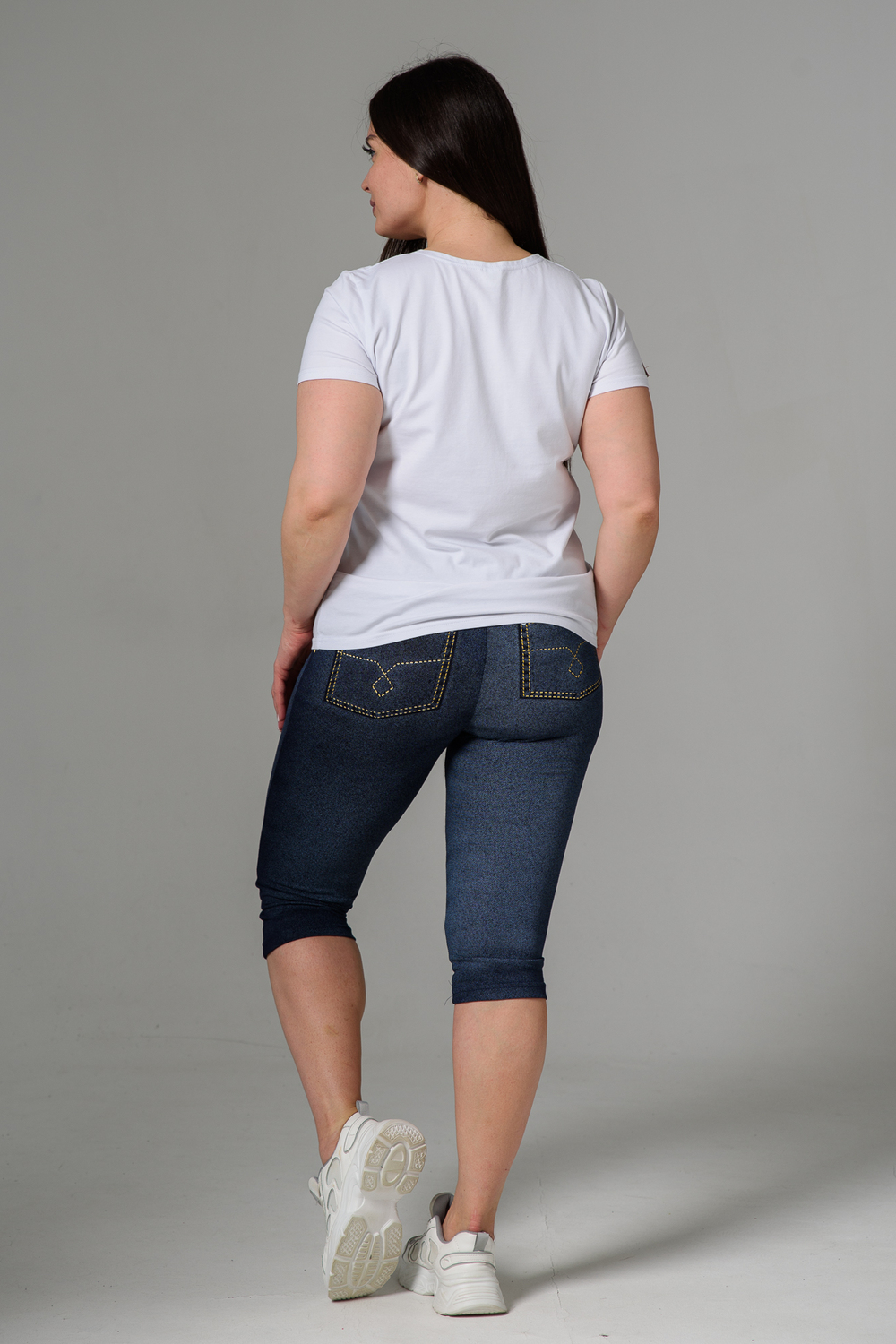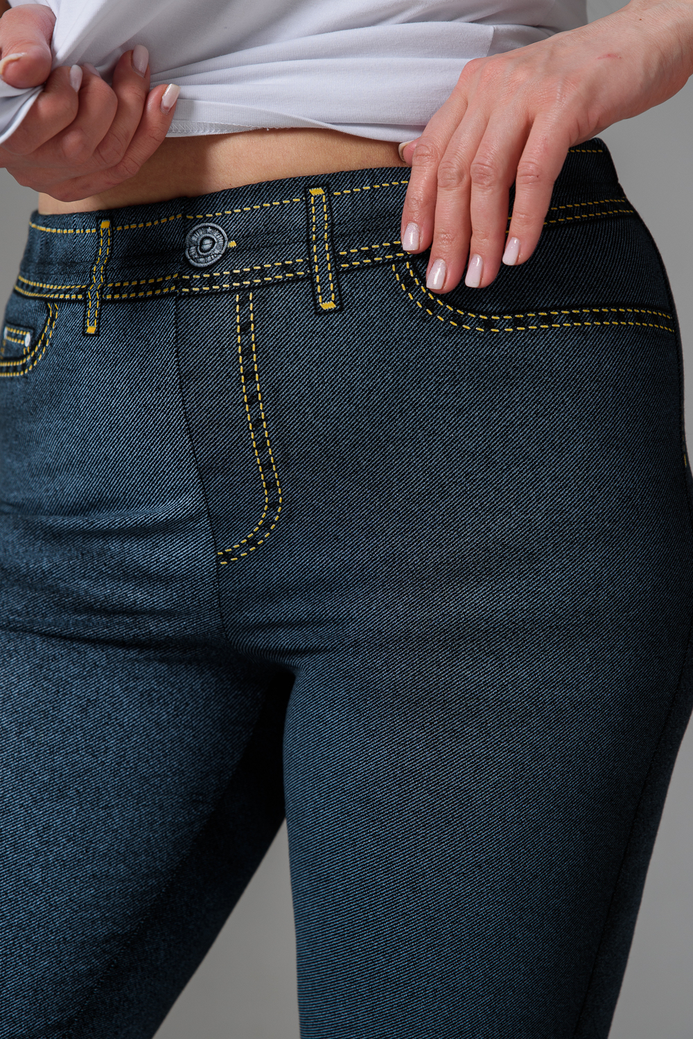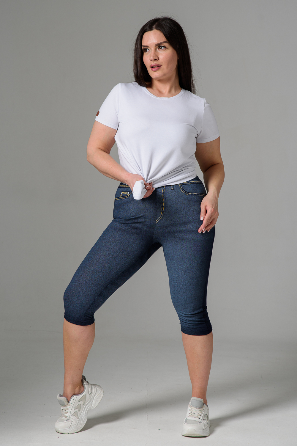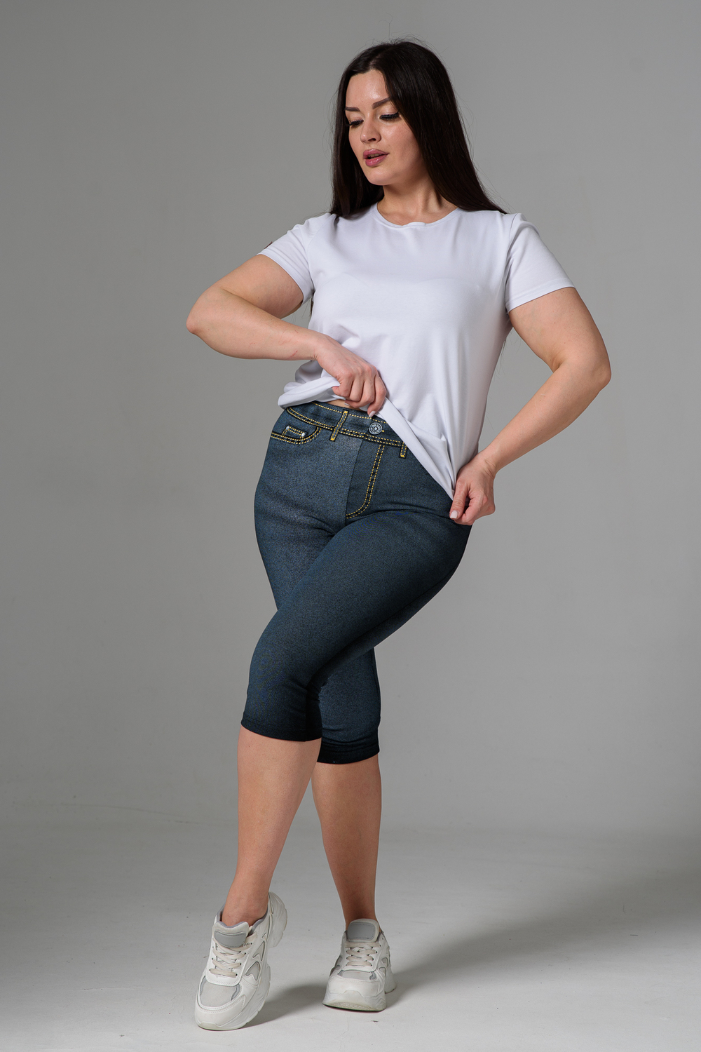 Бриджи облегающие, чуть ниже колена. На передней и задней части принт, имитирующий джинсы