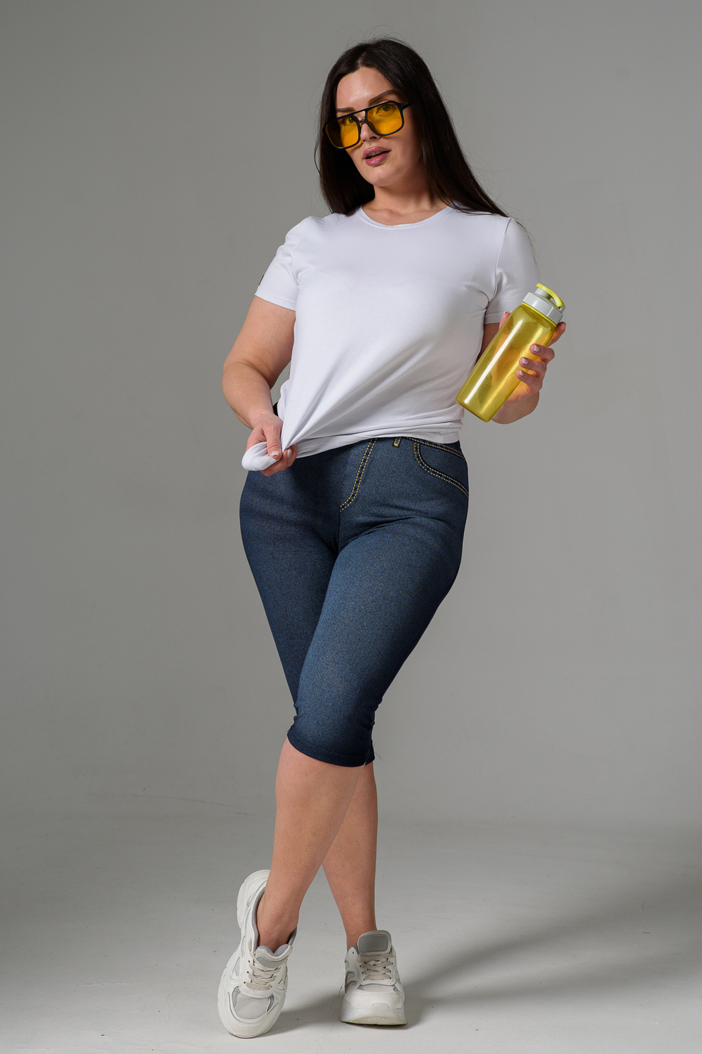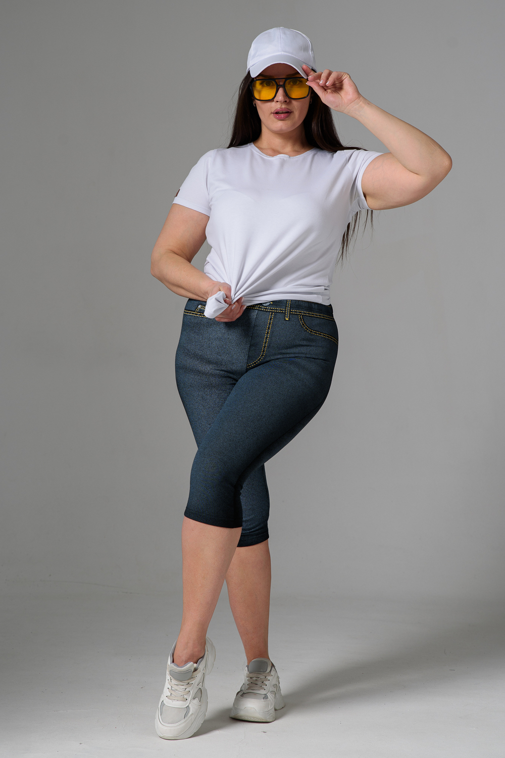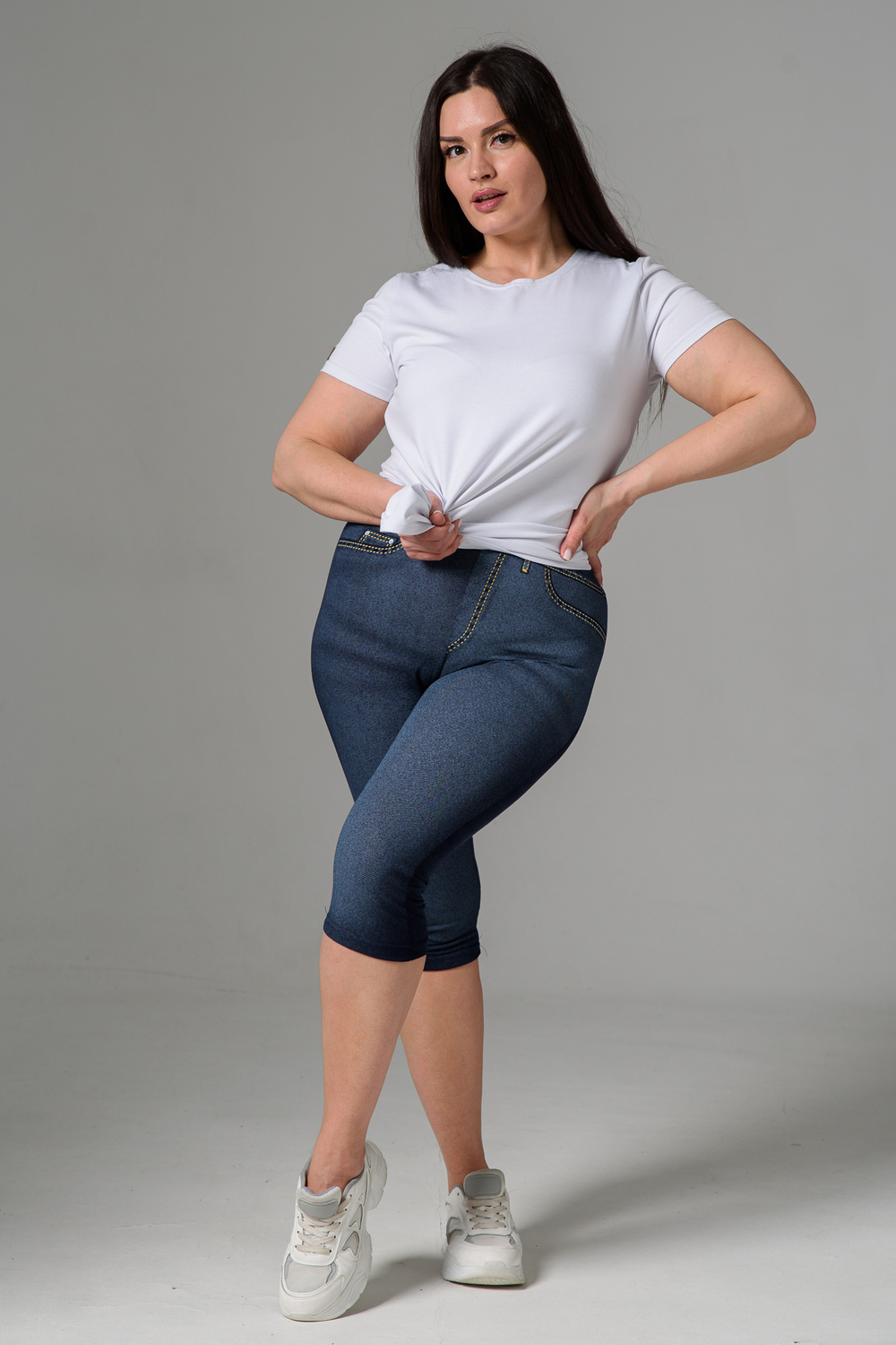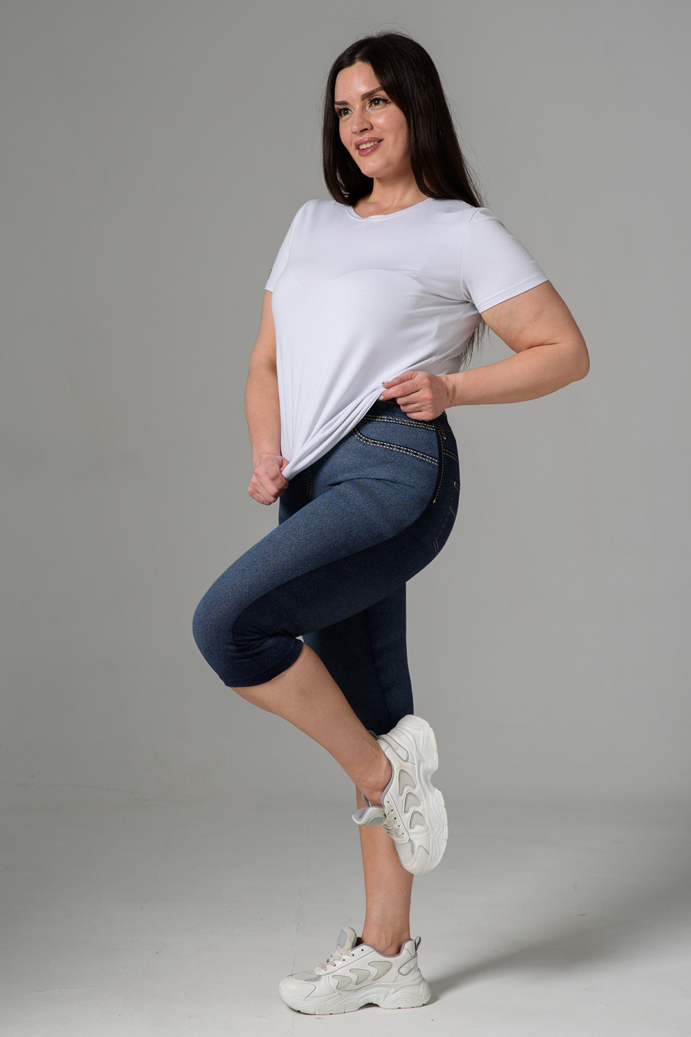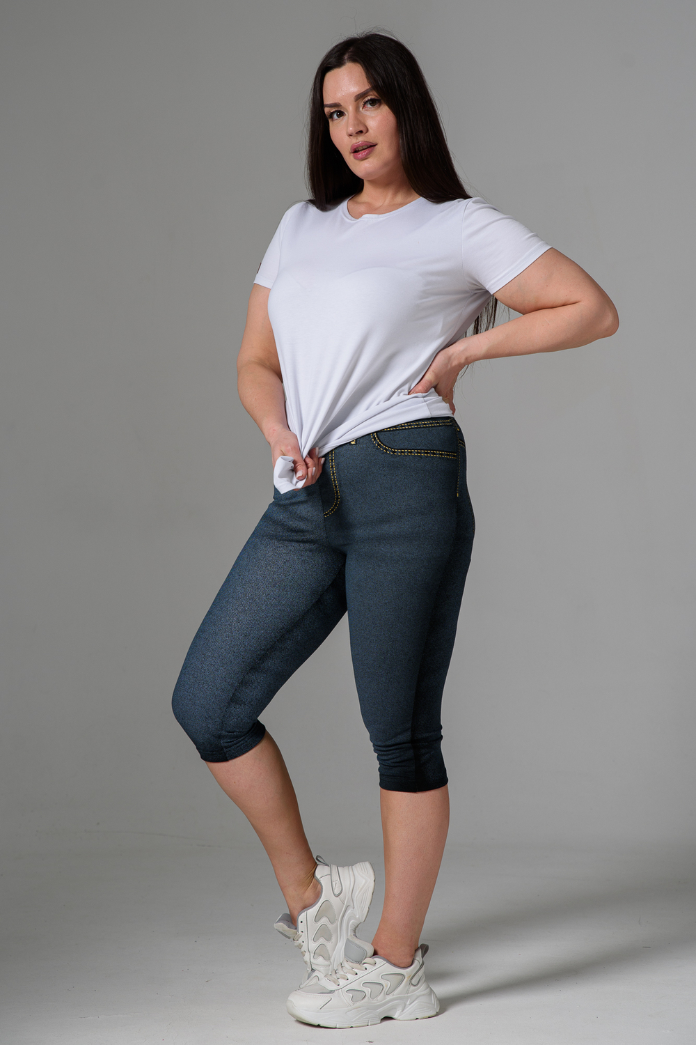Бриджи облегающие, чуть ниже колена. На передней и задней части принт, имитирующий джинсы