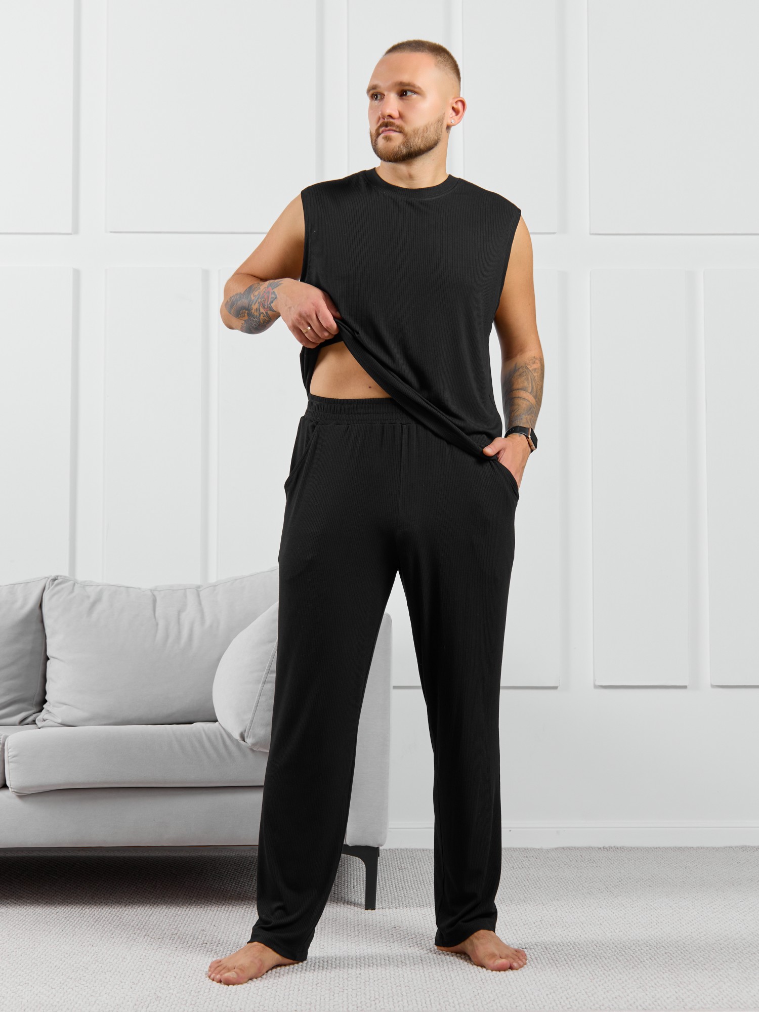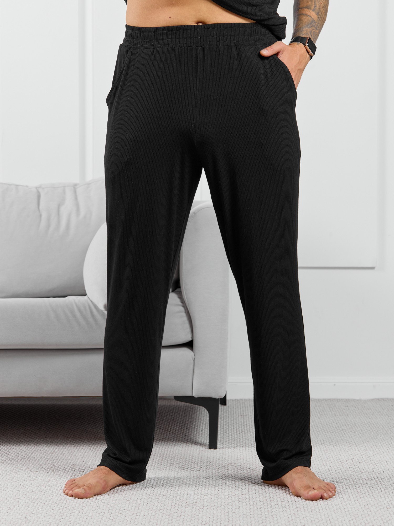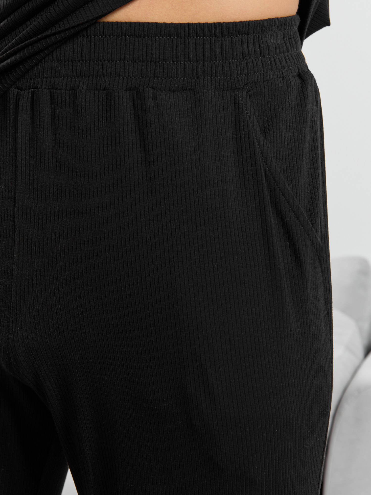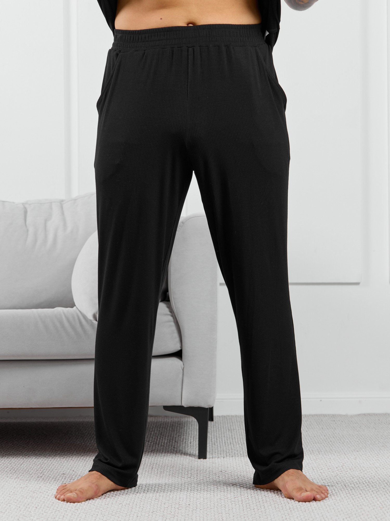 Брюки мужские из пластичного однотонного трикотажного полотна в рубчик, приятного к телу. Модель свободная, прямого силуэта, с боковыми карманами с обтачными входами, на притачном поясе с отстроченной эластичной тесьмой.