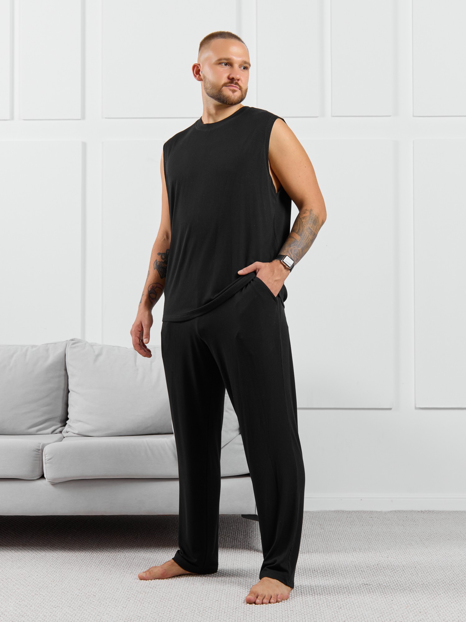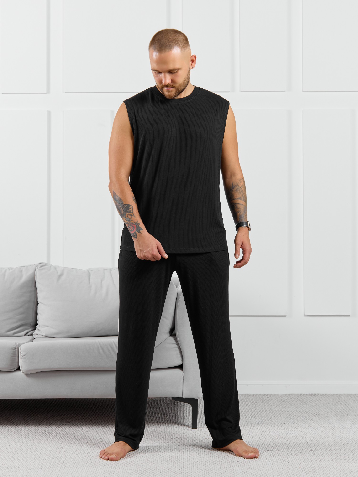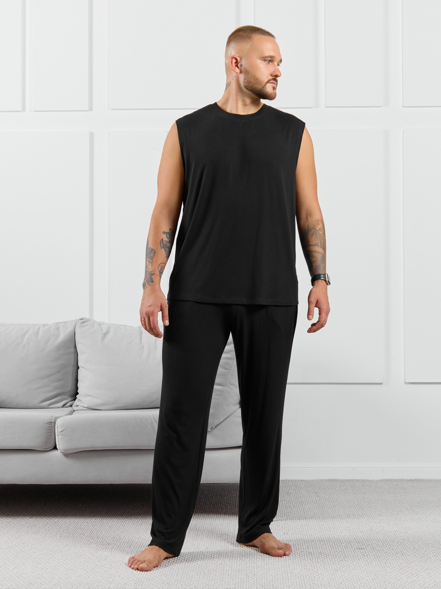 Брюки мужские из пластичного однотонного трикотажного полотна в рубчик, приятного к телу. Модель свободная, прямого силуэта, с боковыми карманами с обтачными входами, на притачном поясе с отстроченной эластичной тесьмой.
