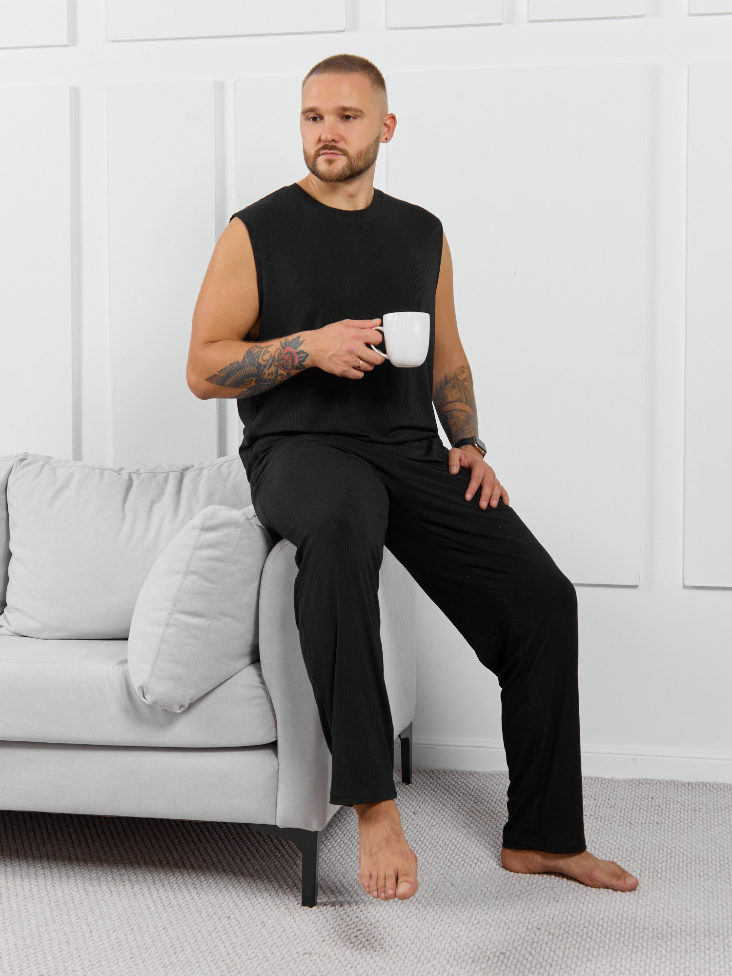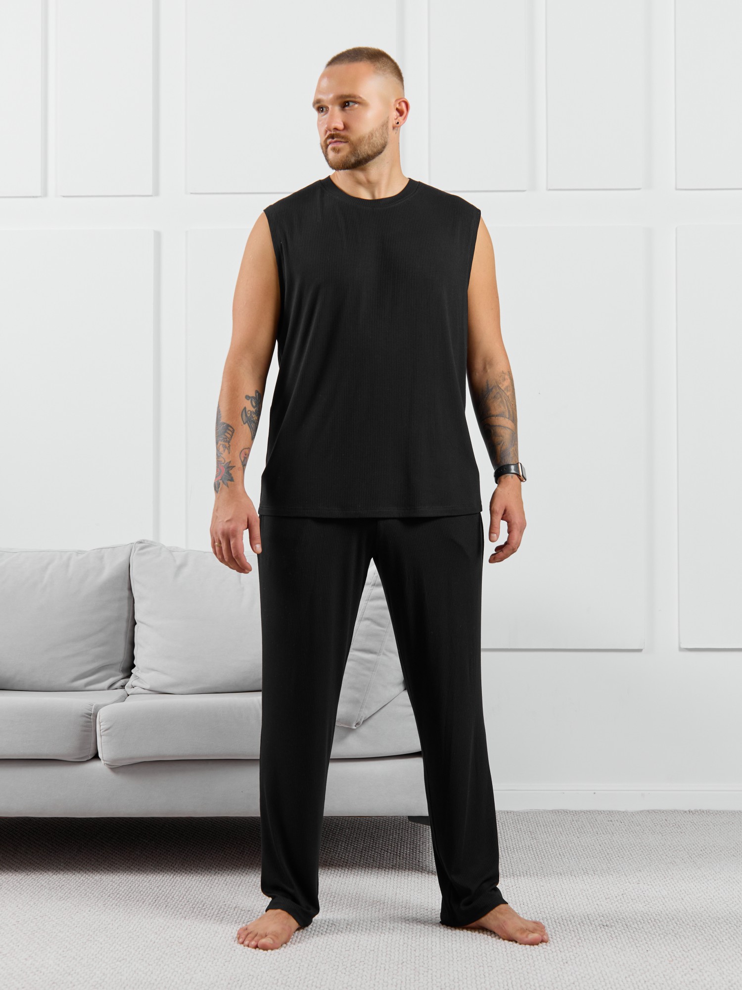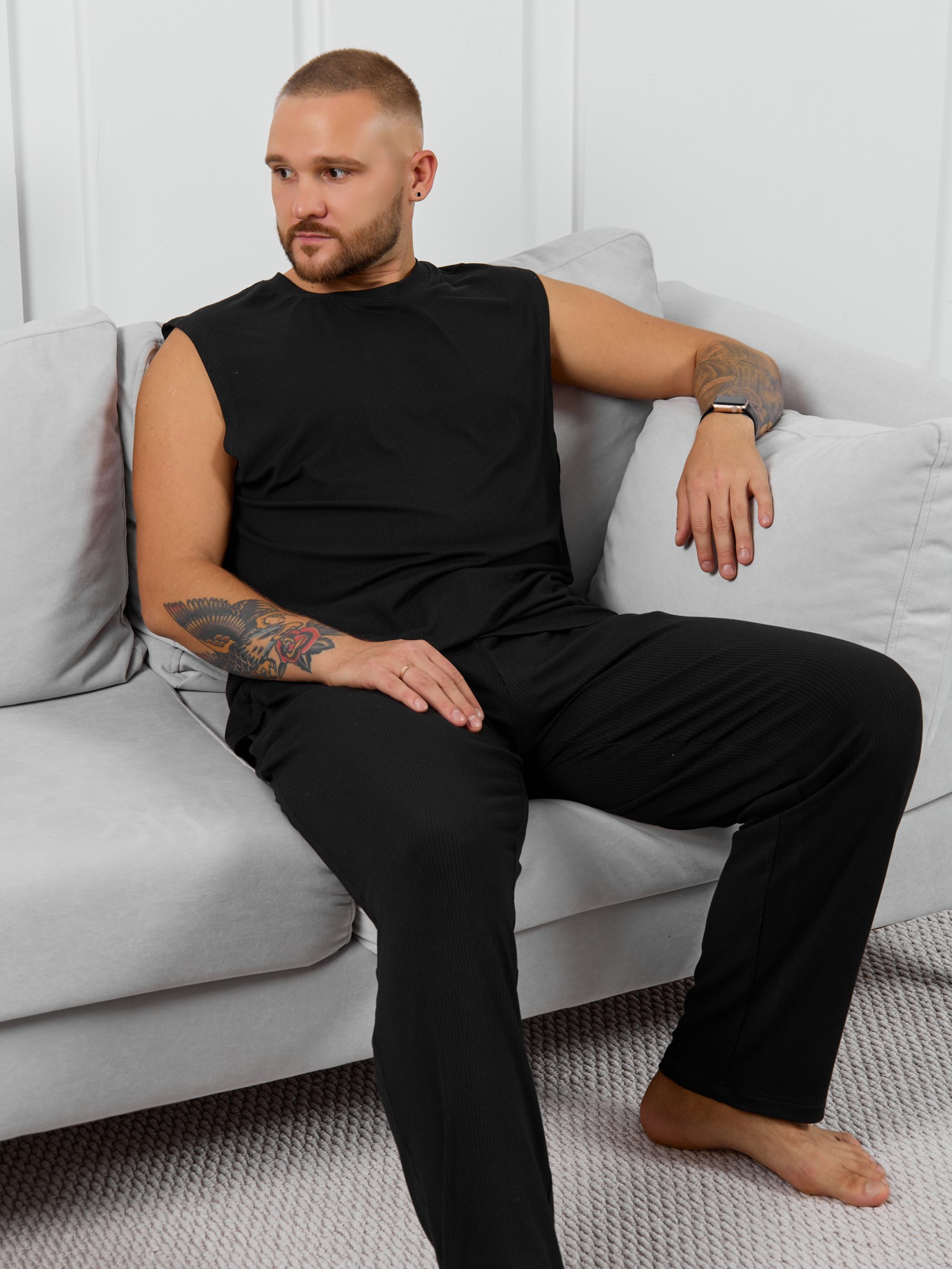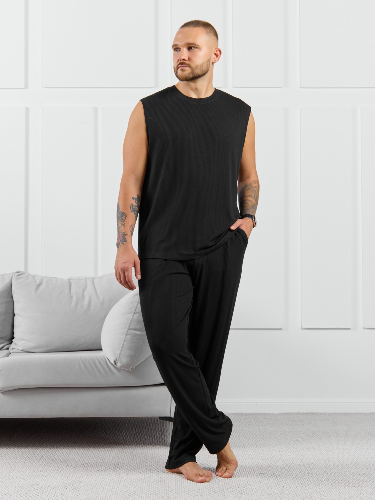 Брюки мужские из пластичного однотонного трикотажного полотна в рубчик, приятного к телу. Модель свободная, прямого силуэта, с боковыми карманами с обтачными входами, на притачном поясе с отстроченной эластичной тесьмой.