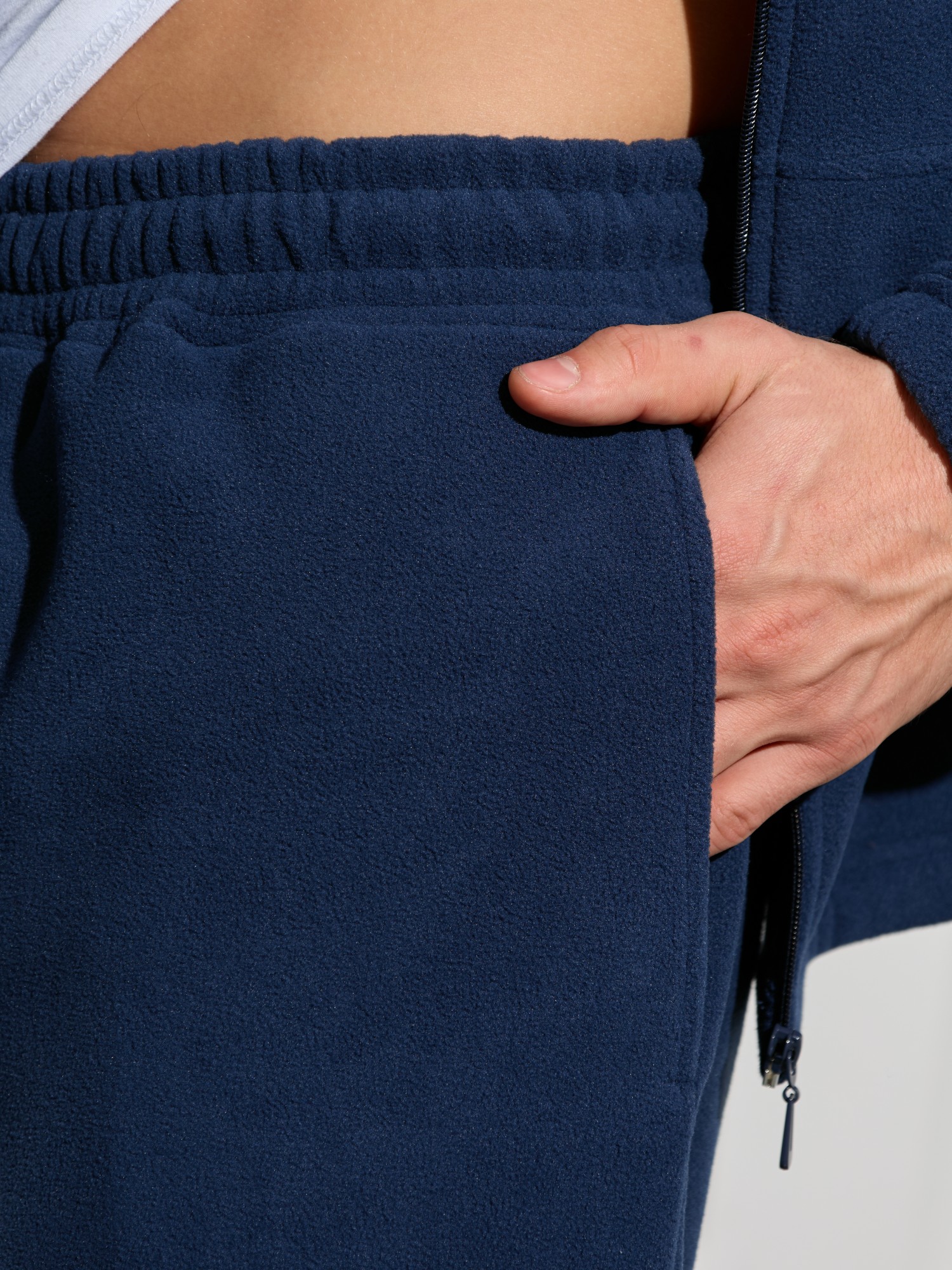 Брюки мужские из флиса, свободного покроя, на притачном поясе с эластичной тесьмой внутри, с карманами в боковых швах. С изнаночной стороны пояса вставлен шнурок для регулирования степени прилегания изделия по талии. Нижние срезы брюк обработаны подгибкой с эластичной тесьмой.
