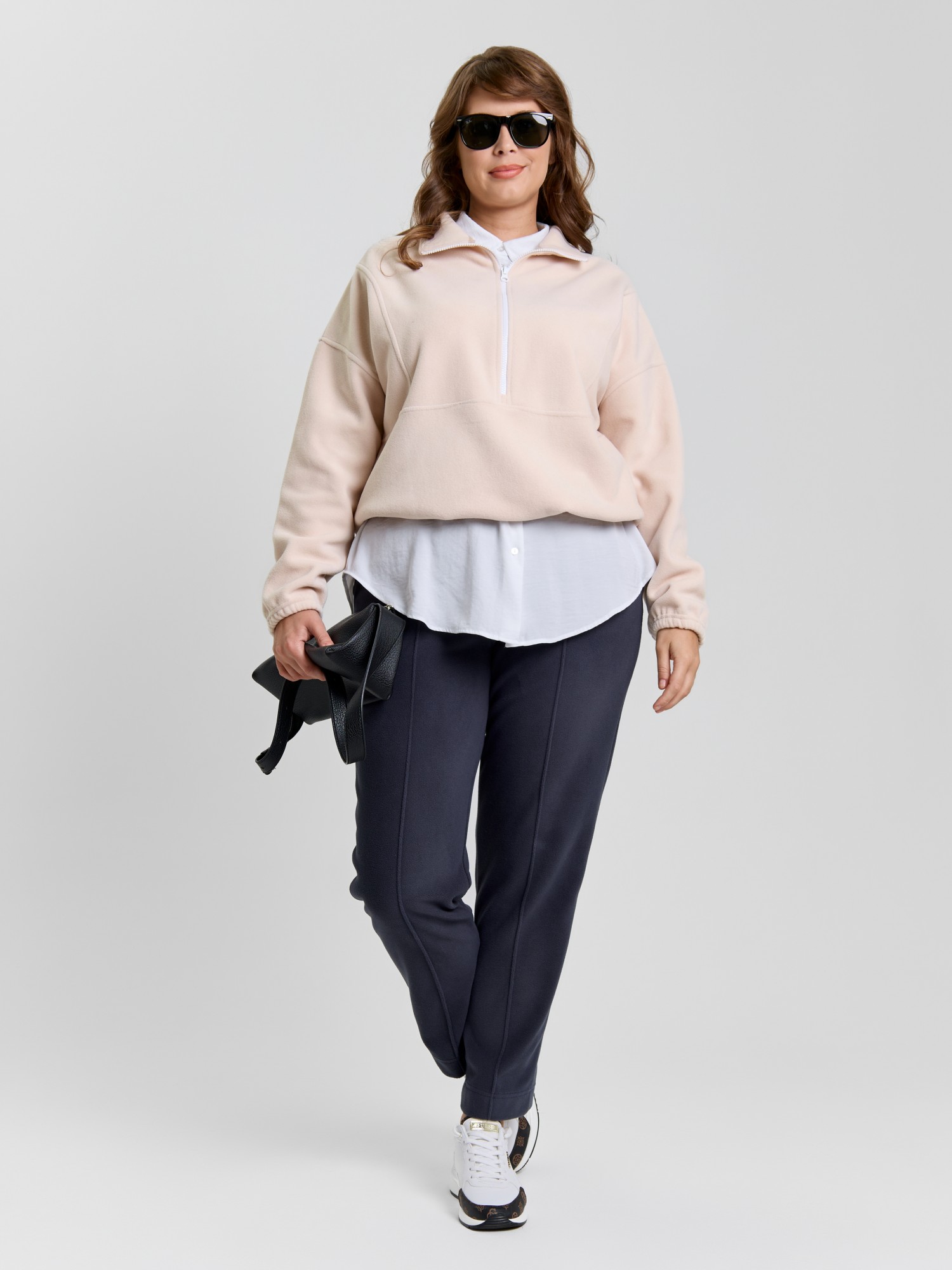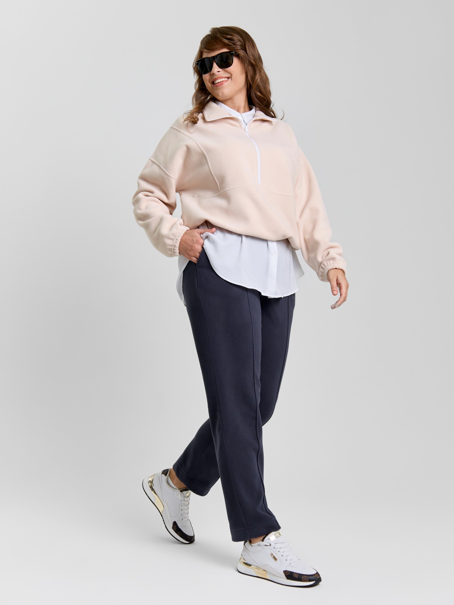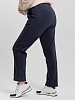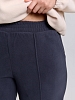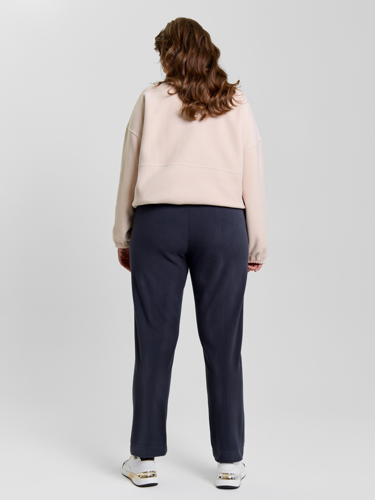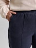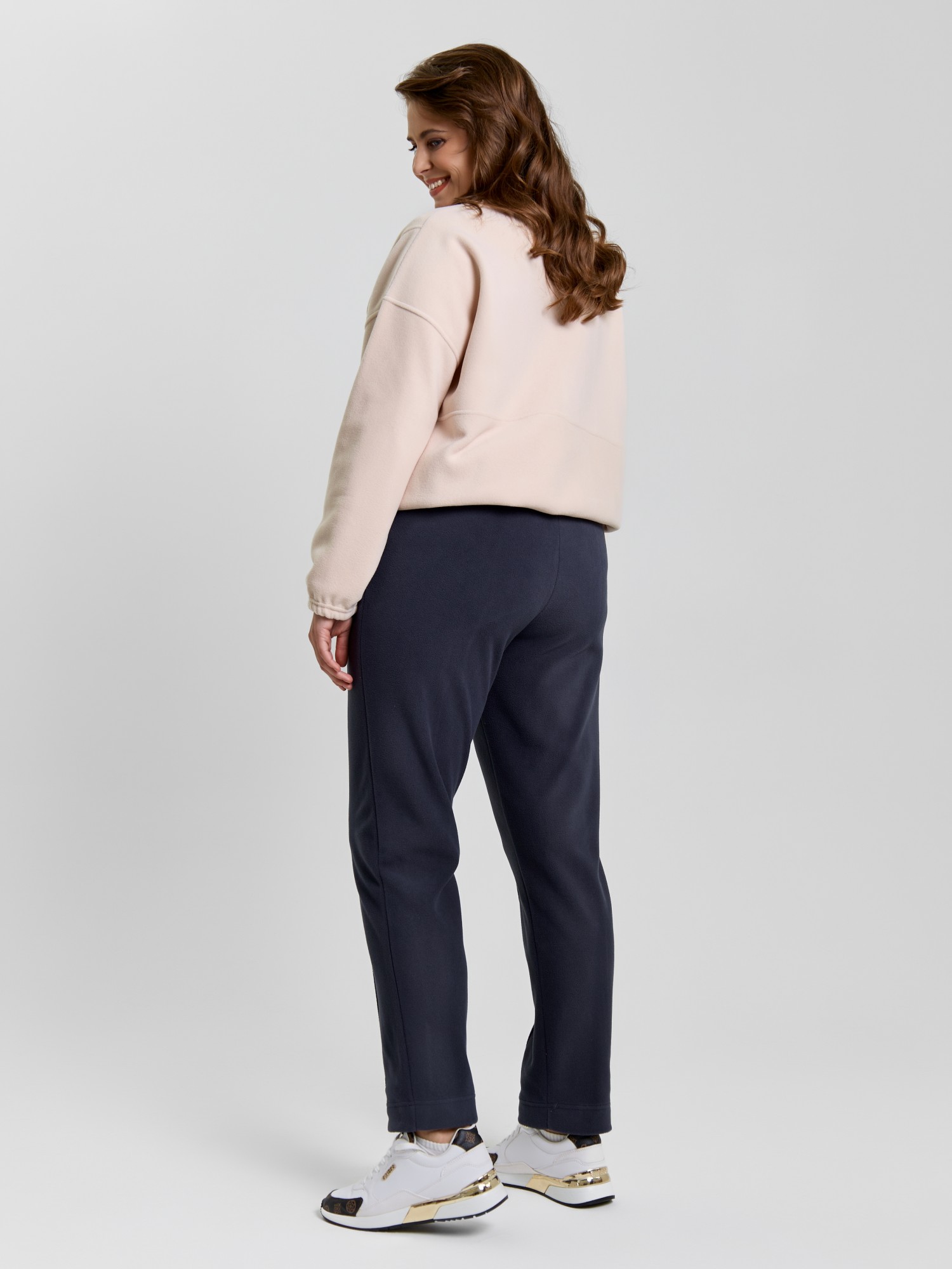 Брюки женские из гладкокрашенного трикотажного полотна «флис», длинные, полуприлегающего силуэта, на притачном поясе с эластичной тесьмой внутри и карманами в боковых швах. Передние половины застрочены по центральным линиям, низ обработан широкой подгибкой.