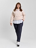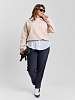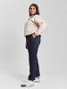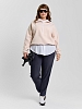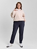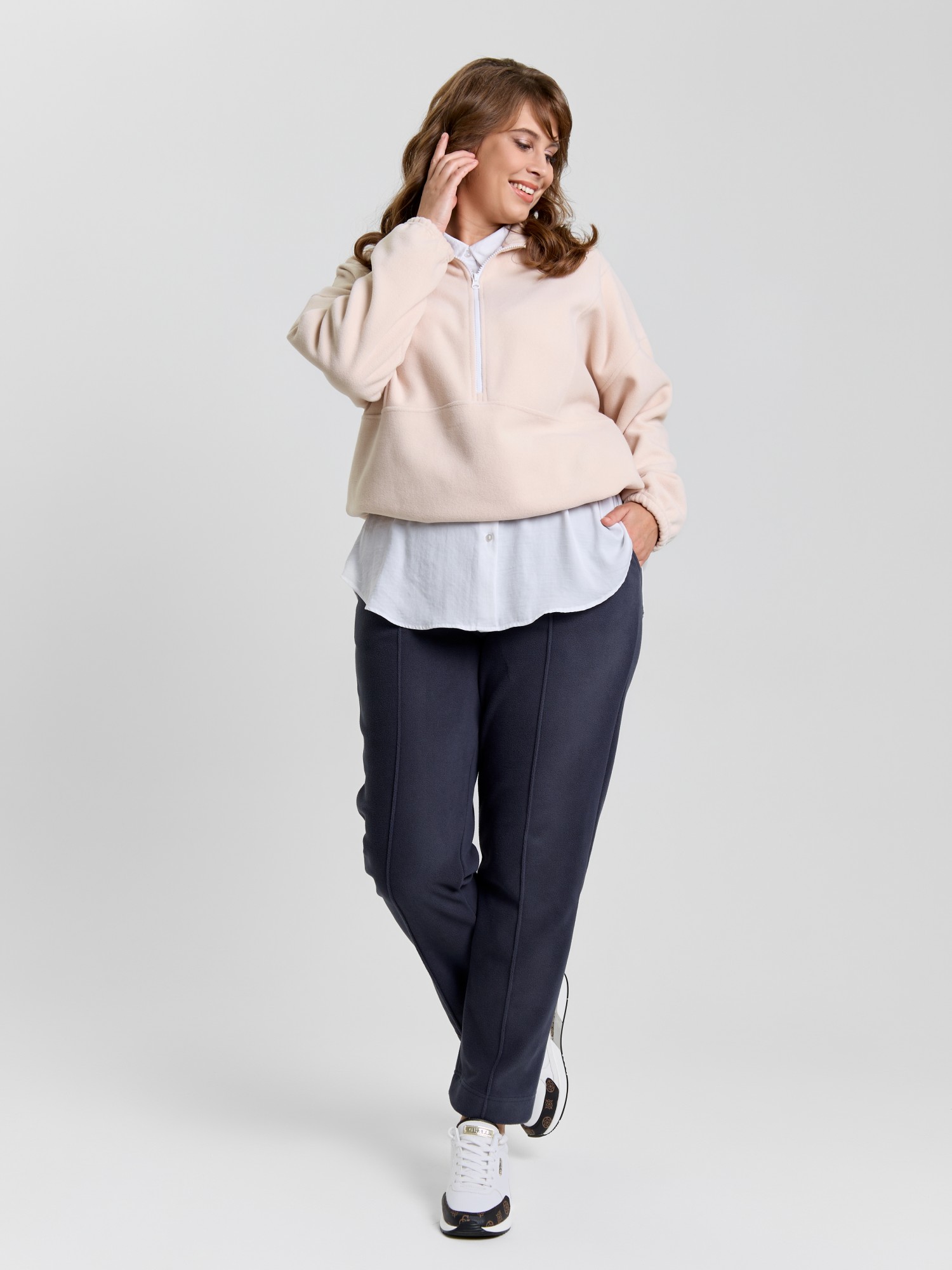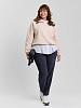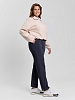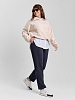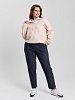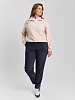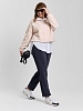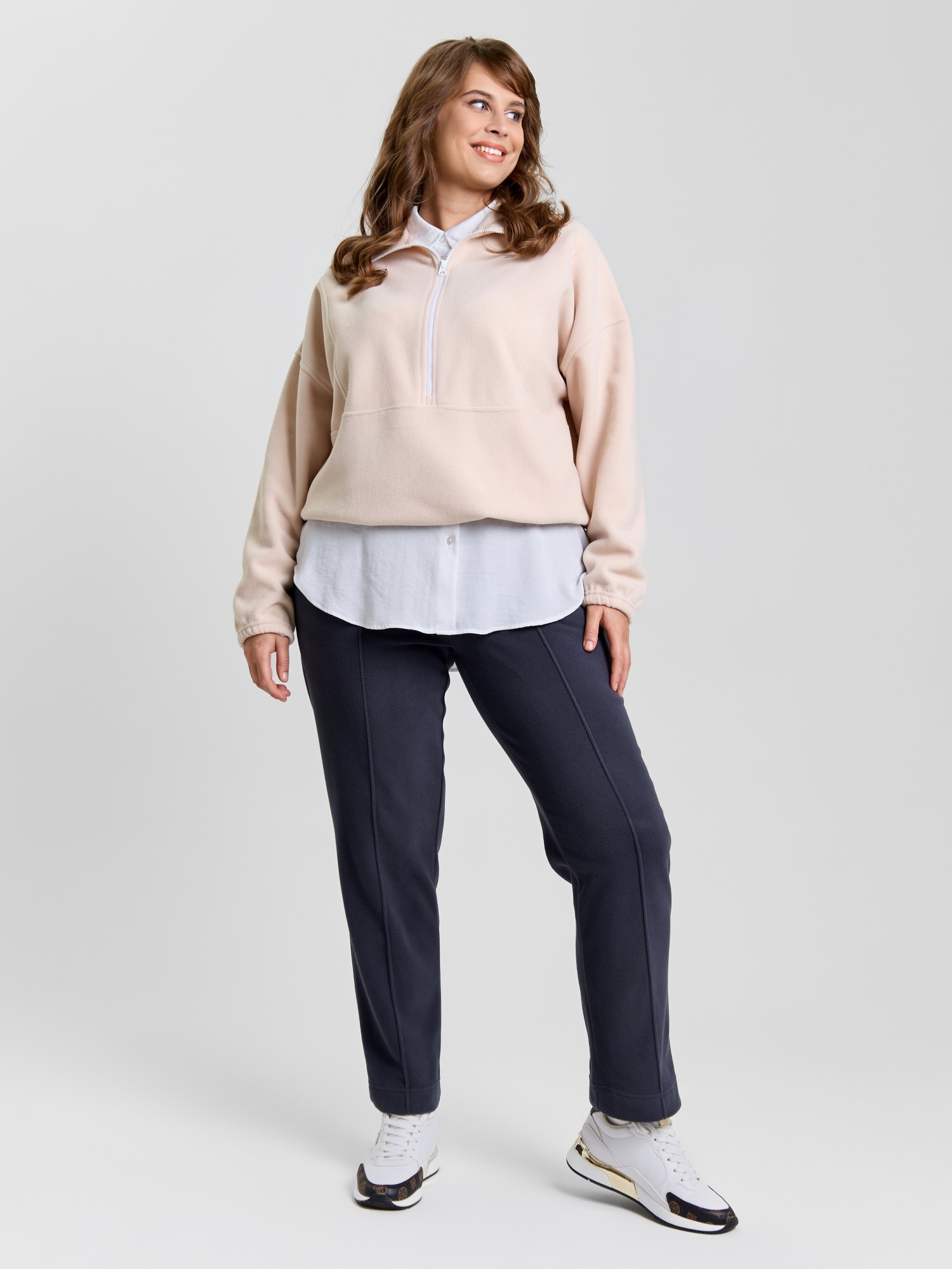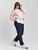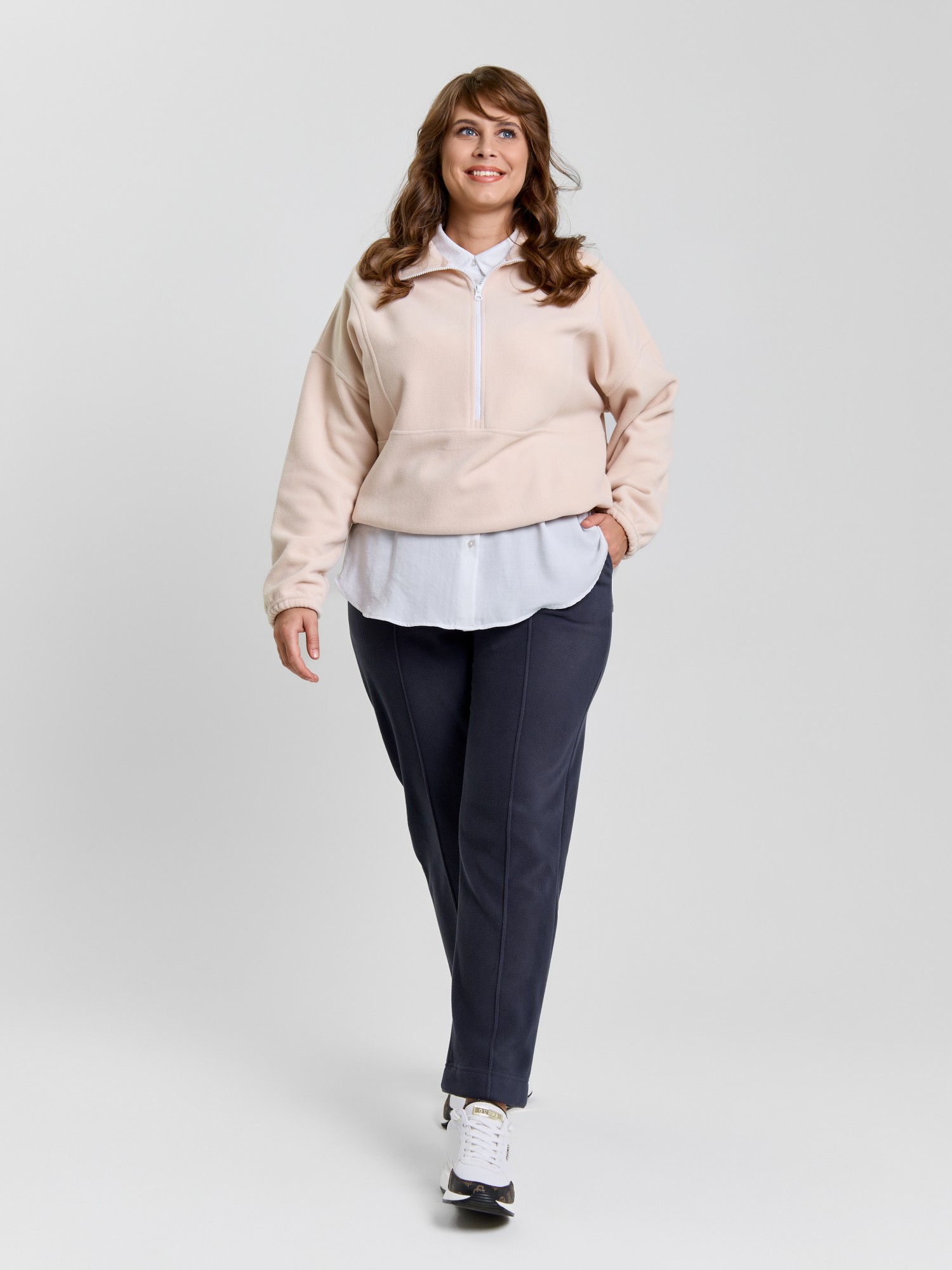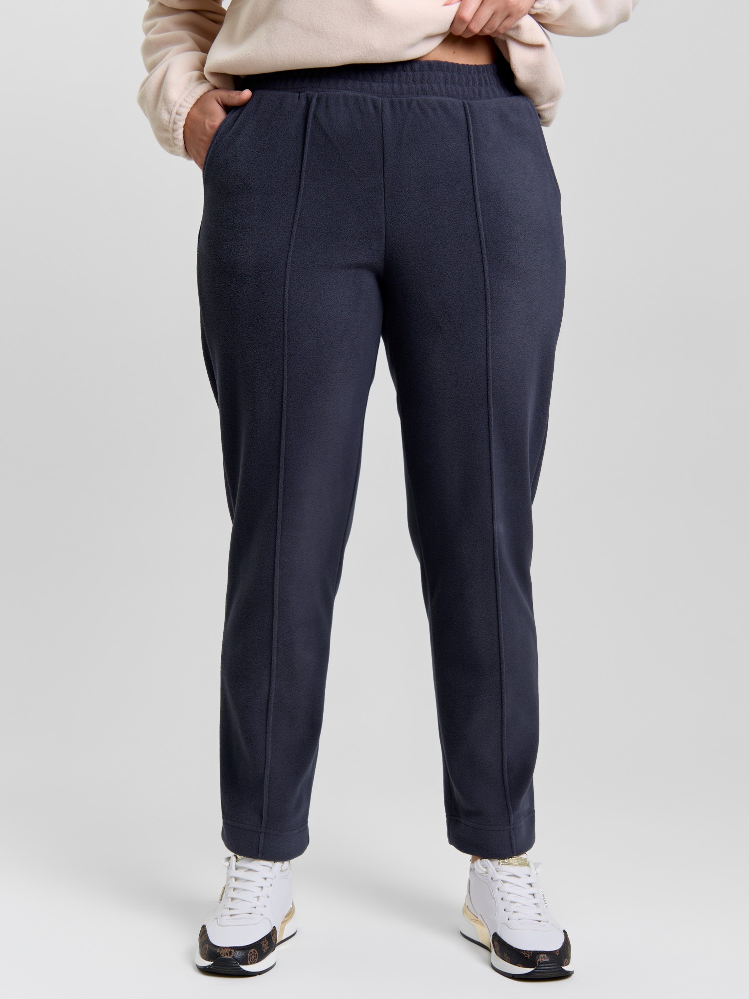 Брюки женские из гладкокрашенного трикотажного полотна «флис», длинные, полуприлегающего силуэта, на притачном поясе с эластичной тесьмой внутри и карманами в боковых швах. Передние половины застрочены по центральным линиям, низ обработан широкой подгибкой.