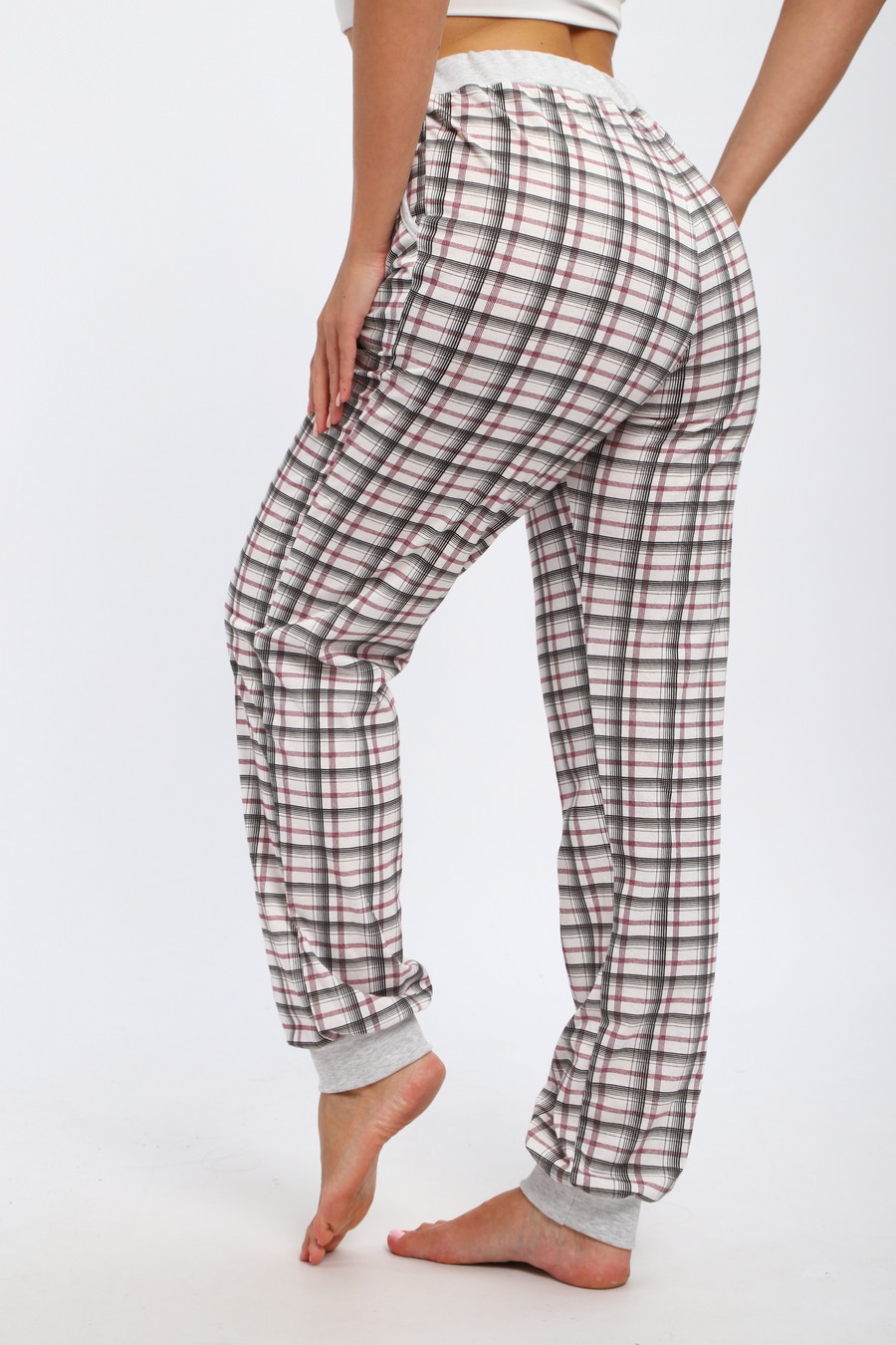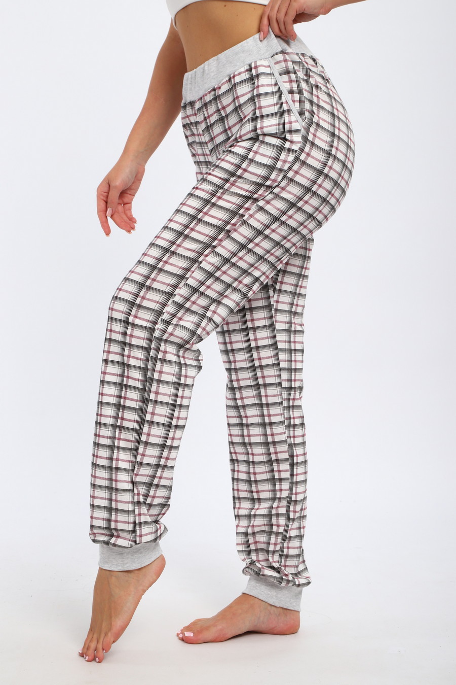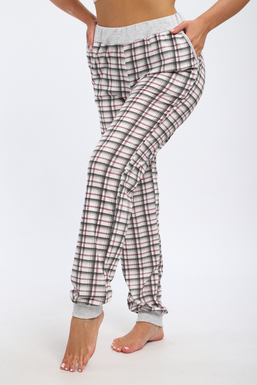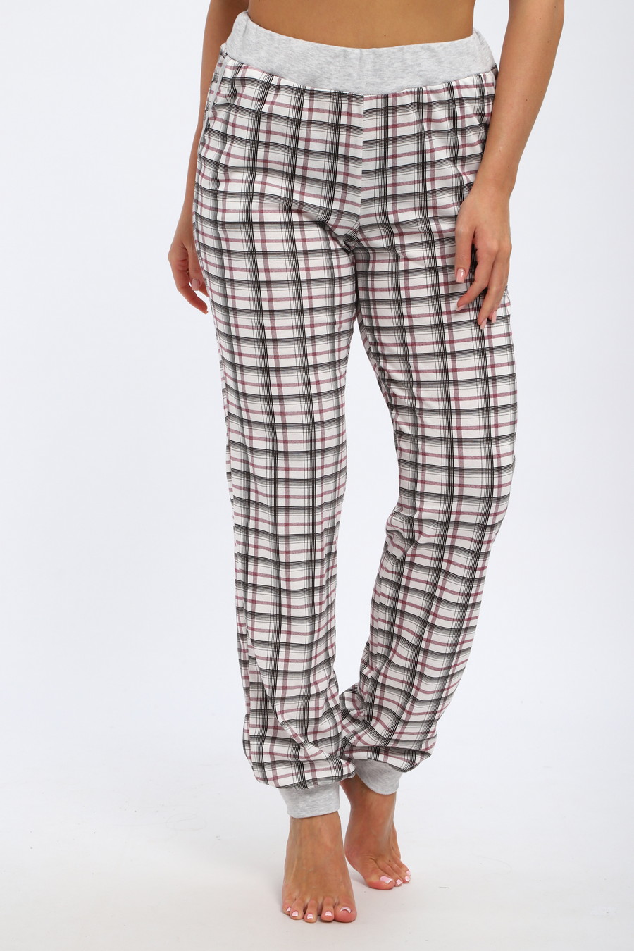 Брюки женские из кулирки на манжете / Клетка на белом