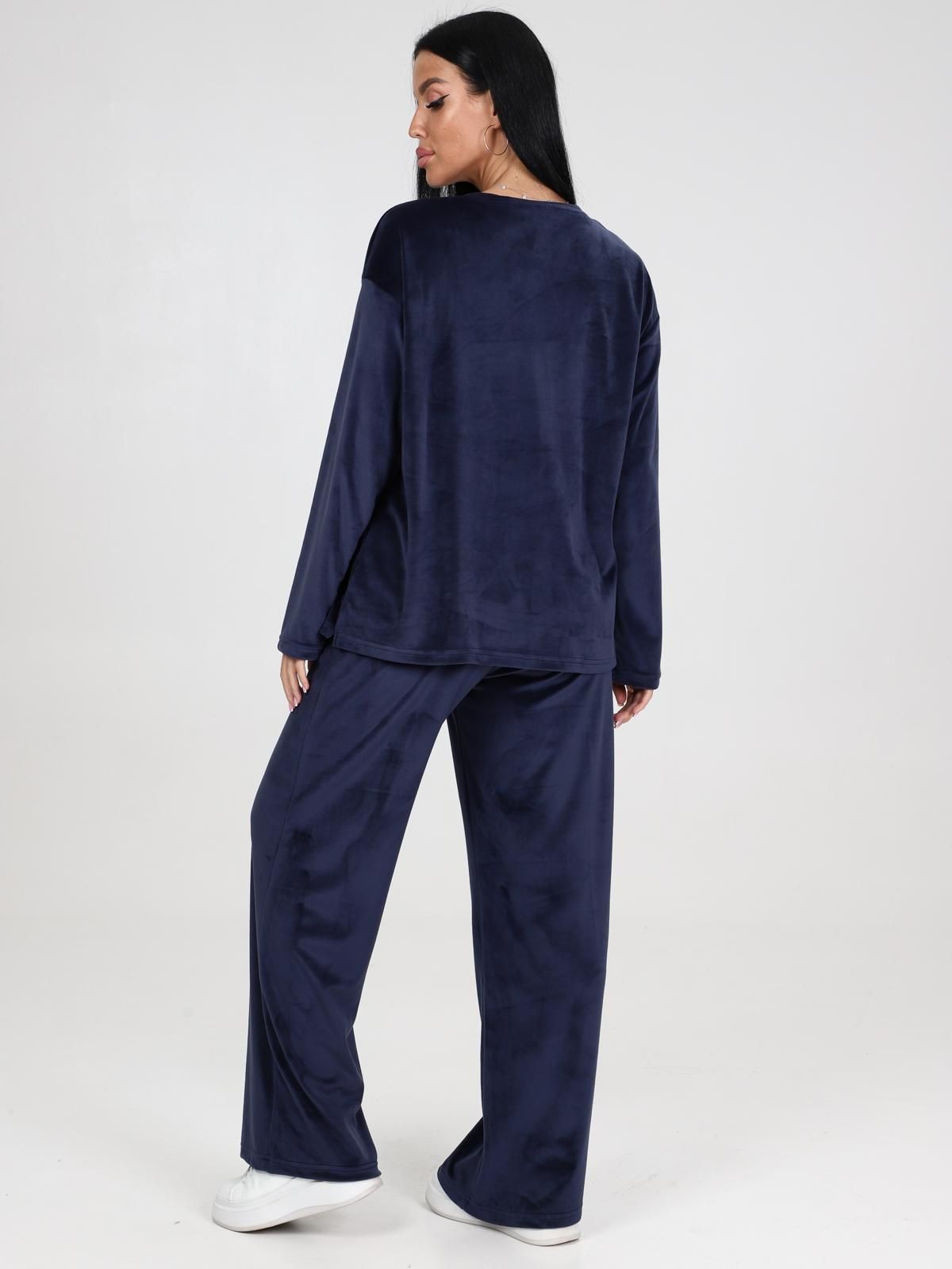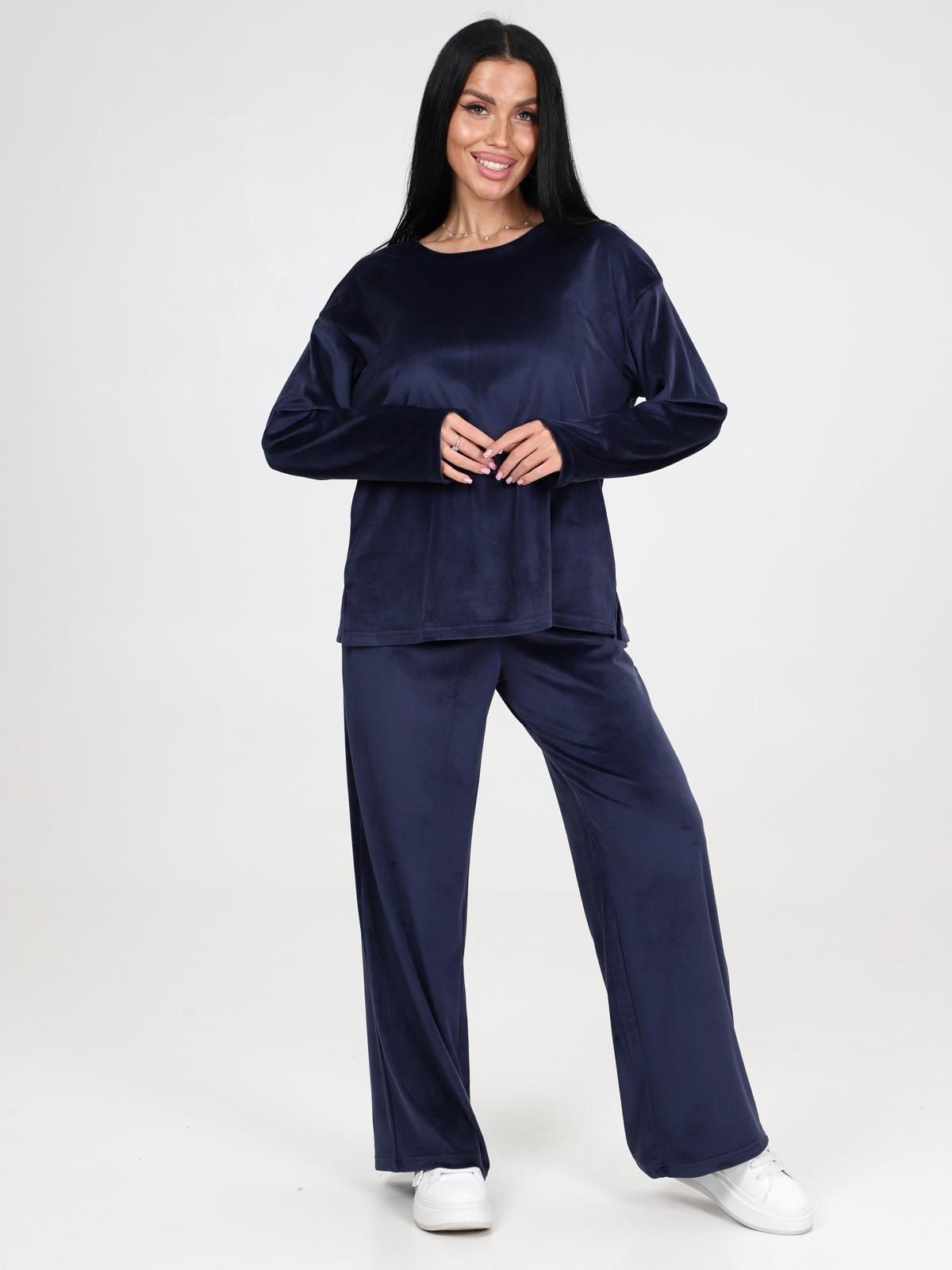 Женский велюровый костюм серого цвета, состоящий из свободного свитшота с длинными рукавами и брюк прямого кроя. Костюм выполнен из мягкого велюра, что делает его комфортным для повседневной носки, прогулок или домашнего отдыха.