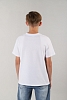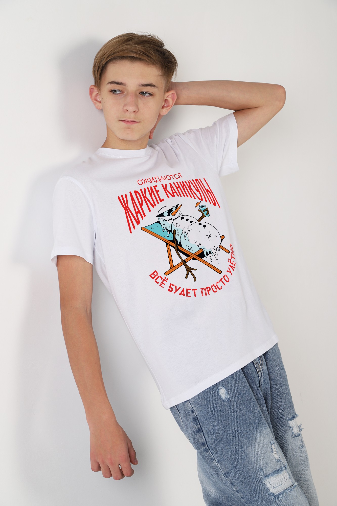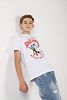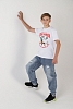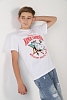 Футболка для мальчика классического покроя: с короткими втачными рукавами, горловиной овальной формы, обработанной втачной планкой, и принтом в центре переда, выполненным в технике шелкографии. По шву втачивания планки в горловину настрочена отделочная строчка на двухигольной машине. неижние срезы рукавов и изделия обработаны подгибкой.