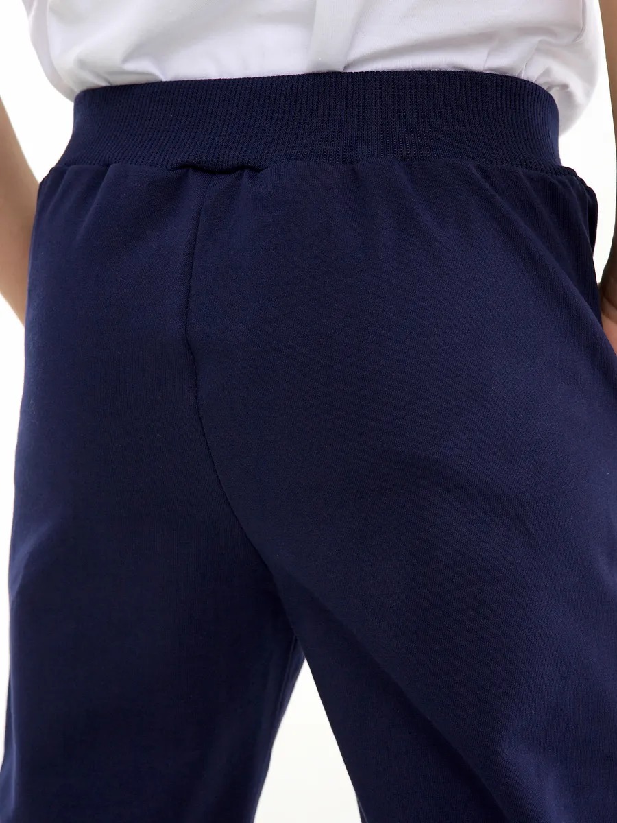 Эластичные волокна футера устойчивы к изнашиванию, не теряют цвет даже после многочисленных стирок. Модель брюк полуприлегающая с удобными карманами. Пояс выполнен из кашкорсе со свободной и эластичной резинкой на талии, что обеспечивает дополнительный комфорт и надежную посадку на талии ребёнка. Манжеты внизу брюк придают дополнительное удобство в носке, а также создают модные и зауженные линии. Оверсайз прямой фасон идеальная модель для любого случая
