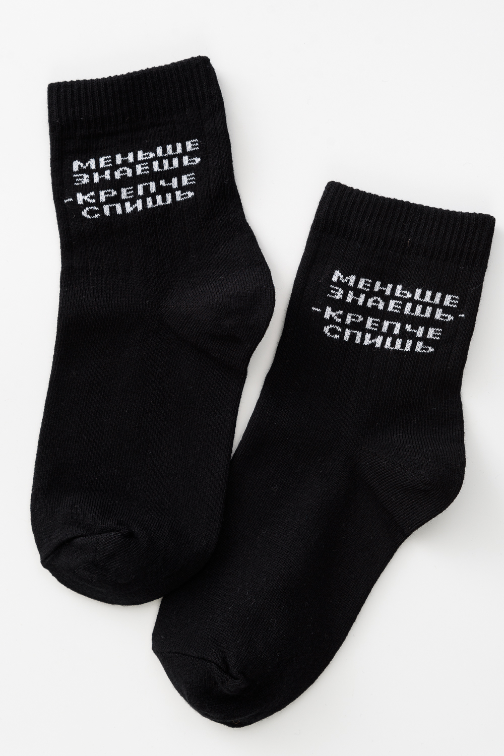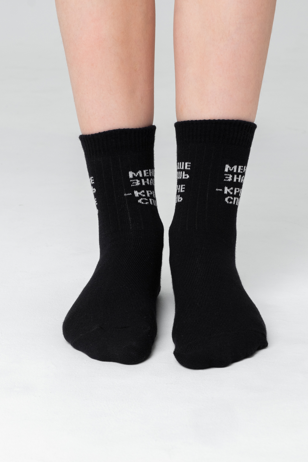 Подростковые носочки с надписью "Меньше знаешь - крепче спишь", связанные из натурального хлопка. Креативная модель мягко облегает ногу, не доставляя дискомфорт в течение всего дня. Носки сочетаются с разной обувью, подходят как мальчикам, так и девочкам.