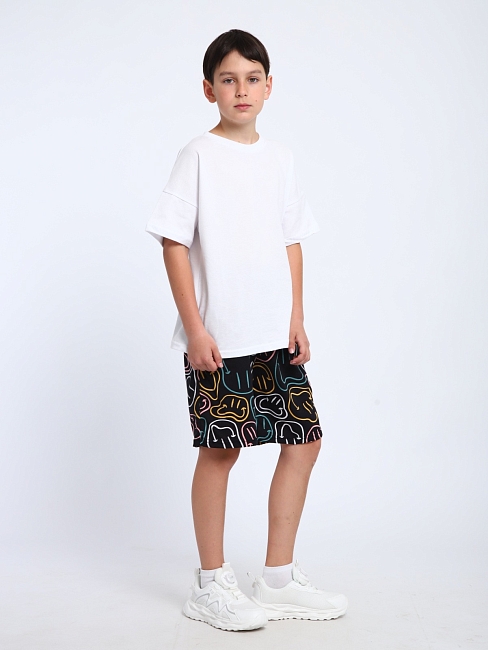 Летние легкие шорты "Федор" / Черный смайл для мальчиков-подростков с ярким молодежным принтом. Крой широкий свободный до колен с удобными кармашки в боковых швах. Пояс на комфортной широкой резинке.