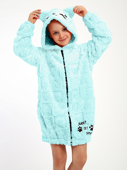 Халат на молнии домашний "Мурлыка" / Бирюза – это идеальный выбор для девочек, предпочитающих комфорт и стиль в повседневной жизни. Этот халат выполнен из мягкого и теплого полиэстера, который обеспечивает уютное ощущение при носке. Халат из материала велсофт имеет длинные рукава прямого покроя и удобные карманы в боковых швах, что делает его идеальным для использования как дома, так и во время спортивных занятий.