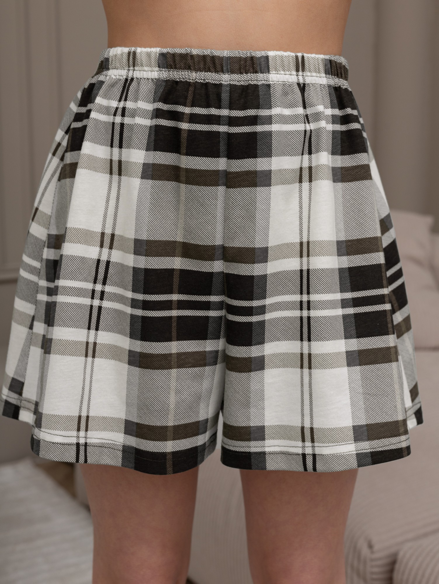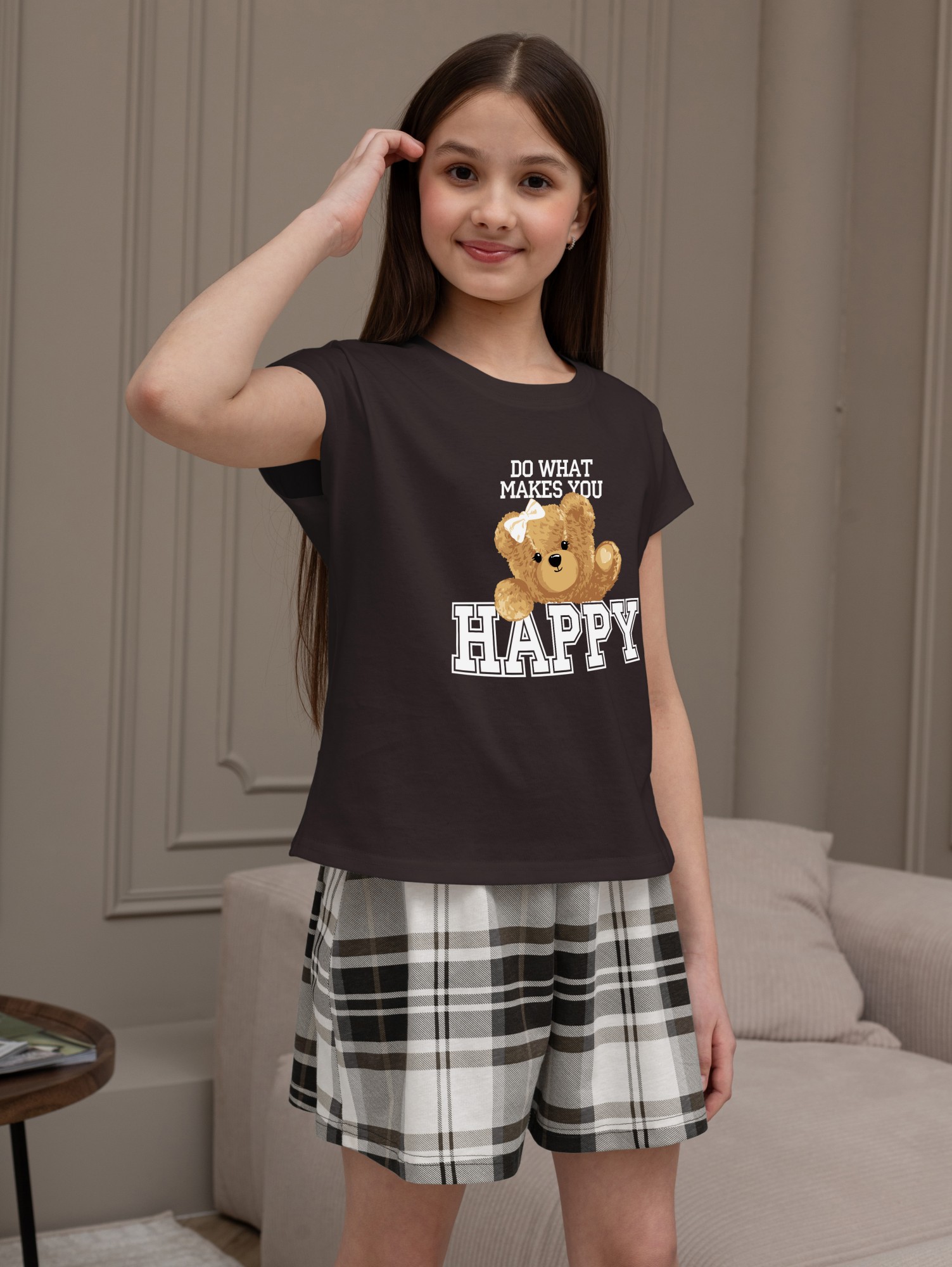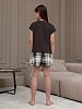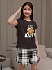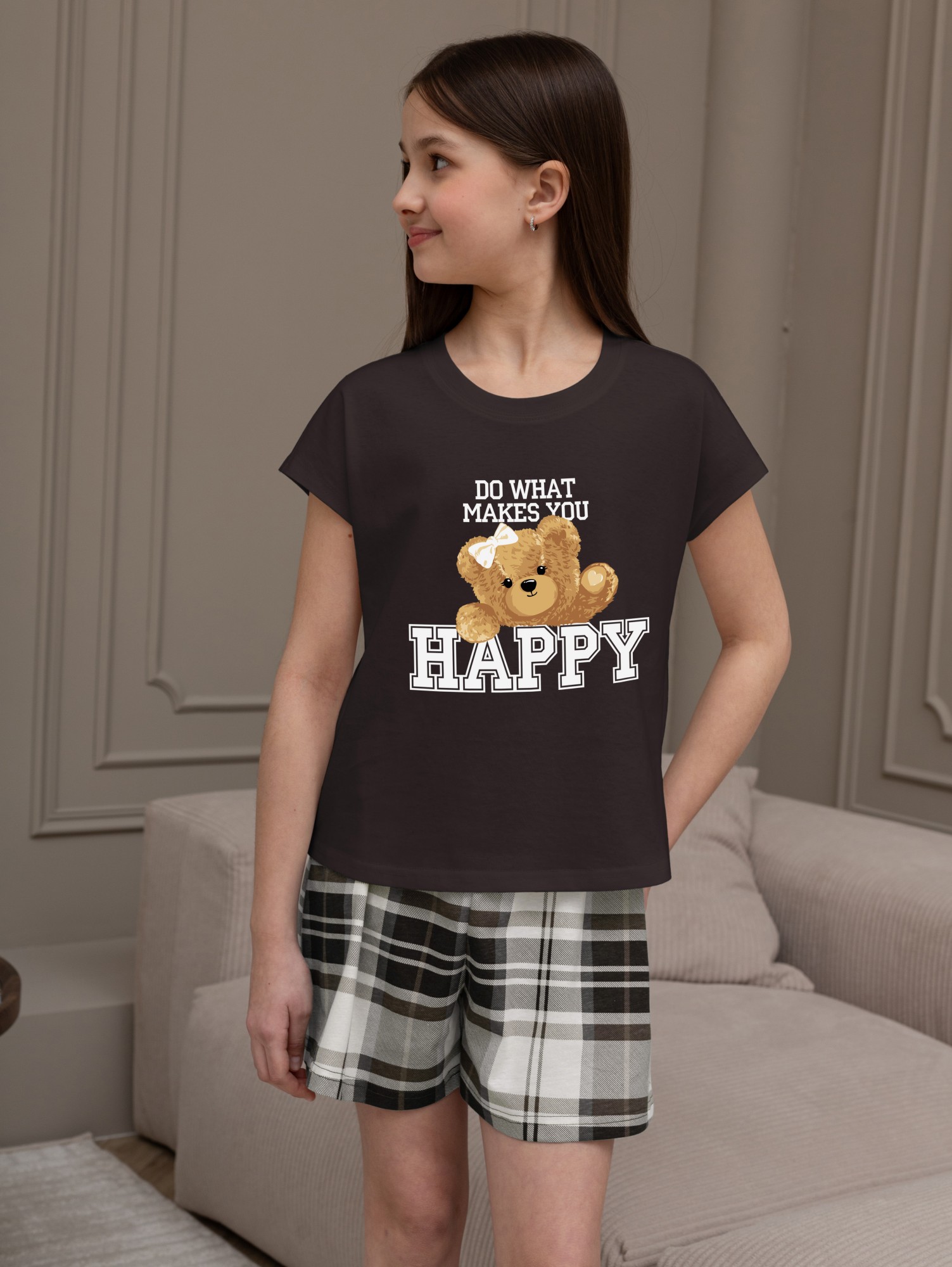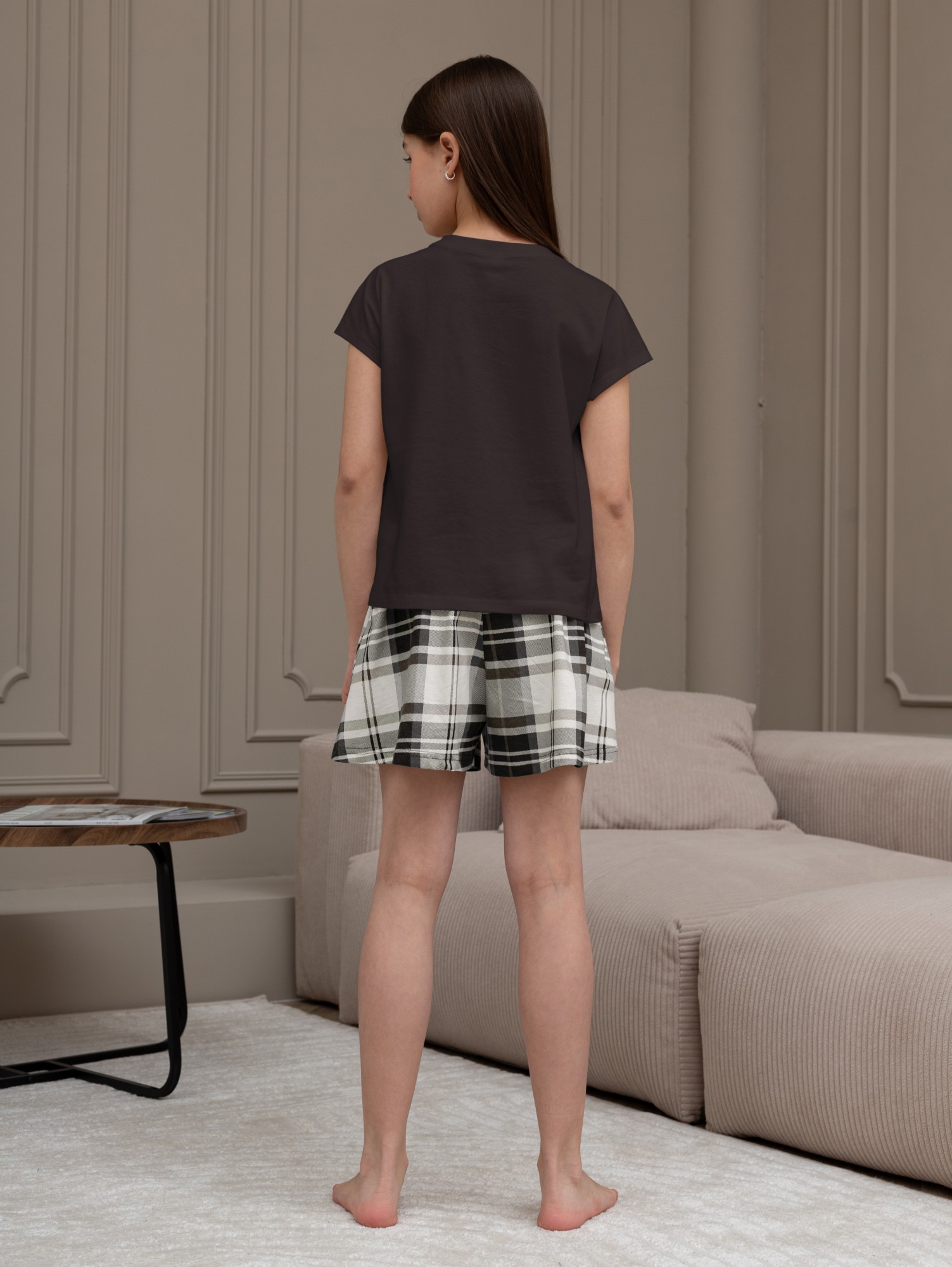 Костюм для девочки из трикотажного полотна "кулирка" в комбинации двух видов: гладкокрашеного и набивного с тематическим рисунком, состоящий из футболки и шорт. Футболка из гладкокрашеного полотна, с цельнокроеными короткими рукавами, горловиной овальной формы, обработанной втачной планкой и отделочной строчкой. В центре переда - принт, выполненный в технике шелкографии. Шорты из полотна с набивным рисунком, свободного силуэта, на цельнокроеном поясе с эластичной тесьмой внутри.