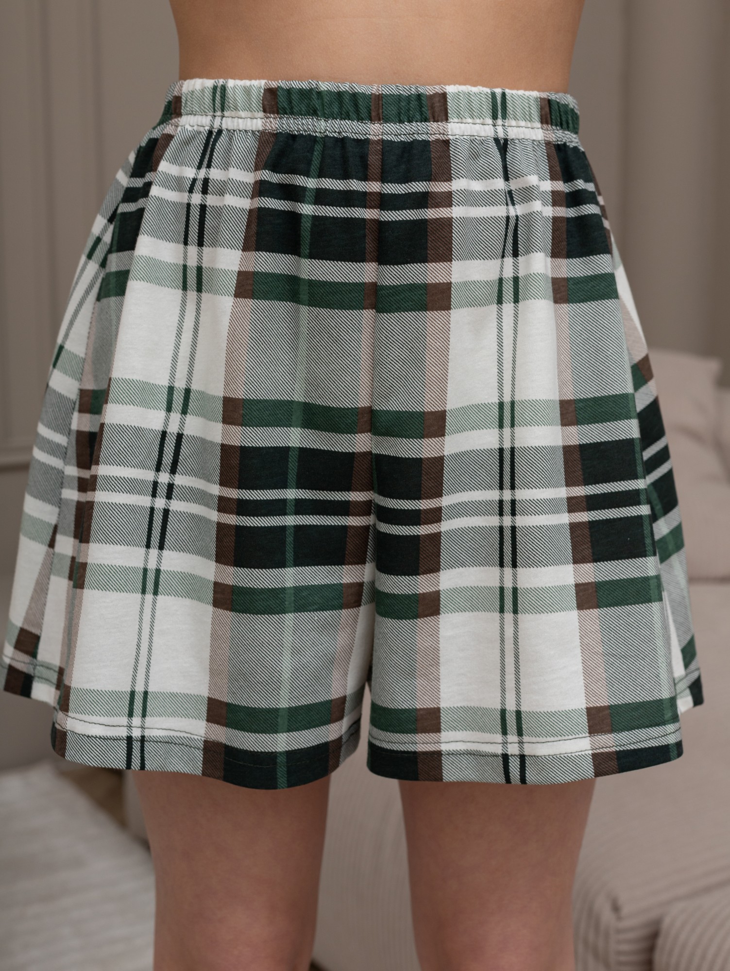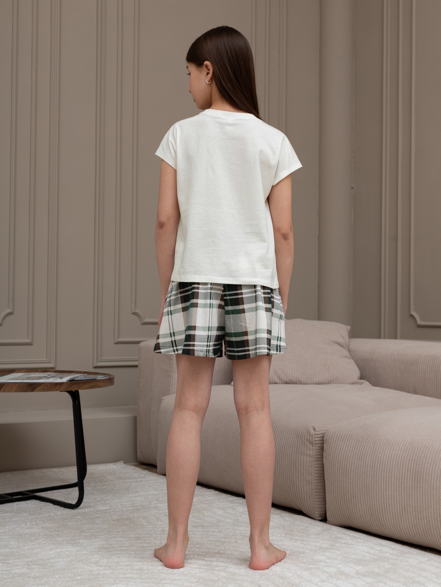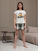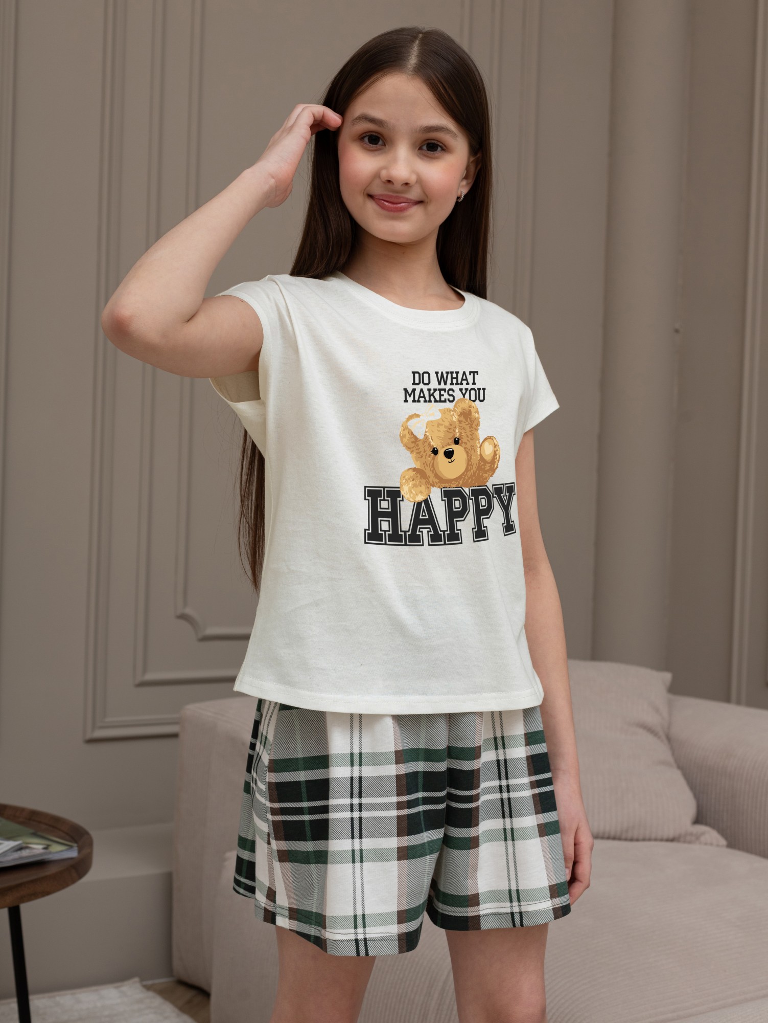 Костюм для девочки из трикотажного полотна "кулирка" в комбинации двух видов: гладкокрашеного и набивного с тематическим рисунком, состоящий из футболки и шорт. Футболка из гладкокрашеного полотна, с цельнокроеными короткими рукавами, горловиной овальной формы, обработанной втачной планкой и отделочной строчкой. В центре переда - принт, выполненный в технике шелкографии. Шорты из полотна с набивным рисунком, свободного силуэта, на цельнокроеном поясе с эластичной тесьмой внутри.