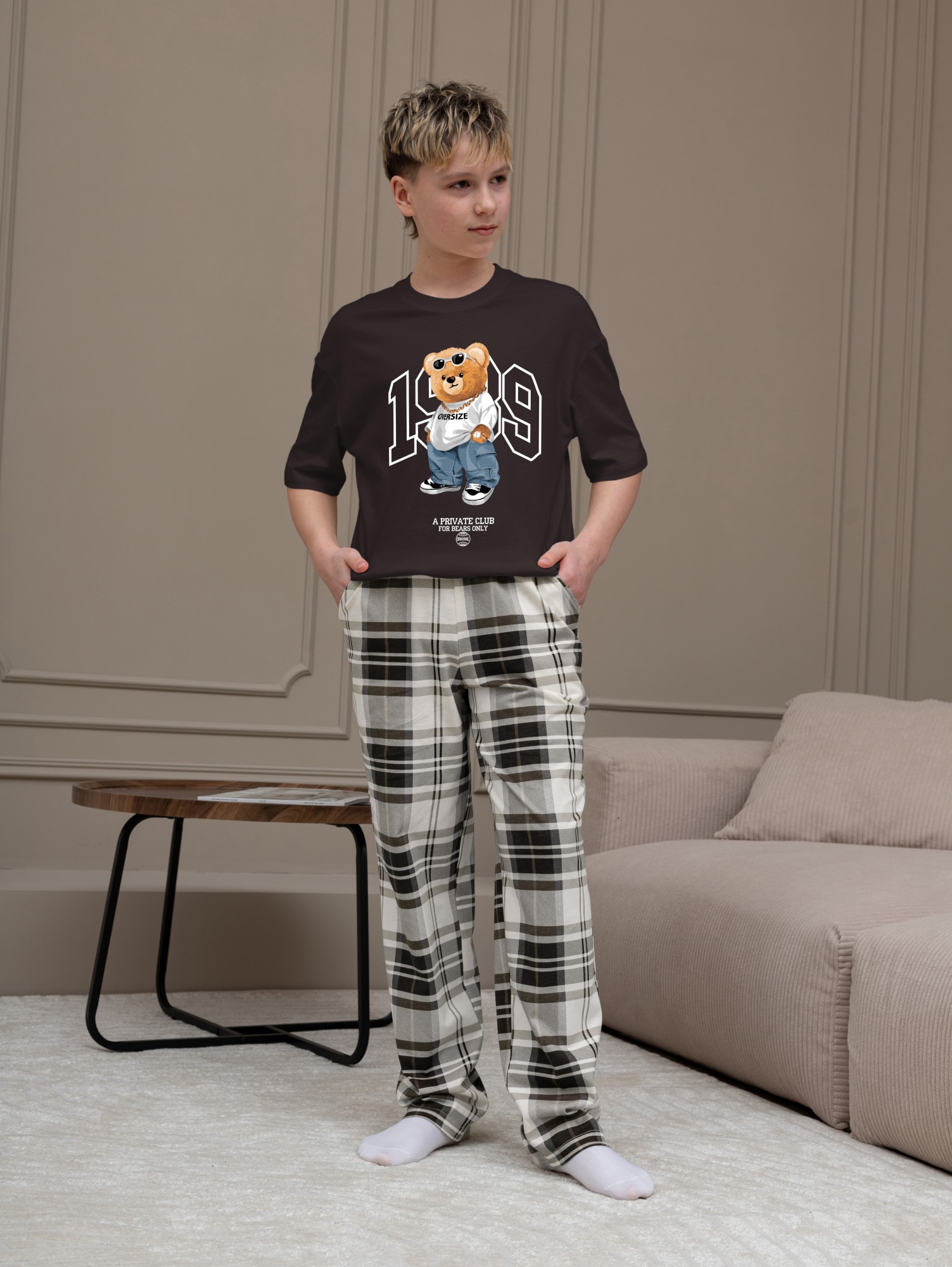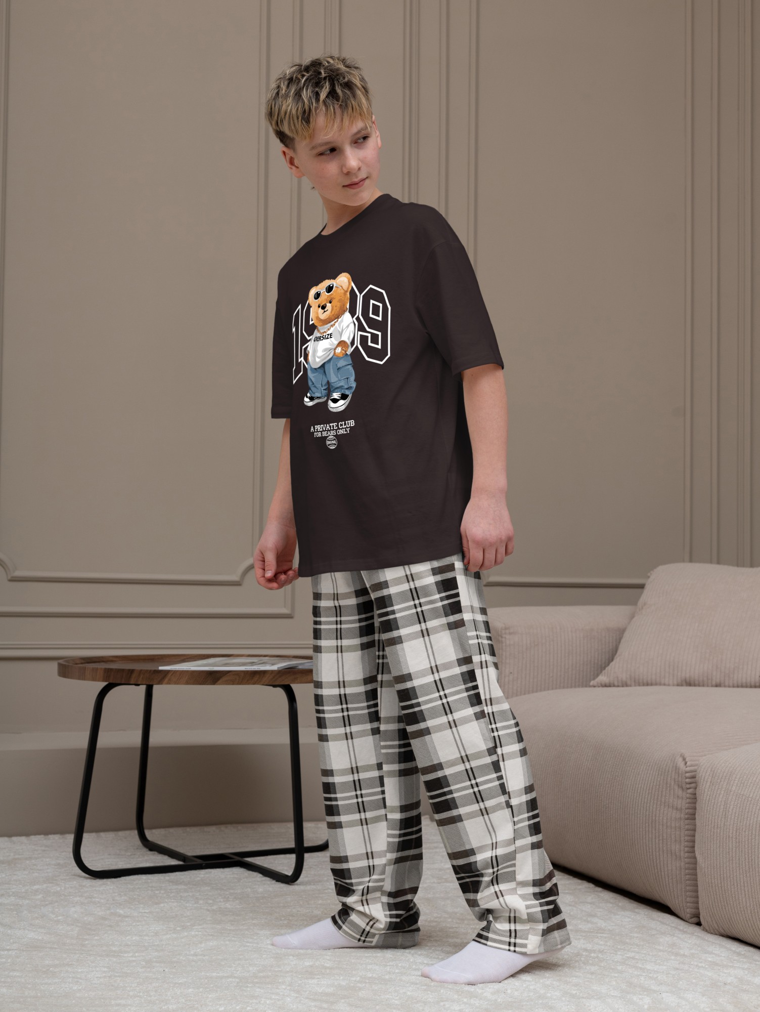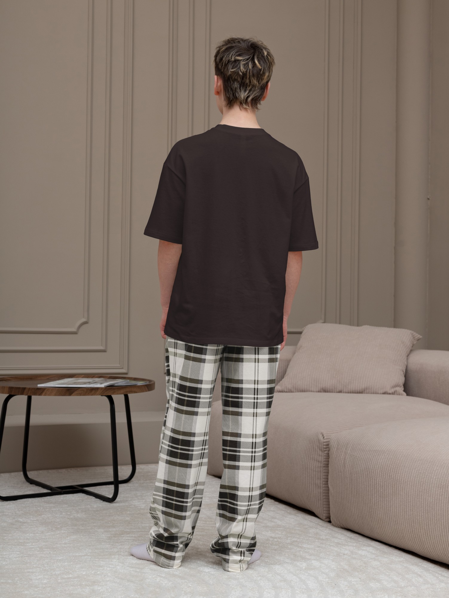 Костюм для мальчика, состоящий из футболки и брюк. Футболка однотонная с принтом на груди; модель свободная, со спущенной линией плеч, втачными короткими рукавами и овальным вырезом горловины. Брюки из полотна с набивным рисунком эксклюзивного дизайна, прямые, с боковыми карманами с обтачными входами, на притачном поясе с отстроченной эластичной тесьмой.