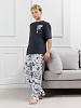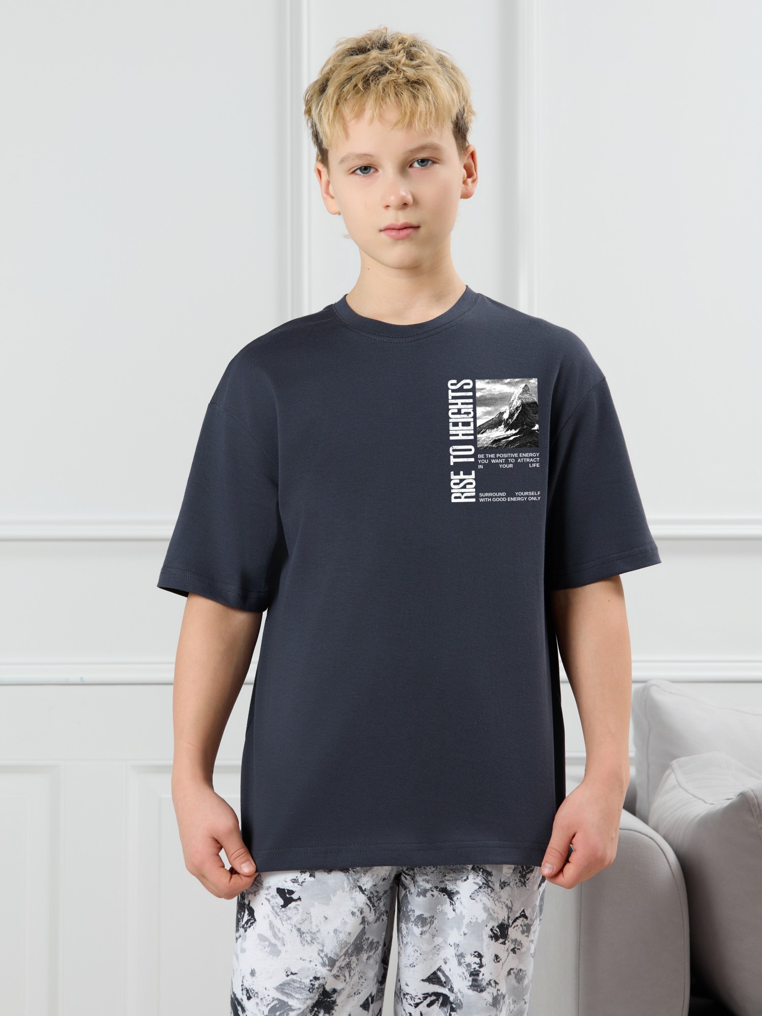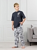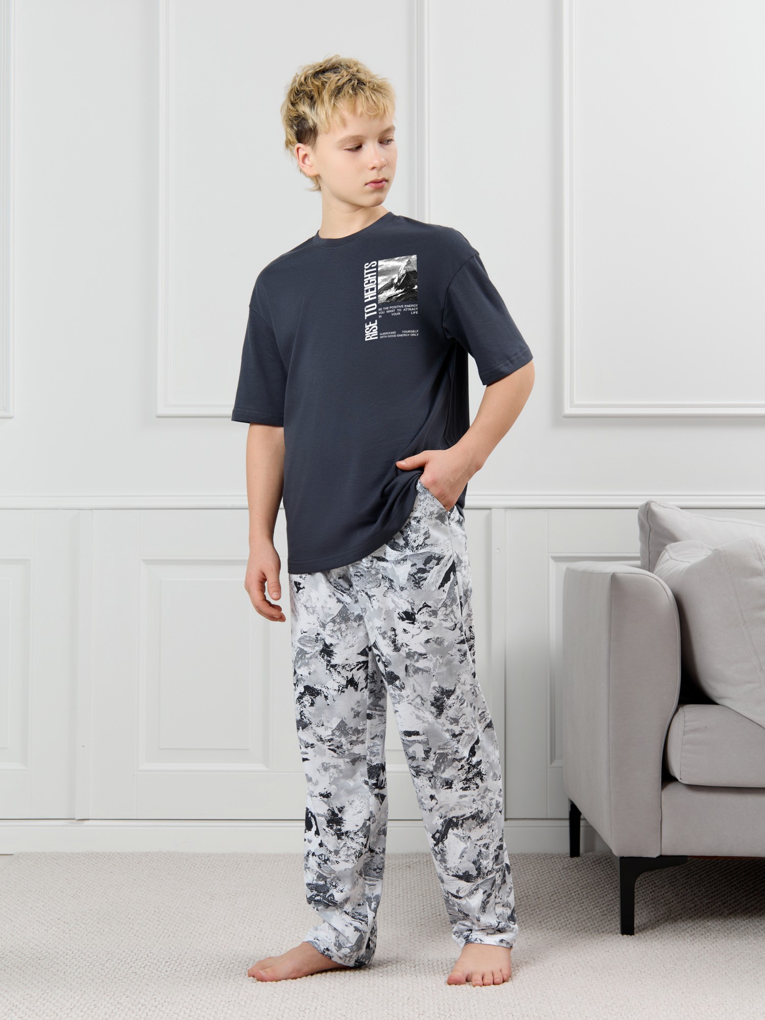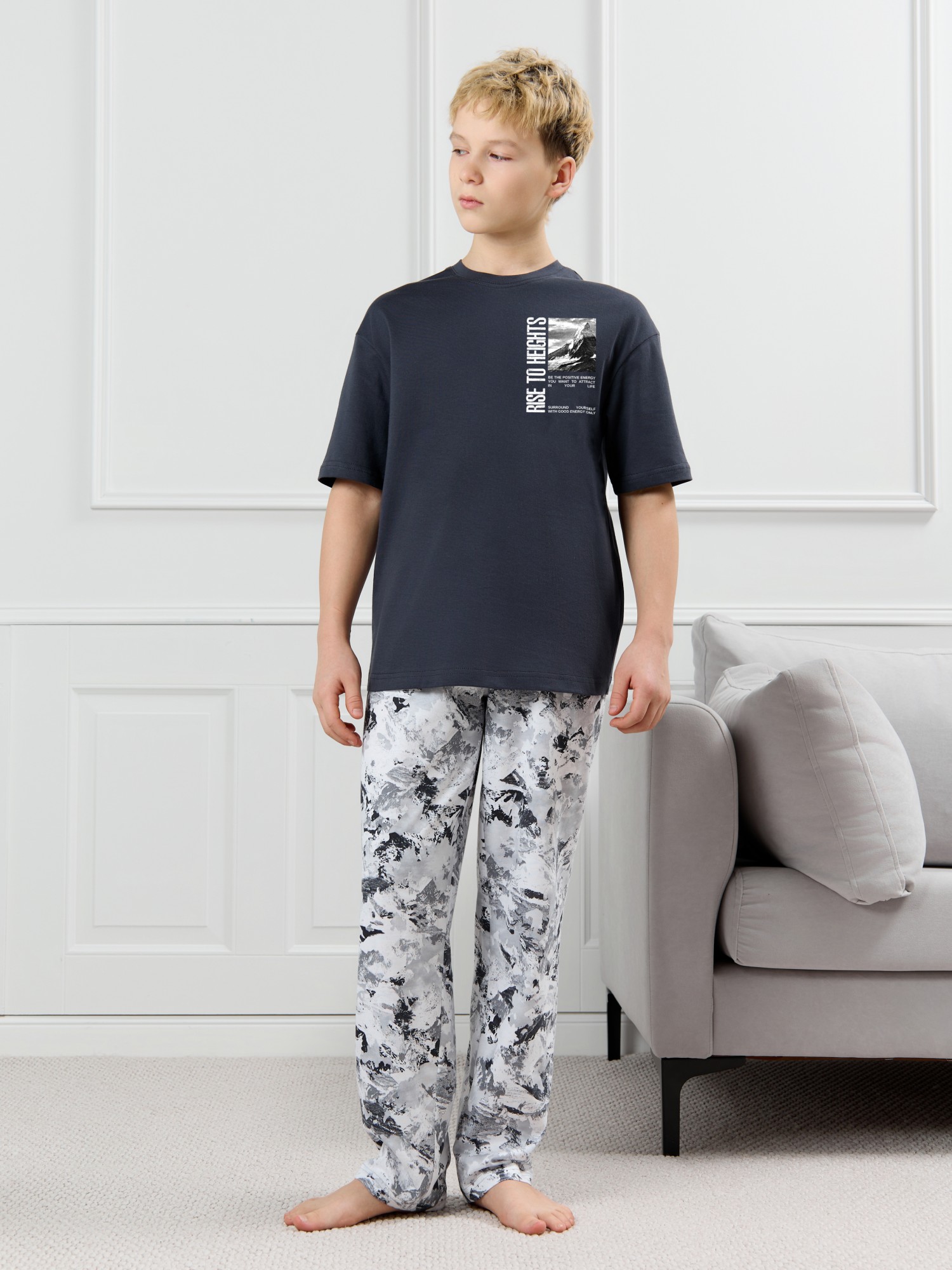 Костюм для мальчика, состоящий из футболки и брюк. Футболка однотонная с принтом на груди; модель свободная, со спущенной линией плеч, овальным вырезом горловины. Брюки из полотна с набивным рисунком эксклюзивного дизайна, прямые, с боковыми карманами с обтачными входами, на притачном поясе с отстроченной эластичной тесьмой.