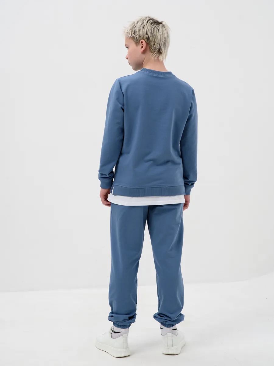 Костюм для мальчика "Отдых" / Серо-голубой имеет лаконичную и минималистичную форму, состоящую из двух элементов: свитшота и брюк, превосходного качества, создает современный образ. Брюки имеют прямой крой, а свитшот слегка удлинен, что создает современный акцент. На свитшоте присутствует декоративная нашивка с логотипом бренда. Имитация белой футболки, выглядывающая из-под свитшота, добавляет многослойности образу. Манжеты на рукавах и штанах выполнены из эластичного материала, что обеспечивает плотное прилегание, контрастная белая вставка (имитация футболки) добавляет свежести. Логотип бренда на нашивке выполнен в минималистичном стиле, что подчеркивает современность дизайна. Подростковый спортивный костюм для мальчика может стать хорошим вариантом для прогулок и тренировок.
