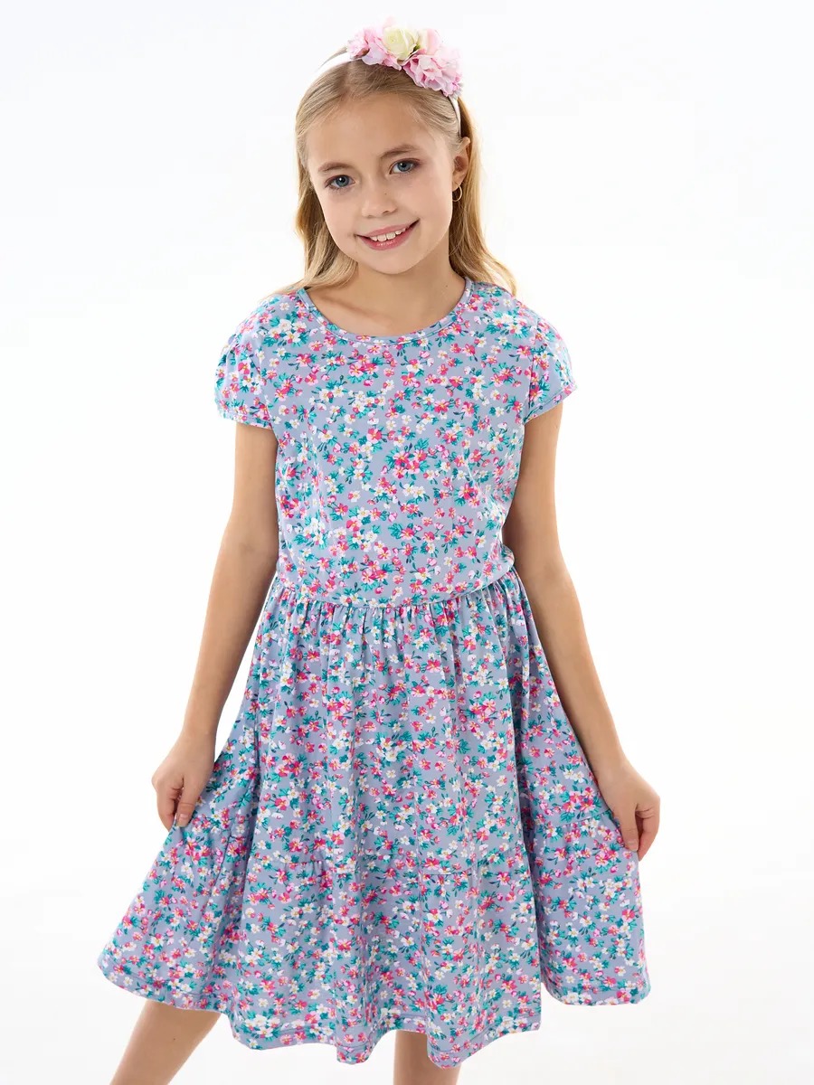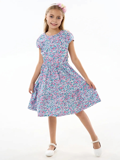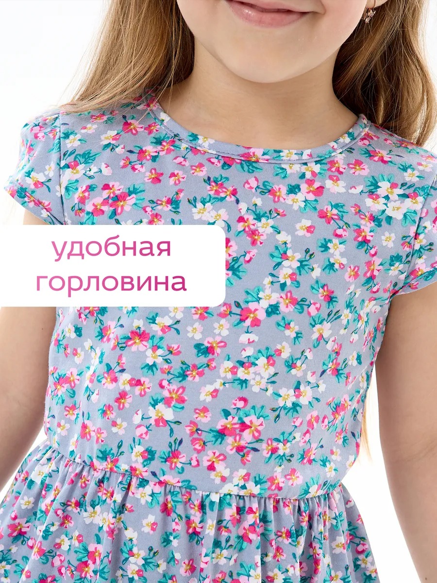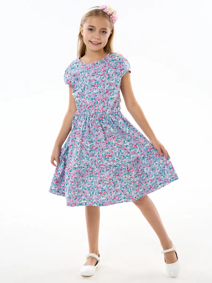 Легкое платье для девочки, удобное в носке, отлично подходит для прогулок в теплую погоду летом и на любое мероприетие. Платьишко выглядит просто и одновременно роскошно благодаря яркой расцветке в мелкий нежный цветочек, удобному крою и летящей юбке с оборкой. Летнее платье с короткими рукавами из качественного хлопкового трикотажа. Платье с юбкой имеет свободный покрой со средней талией на эластичной потайной резиночке, поэтому подходит как для стройных, так и на пухленьких девочек. У платья рукав фонарик и длина ниже колена. Стильное свободное платье для девочки - универсальный вариант как на каждый день, так и на праздник или для танцев.