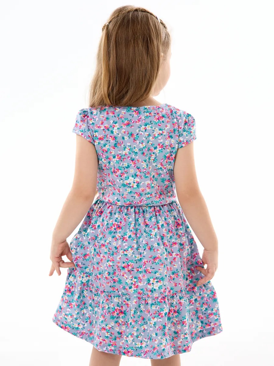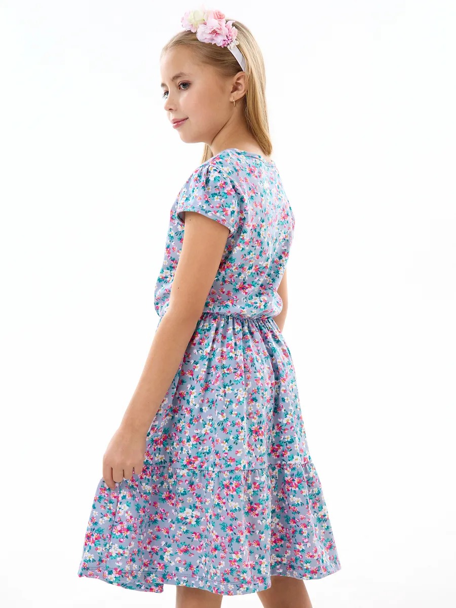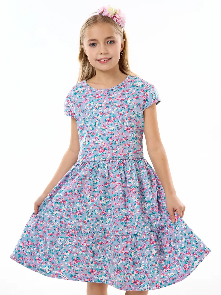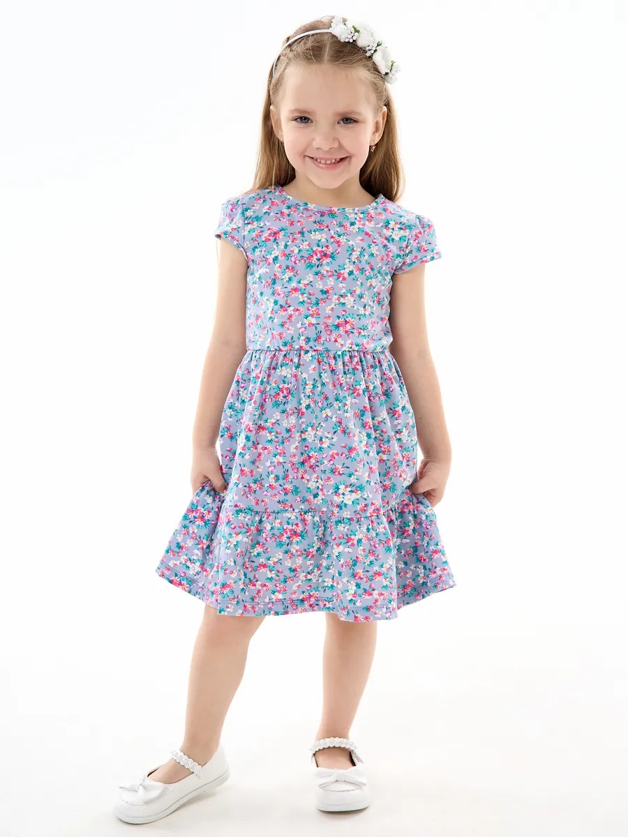 Легкое платье для девочки, удобное в носке, отлично подходит для прогулок в теплую погоду летом и на любое мероприетие. Платьишко выглядит просто и одновременно роскошно благодаря яркой расцветке в мелкий нежный цветочек, удобному крою и летящей юбке с оборкой. Летнее платье с короткими рукавами из качественного хлопкового трикотажа. Платье с юбкой имеет свободный покрой со средней талией на эластичной потайной резиночке, поэтому подходит как для стройных, так и на пухленьких девочек. У платья рукав фонарик и длина ниже колена. Стильное свободное платье для девочки - универсальный вариант как на каждый день, так и на праздник или для танцев.