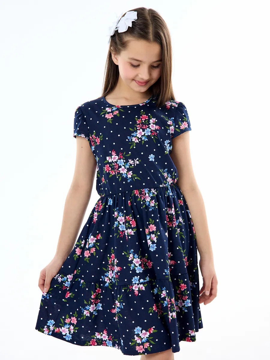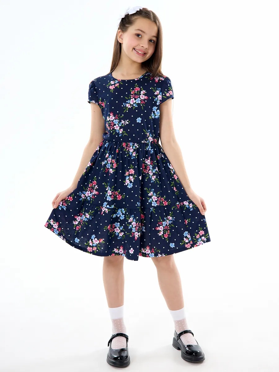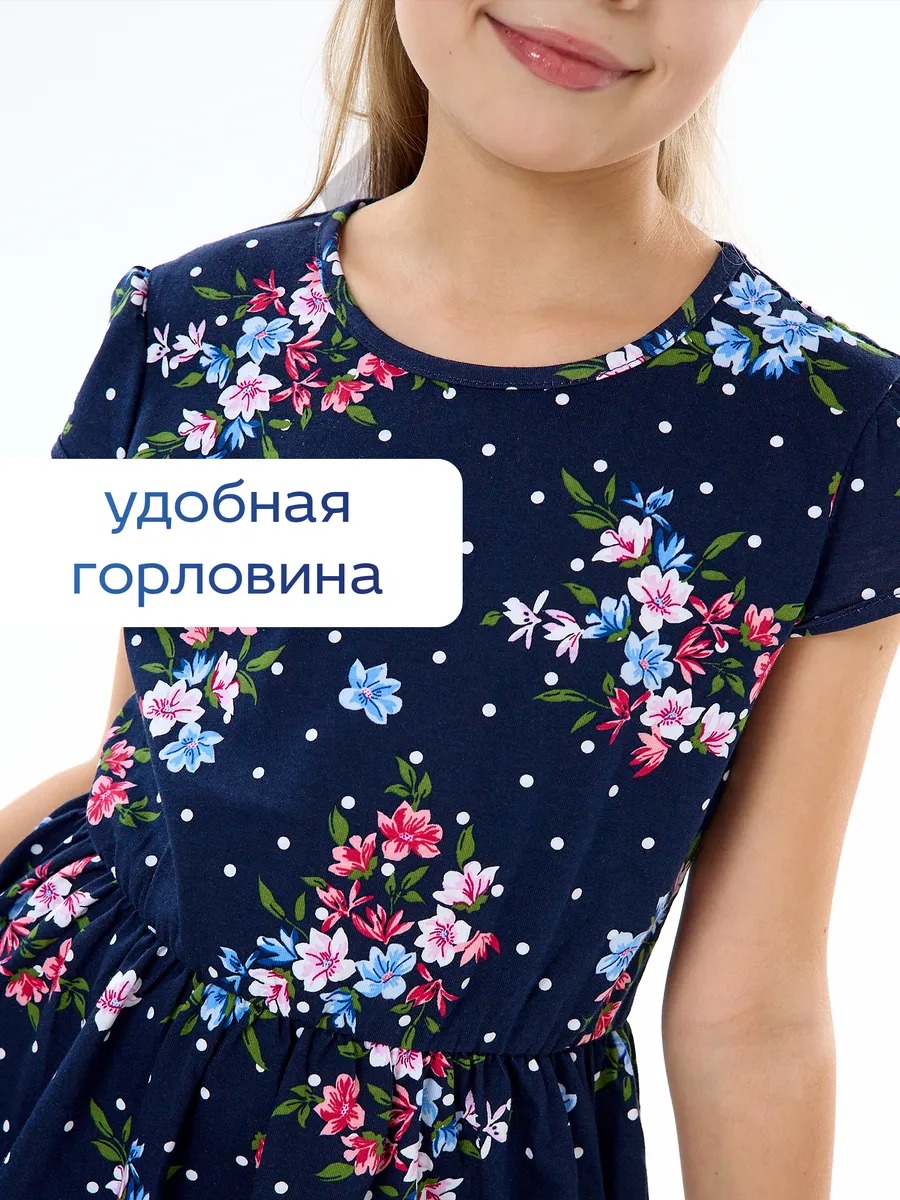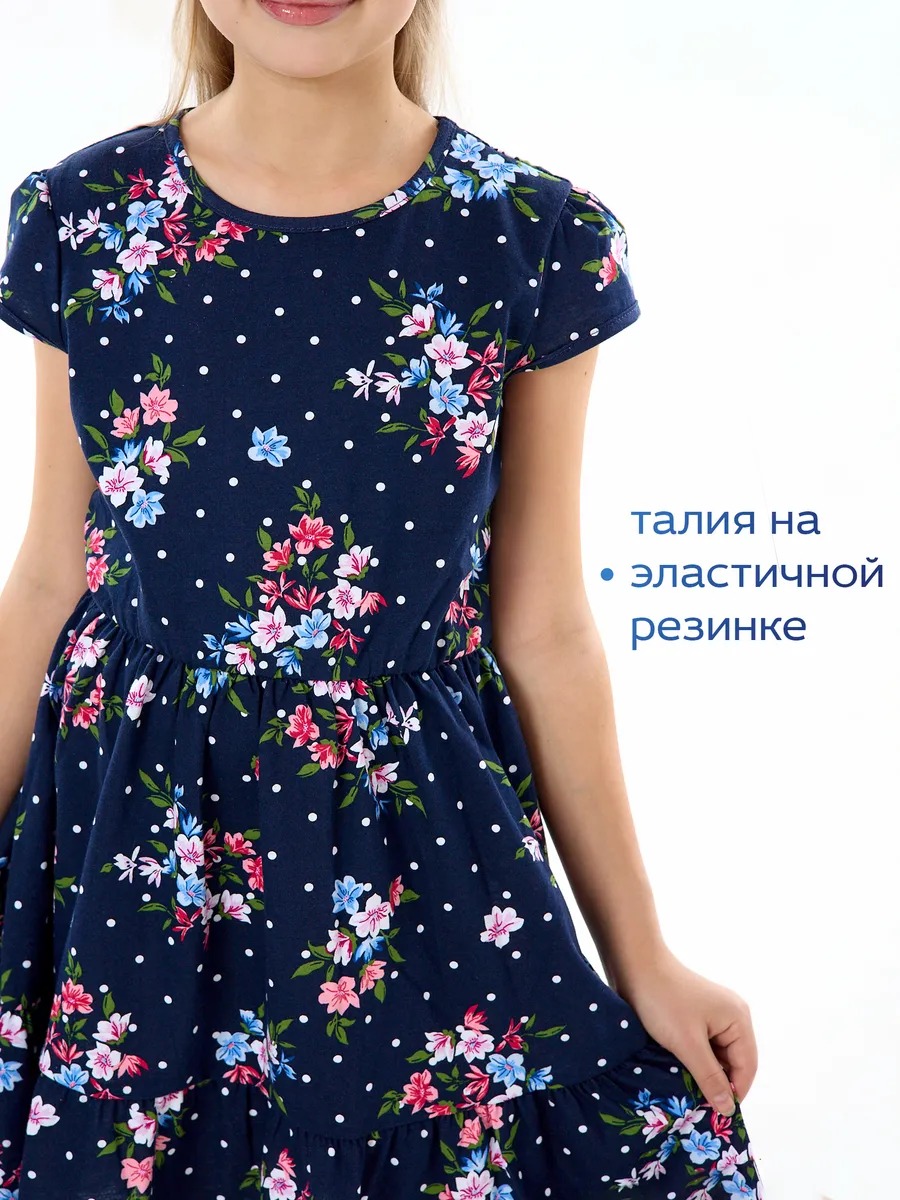 Легкое платье для девочки, удобное в носке, отлично подходит для прогулок в теплую погоду летом и на любое мероприетие. Платьишко выглядит просто и одновременно роскошно благодаря яркой расцветке в мелкий нежный цветочек, удобному крою и летящей юбке с оборкой. Летнее платье с короткими рукавами из качественного хлопкового трикотажа. Платье с юбкой имеет свободный покрой со средней талией на эластичной потайной резиночке, поэтому подходит как для стройных, так и на пухленьких девочек. У платья рукав фонарик и длина ниже колена. Стильное свободное платье для девочки - универсальный вариант как на каждый день, так и на праздник или для танцев.