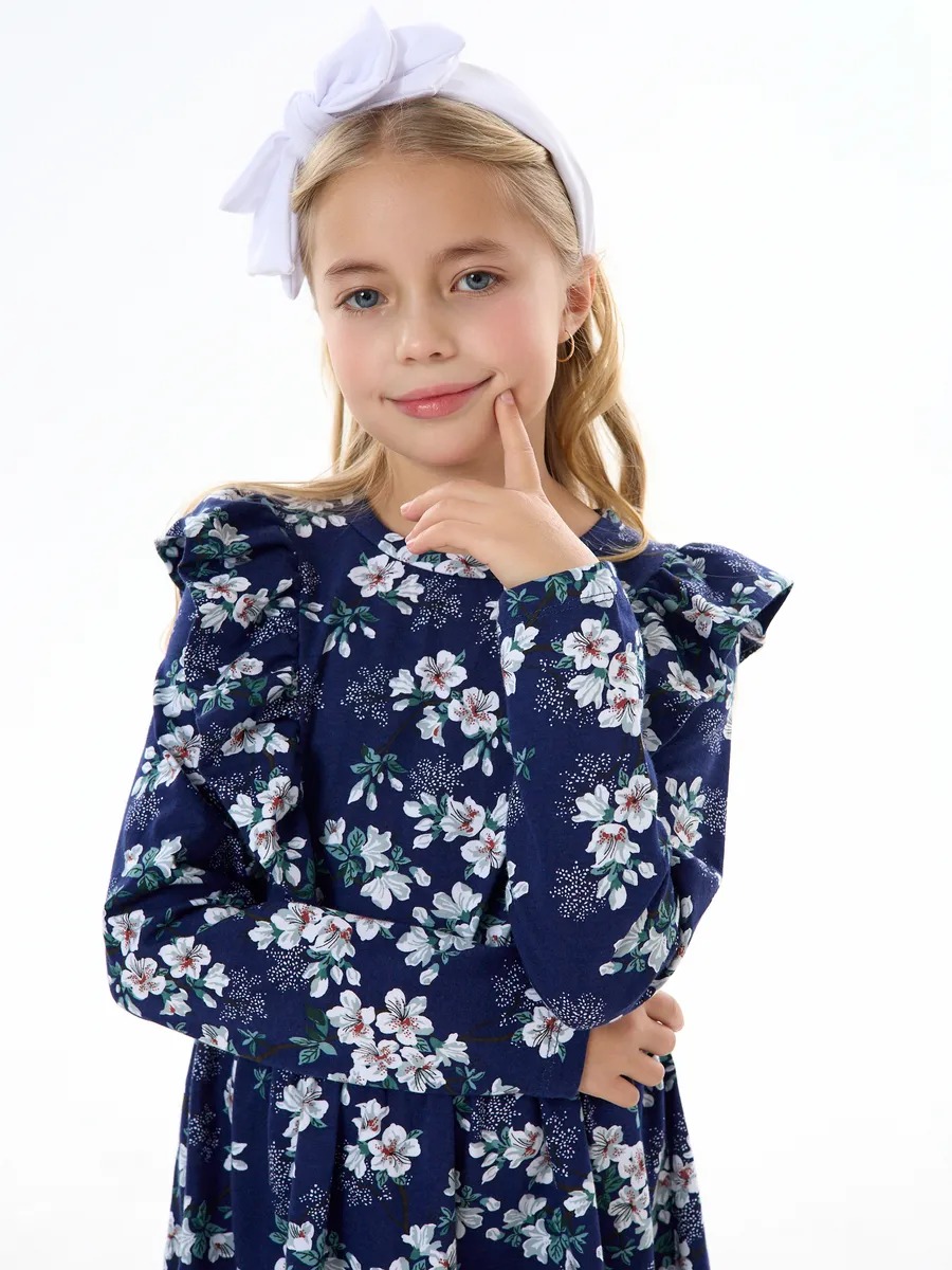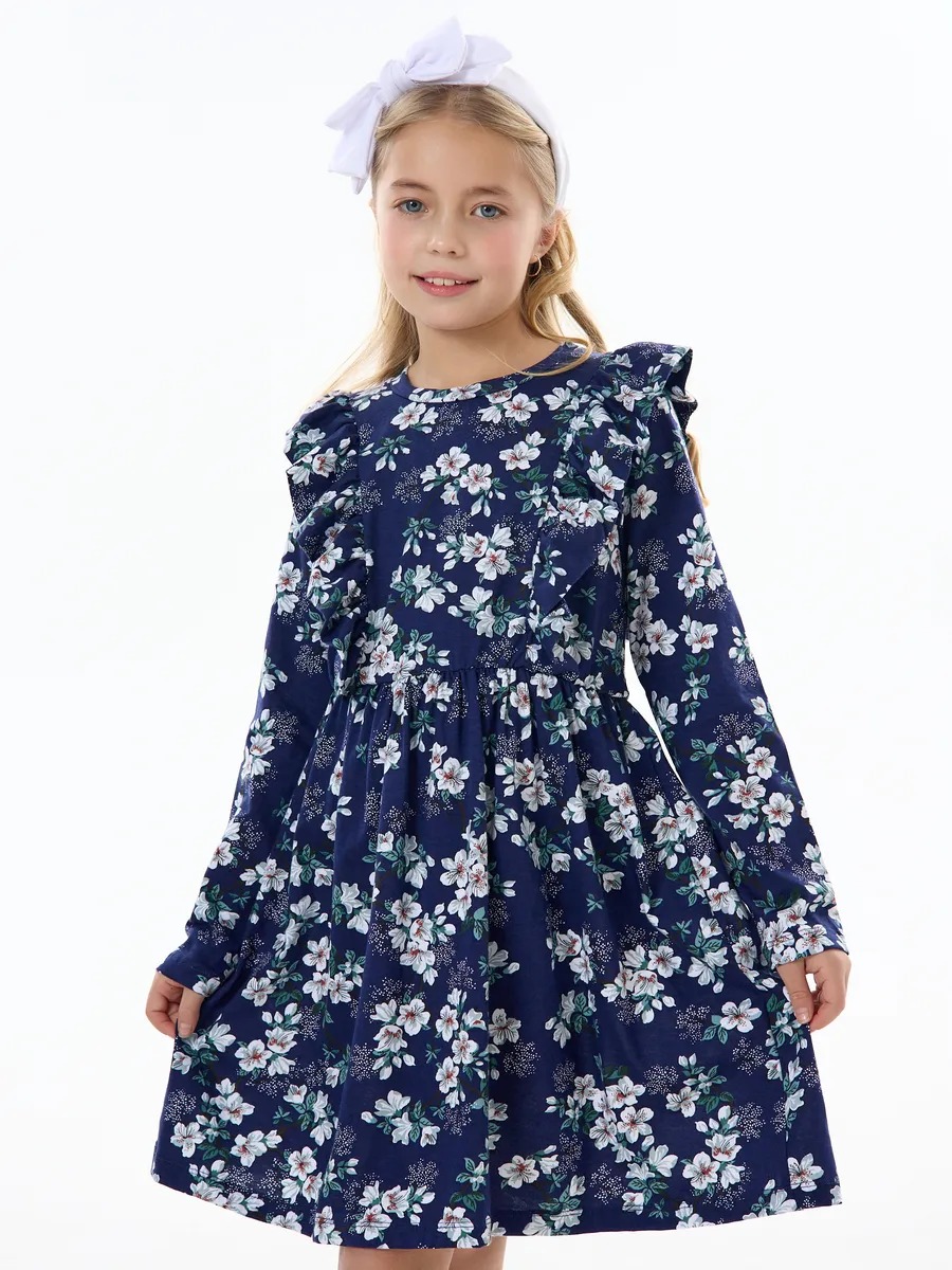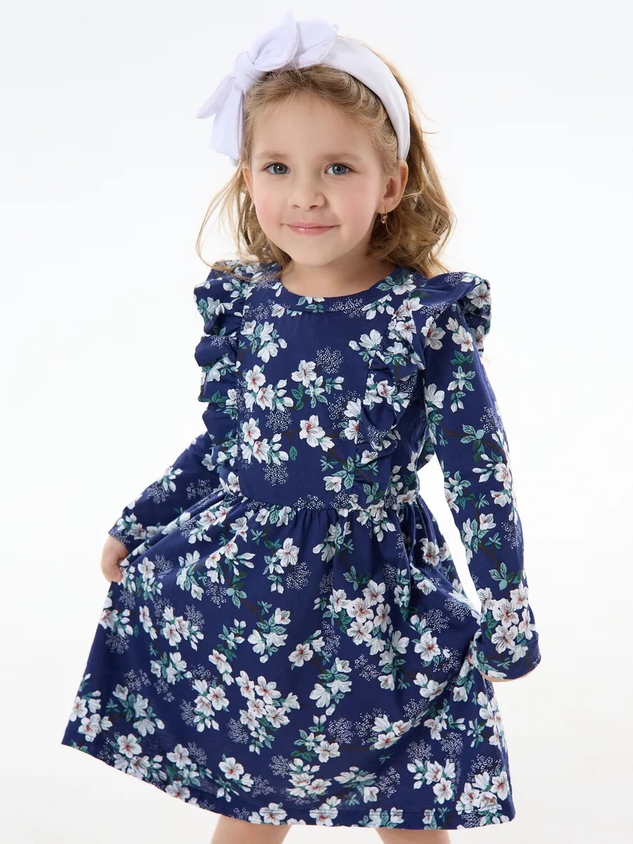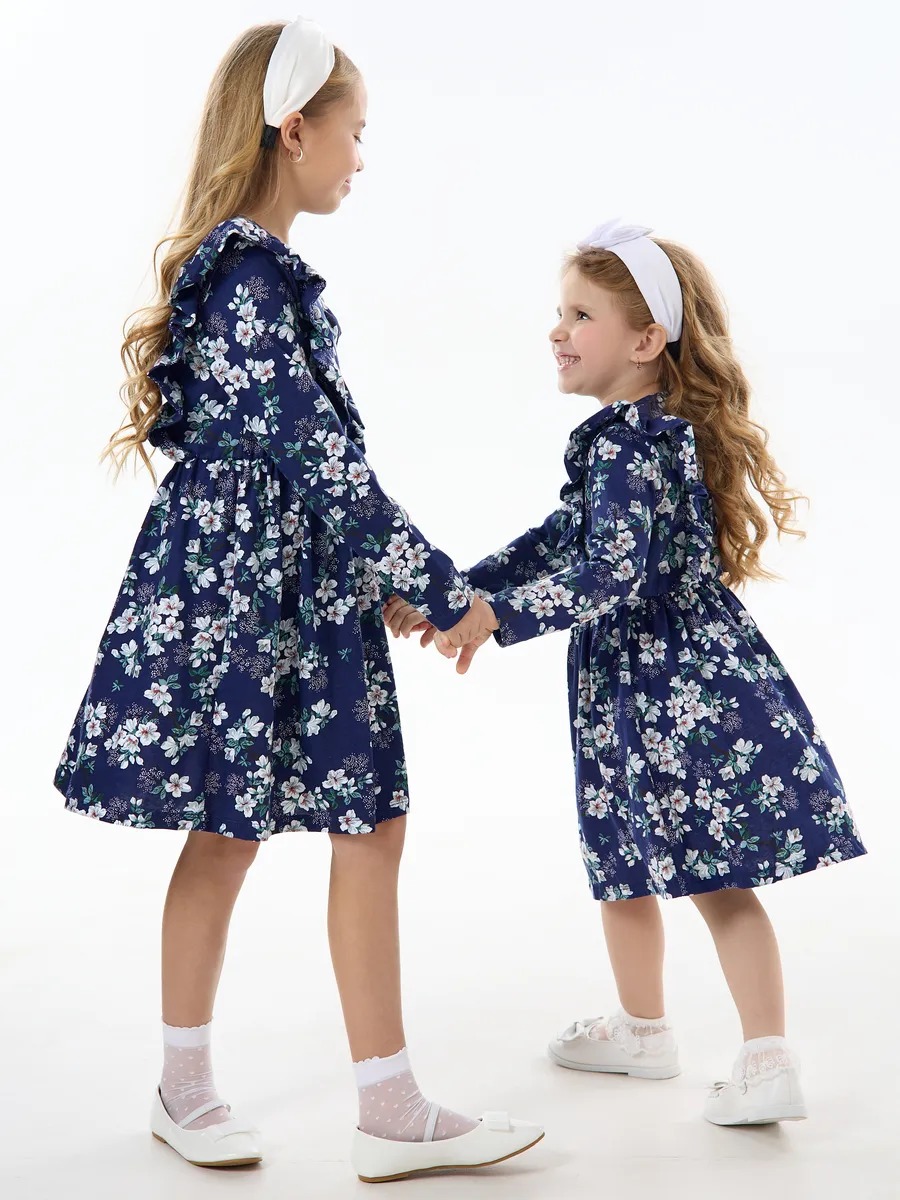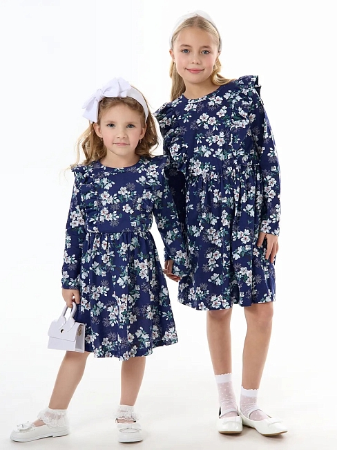 Платье выполнено в популярном винтажном стиле тренд 2026 года — сочетание рюшей, приталенного силуэта и цветочного принта напоминает модные платья в ретро стиле и актуальные тенденции советской детской моды. Приталенный силуэт, воланы на плечах и нежный цветочный принт — детали, характерные для винтажных и ретро платьев. Такое советское платье вновь в тренде и станет отличным выбором для маленьких модниц, любящих стильные образы.
