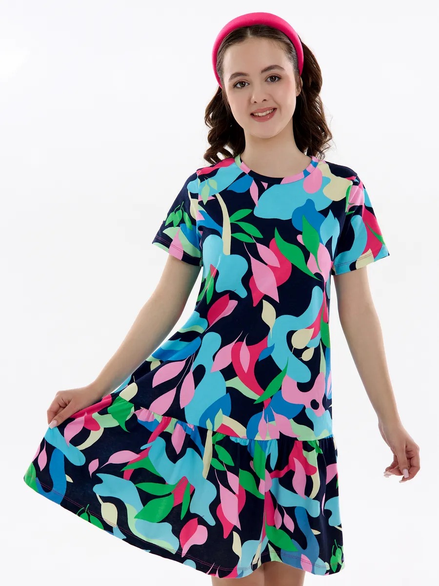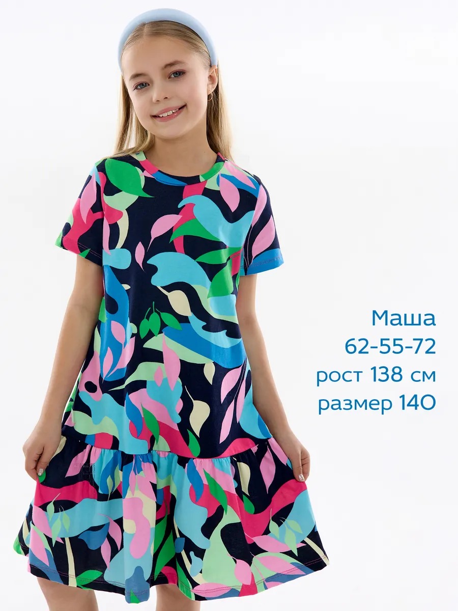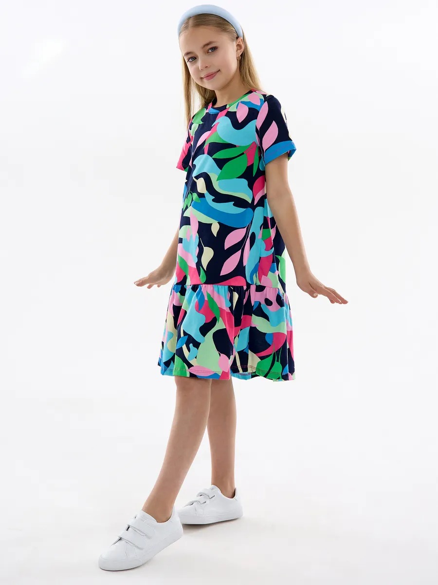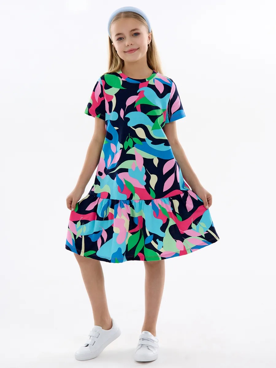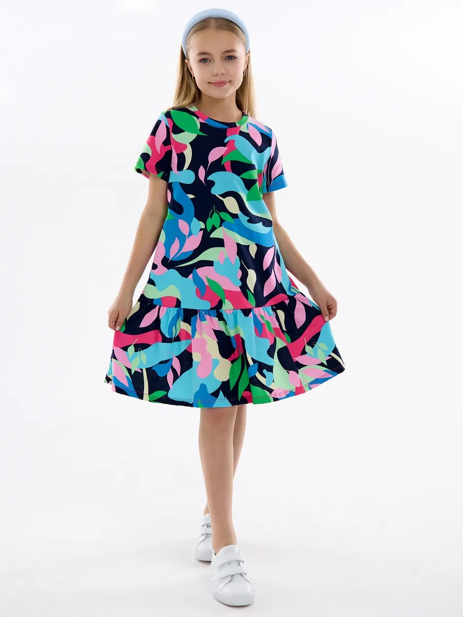 Летнее платье для девочки мультицвет — модный женственный и в то же время милый наряд на все случаи жизни. Хлопковое трикотажное платье для девочки подростка с абстрактным рисунком скроено в виде трапеции с отрезной присборенной юбкой и подойдет девочке любой комплекции. Ваша модница может надевать это стильное платье оверсайз для девочки на прогулки каждый день, для похода в гости или на любые праздники, оно везде будет отлично смотреться. Повседневное платье для девочки благодаря особенностям кроя ребенок может носить достаточно долго: сначала как платье, потом как удлиненную тунику с лосинами.