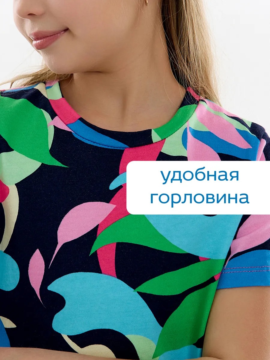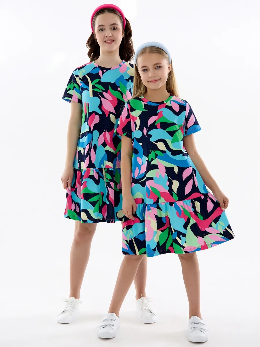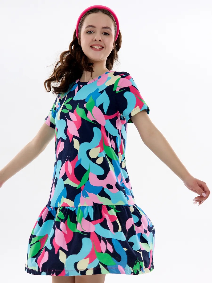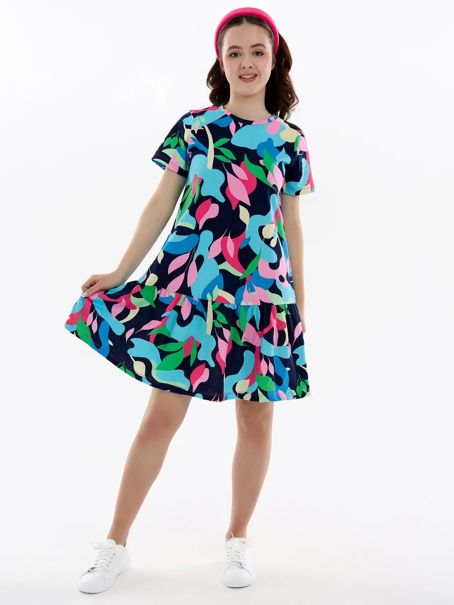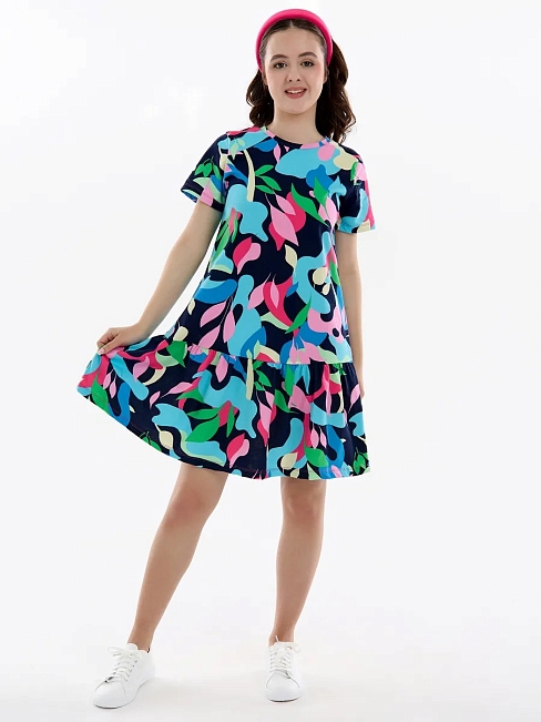 Летнее платье для девочки мультицвет — модный женственный и в то же время милый наряд на все случаи жизни. Хлопковое трикотажное платье для девочки подростка с абстрактным рисунком скроено в виде трапеции с отрезной присборенной юбкой и подойдет девочке любой комплекции. Ваша модница может надевать это стильное платье оверсайз для девочки на прогулки каждый день, для похода в гости или на любые праздники, оно везде будет отлично смотреться. Повседневное платье для девочки благодаря особенностям кроя ребенок может носить достаточно долго: сначала как платье, потом как удлиненную тунику с лосинами.