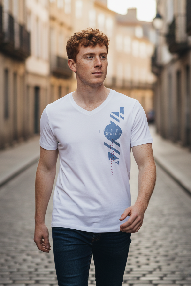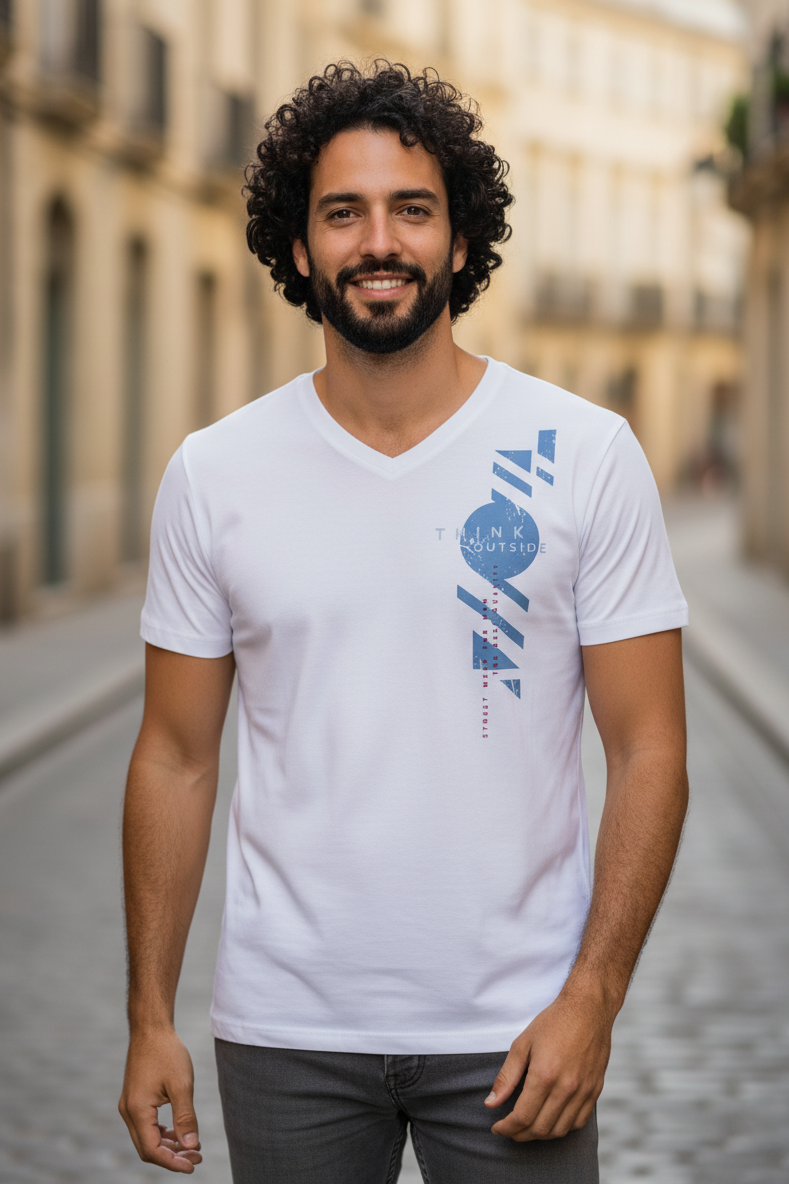 Красивая, практичная мужская футболка с дизайнерским принтом. Воротник мысиком, короткий рукав и удобная длина делают модель футболки универсальной. Легко сочетается с любыми вещами из мужского базового гардероба.