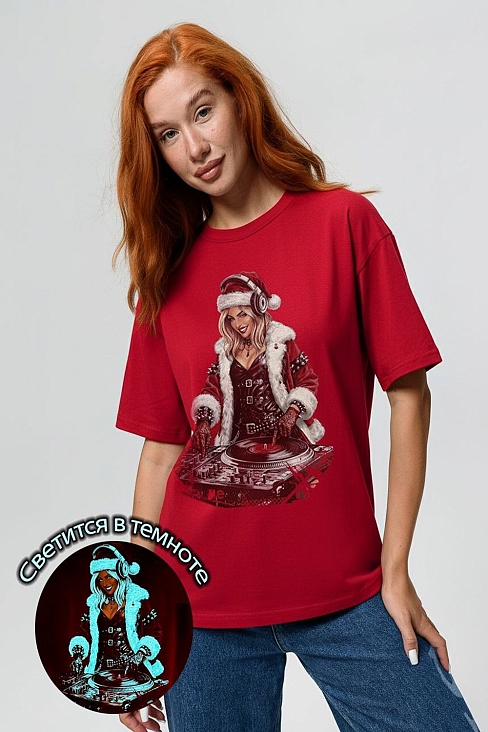 Погрузитесь в магию праздника с нашей стильной oversize-футболкой "Санта-Диджей"! Эта яркая красная футболка создана для тех, кто любит миксовать новогоднюю атмосферу с ритмом музыки. Главная героиня принта — соблазнительная Санта в меховой накидке, с красной шапкой и наушниками, уверенно стоящая за диджейским пультом. Её образ сочетает классический рождественский стиль с современным уличным вайбом: белый мех, чёрная кожаная одежда и динамичная поза, полная энергии.