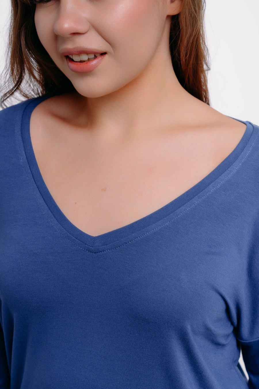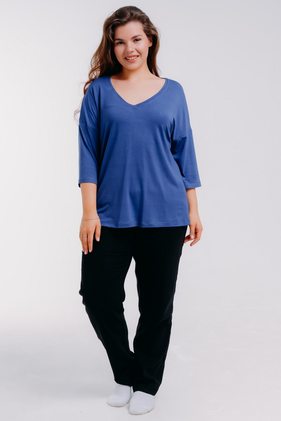 Футболка женская из вискозы Марина индиго с рукавом три четверти. U - образный вырез приоткрывает ключицу придавая вашему образу женственность. Джемперы и кардиганы будут уместны для встречи с подругами, деловой встречи или свидания. Кофта джемпер будет хорошо смотреться на разных типах женской фигуры скроет все имеющиеся недостатки, подойдёт для беременных.