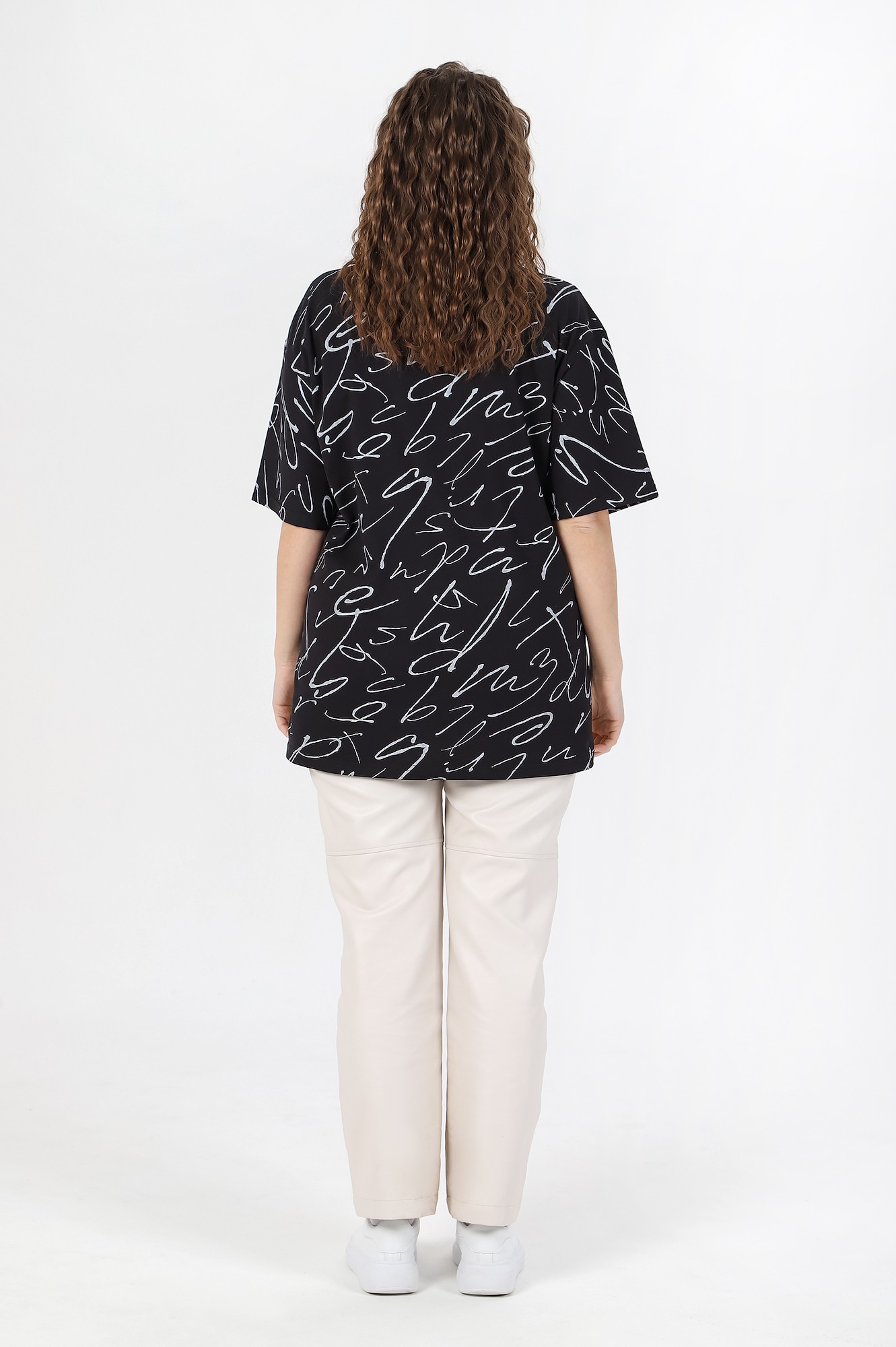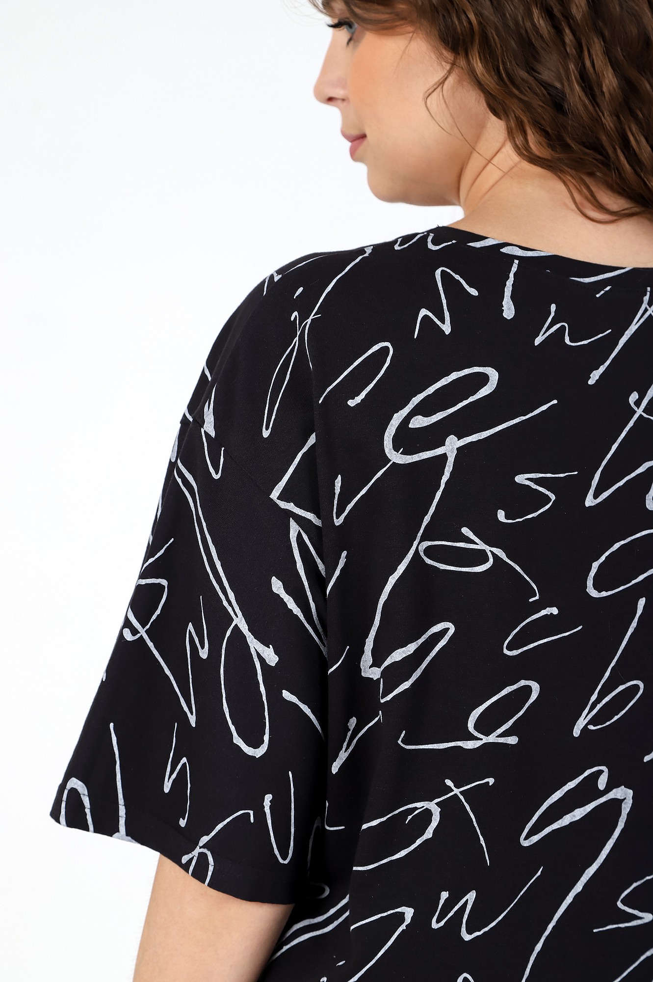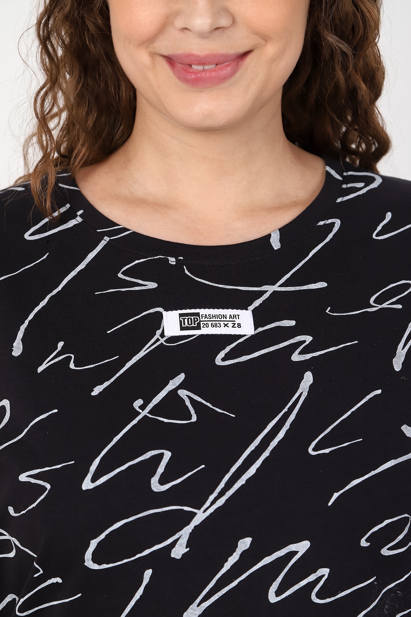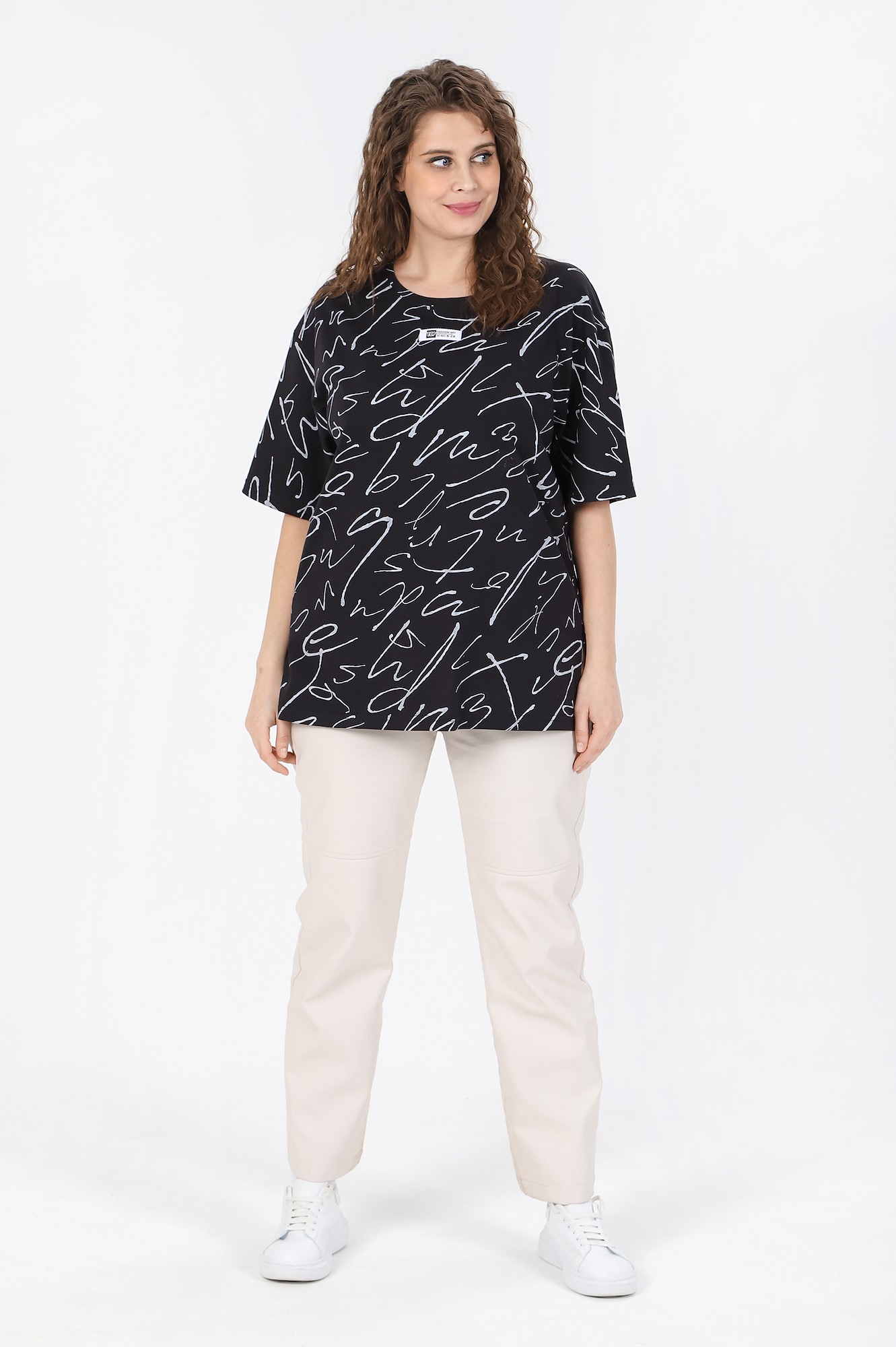 Футболка женская из трикотажного полотна «кулирка» с набивным рисунком, свободного покроя, со спущенным плечом и втачными рукавами длиной до локтя, горловиной овальной формы, обработанной втачной планкой, по центру полочки настрочен декоративный элемент, в нижней части боковых швов – разрезы.