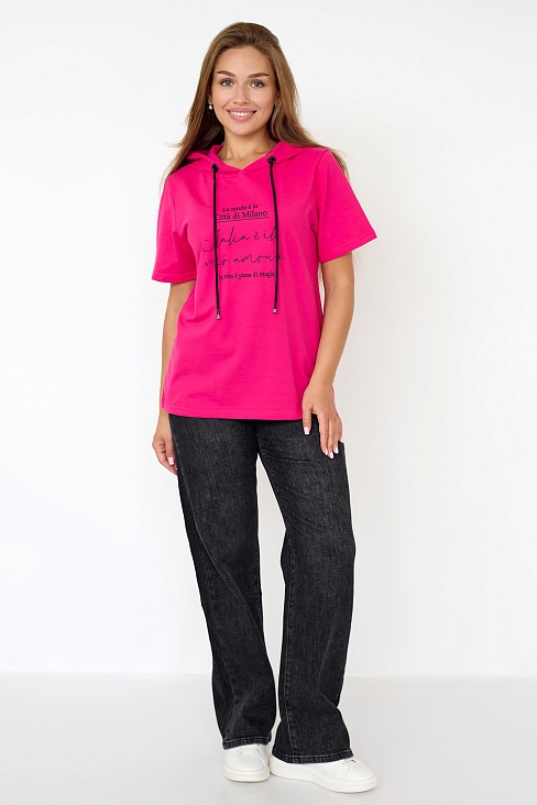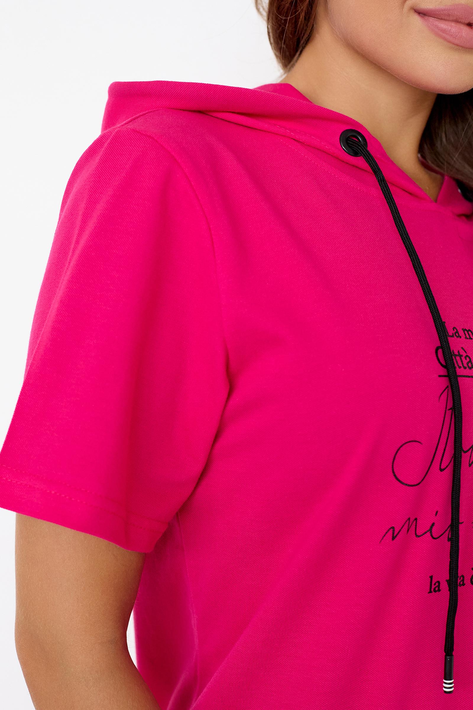 Спортивная футболка Трейси с капюшоном. Ткань Лакоста практична и удобна в повседневной носке. Футболка не мнется, пропускает воздух и максимально комфортна во время прогулок, занятий спортом или домашними делами. Стильная футболка с дизайнерским принтом и регулирующим шнурком выглядят модно и уникально.