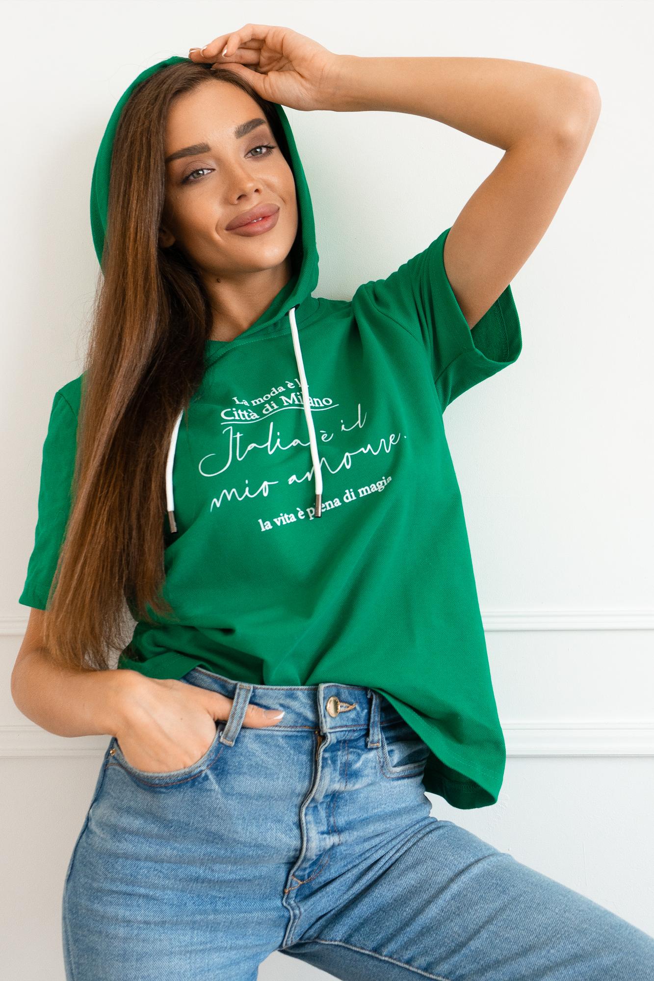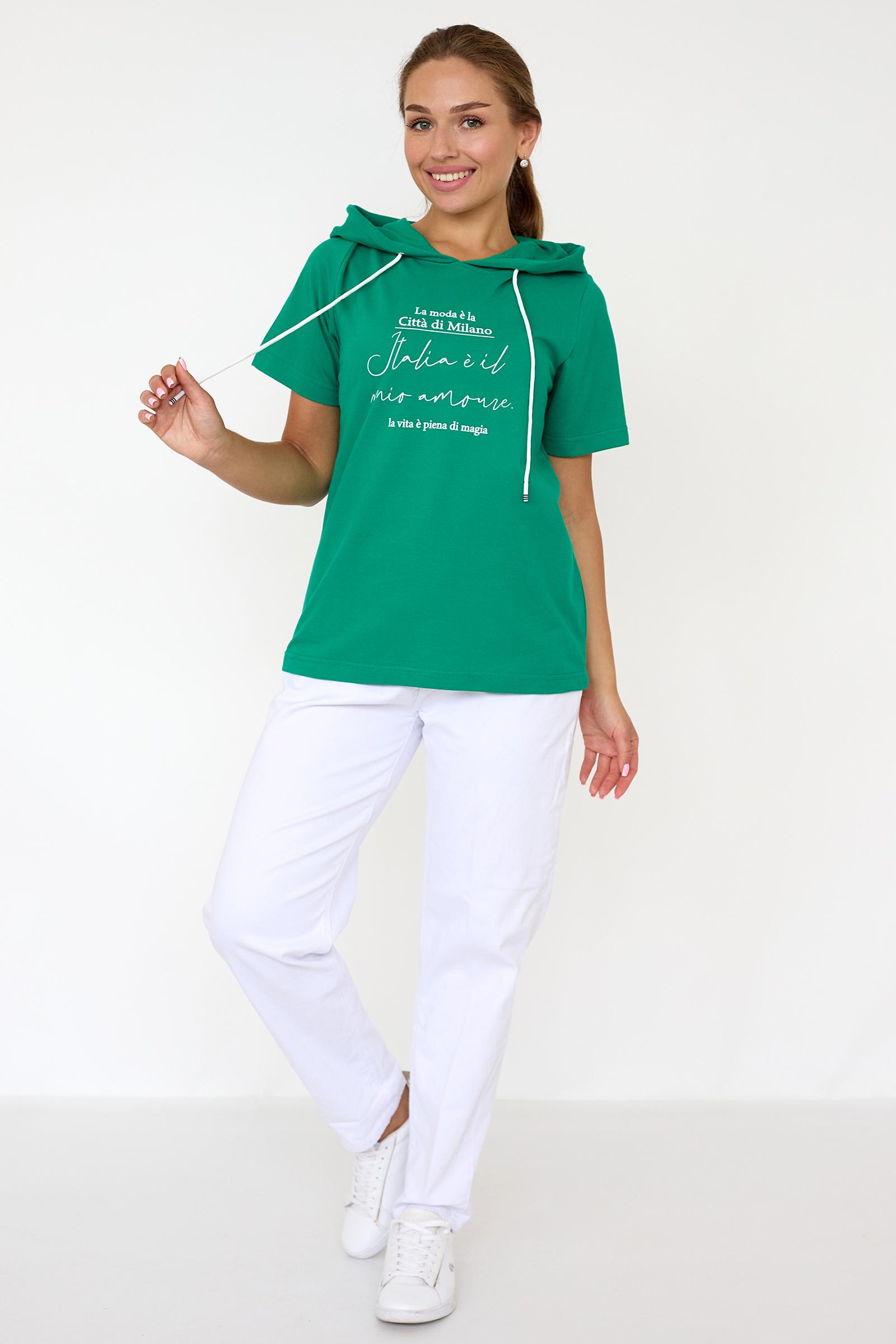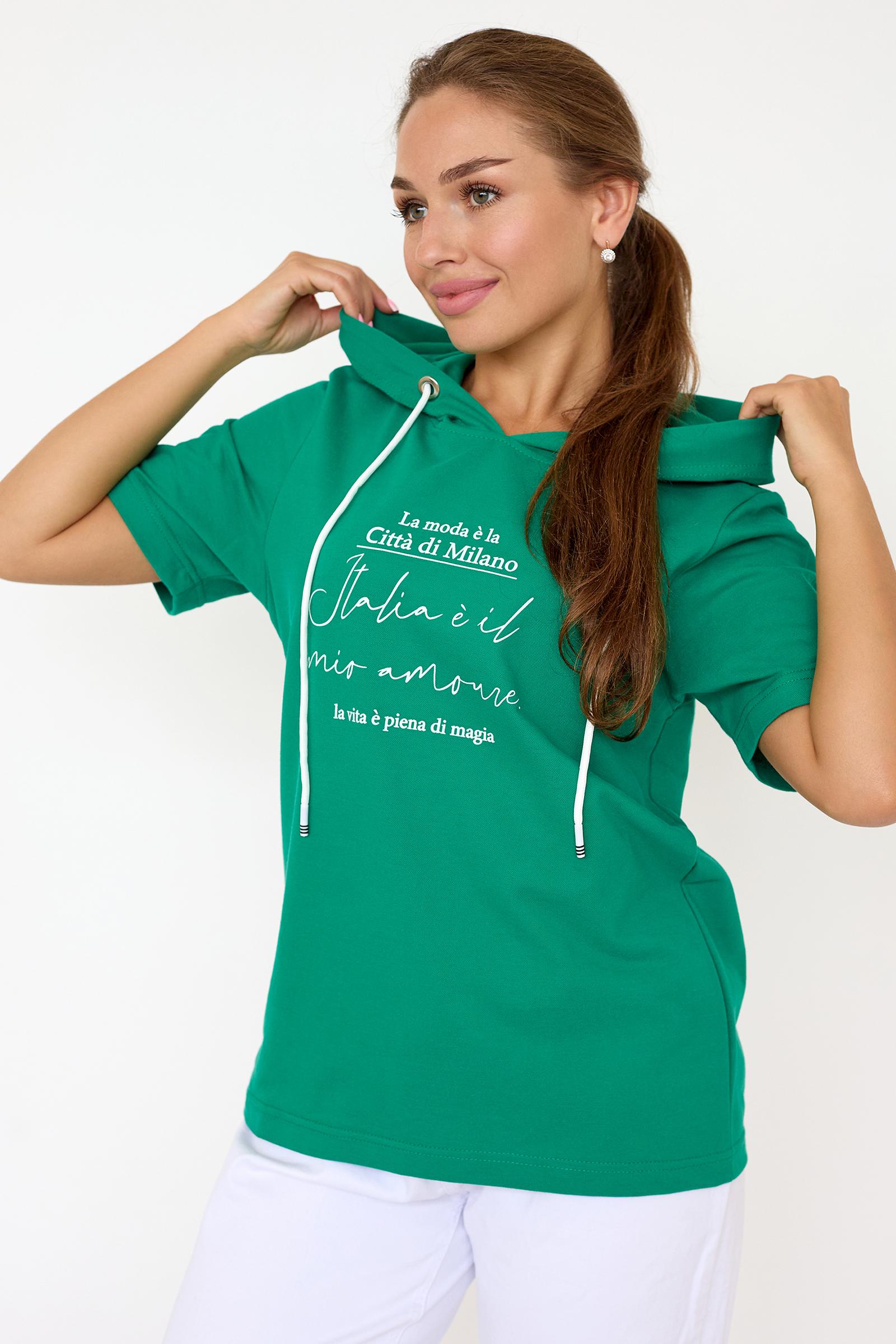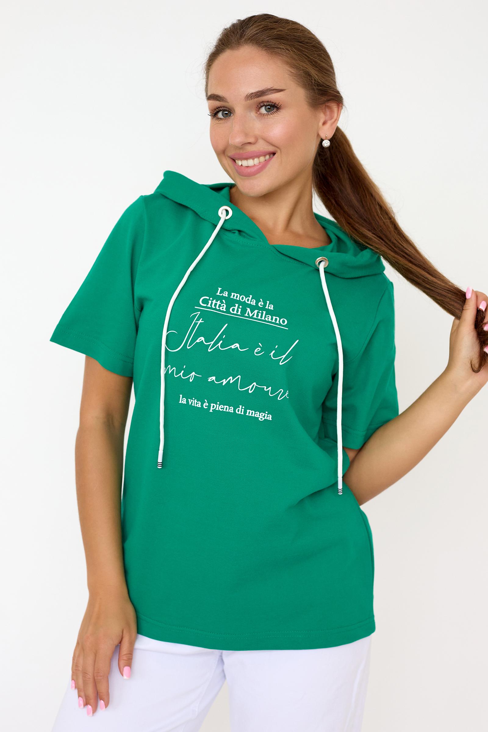 Спортивная футболка Трейси с капюшоном. Ткань Лакоста практична и удобна в повседневной носке. Футболка не мнется, пропускает воздух и максимально комфортна во время прогулок, занятий спортом или домашними делами. Стильная футболка с дизайнерским принтом и регулирующим шнурком выглядят модно и уникально.