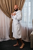 Модель халата с поясом позволяет ему быть универсальным и подходит к любому типу телосложения, скрывая недостатки и подчеркивая достоинства фигуры. Наличие карманов делает его практичным для ношения дома, в бане или сауне, а также на отдыхе.