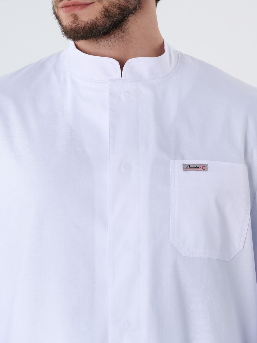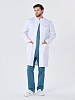 Халат медицинский мужской 245.0 прямого силуэта с центральной потайной застежкой на 7 кнопок. На полочке расположены 2 боковых кармана и 1 нагрудный карман со скошенными углами. Спинка со средним швом. В среднем шве спинки обработана шлица. В боковых швах обработаны щели для удобства. Рукава длинные двухшовные. Воротник- стойка.