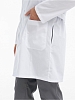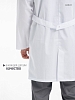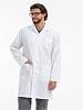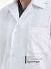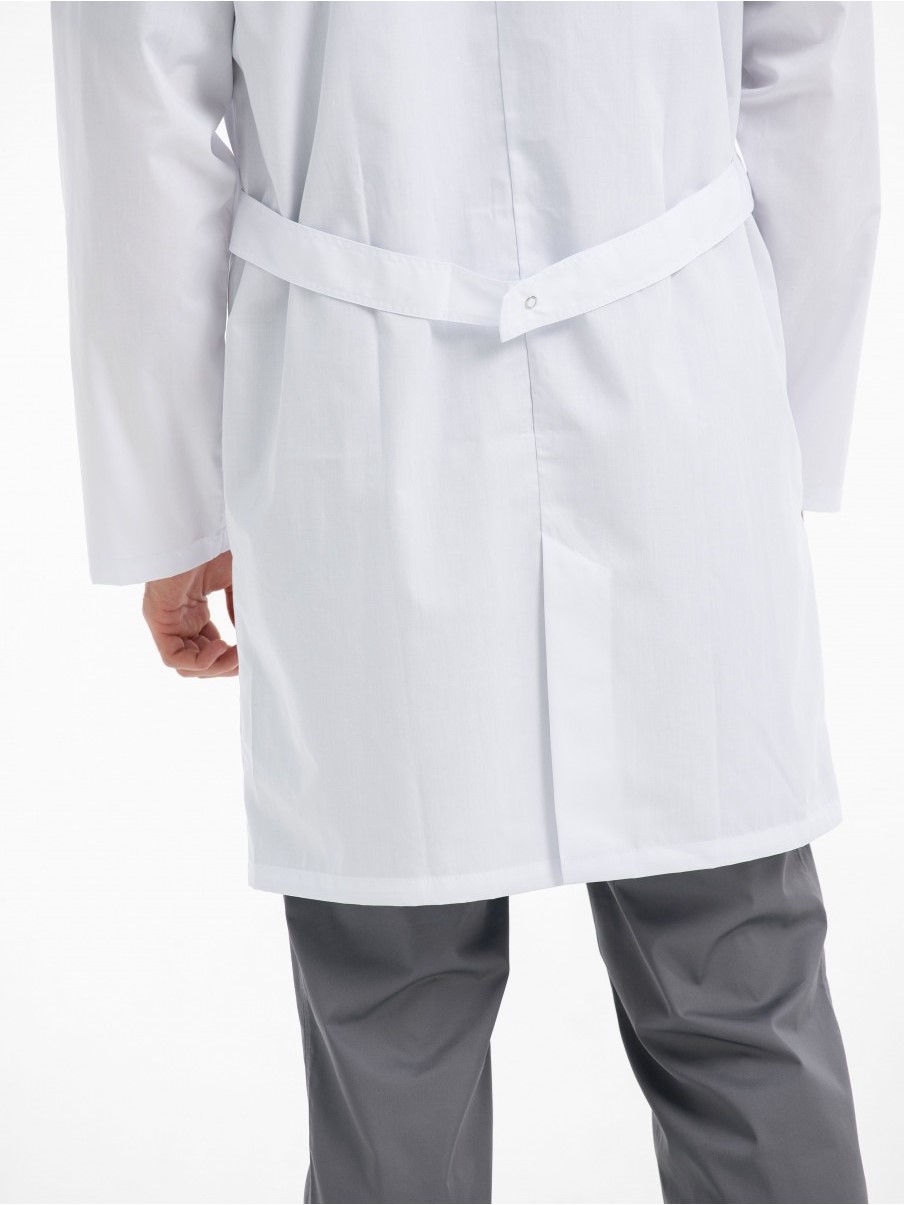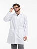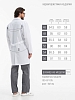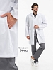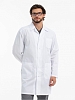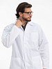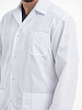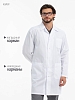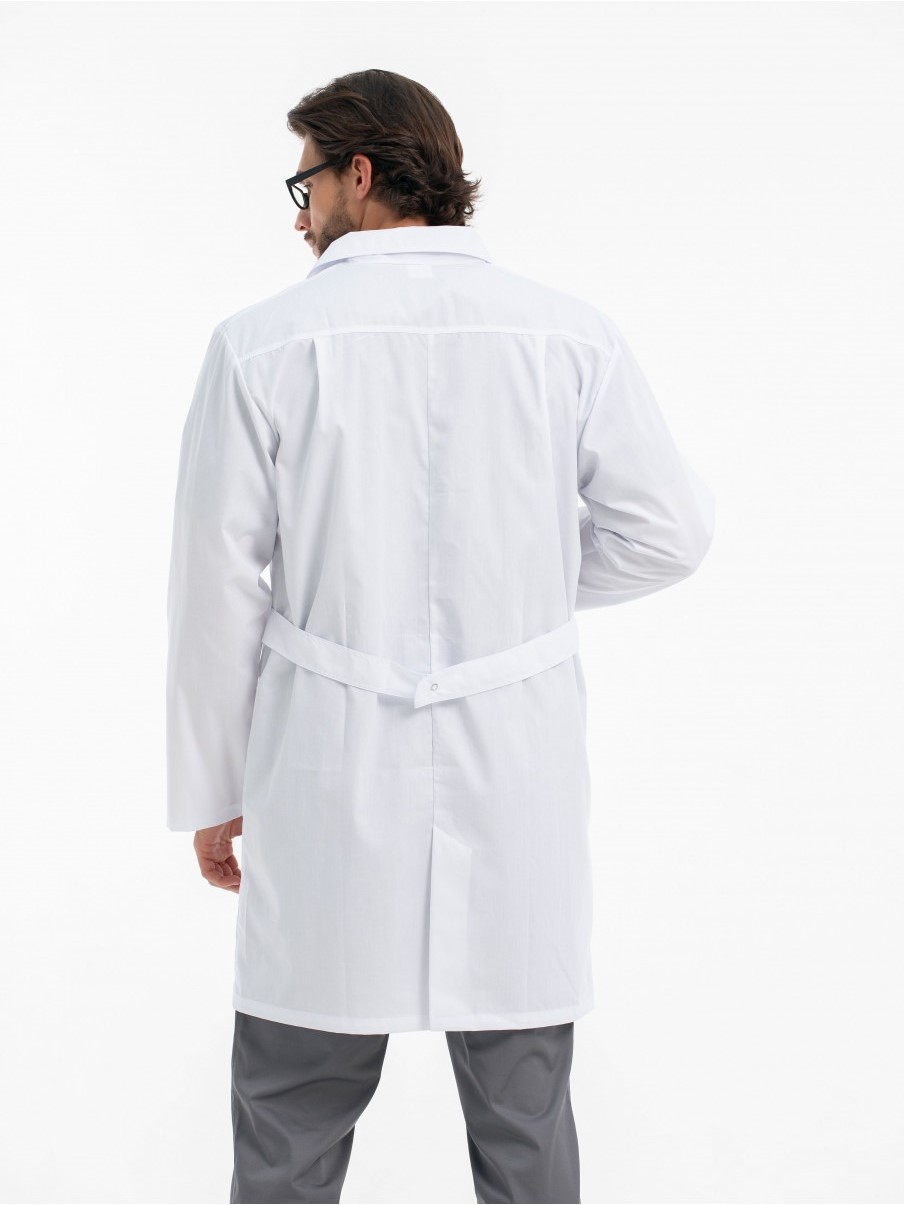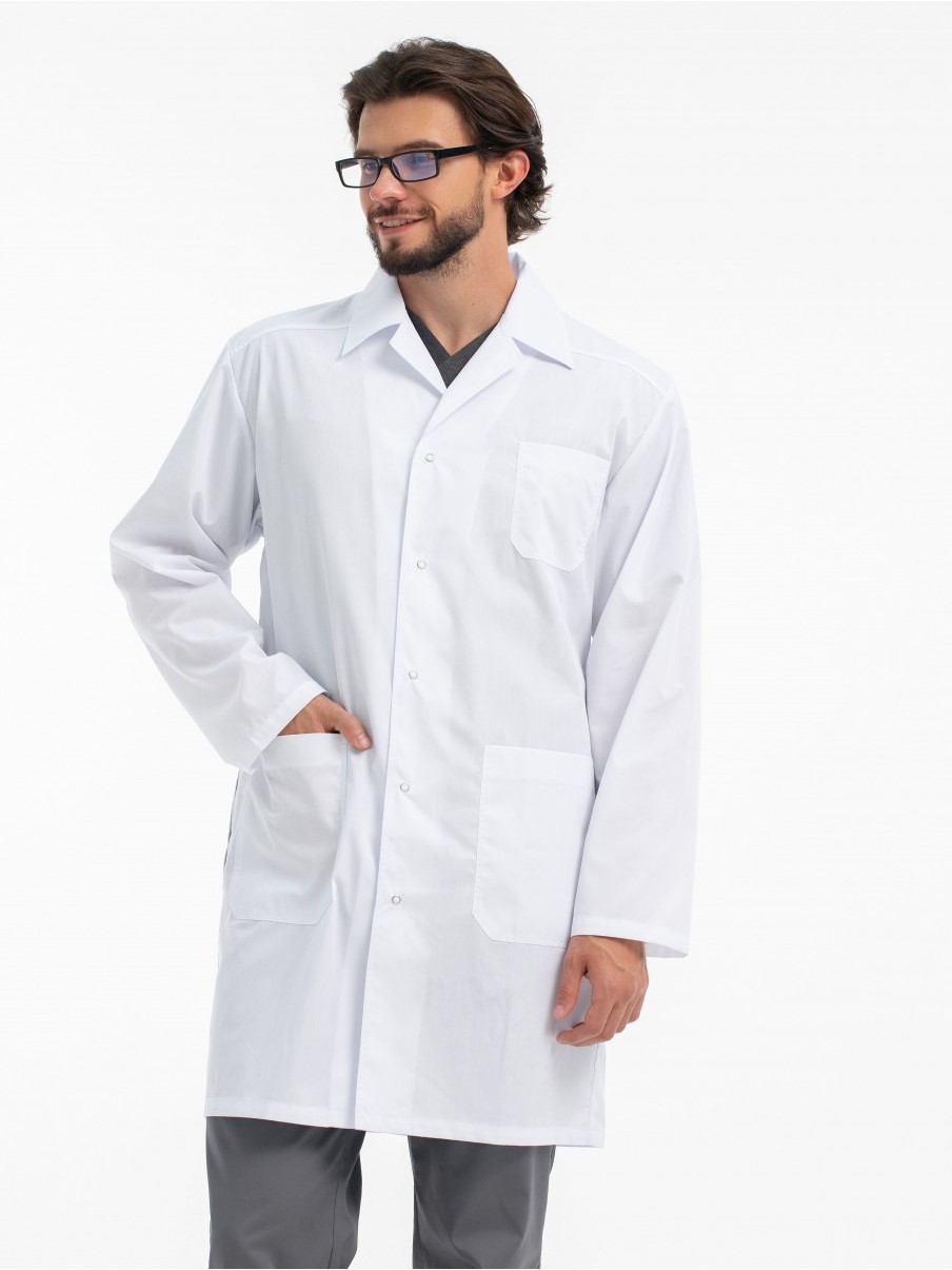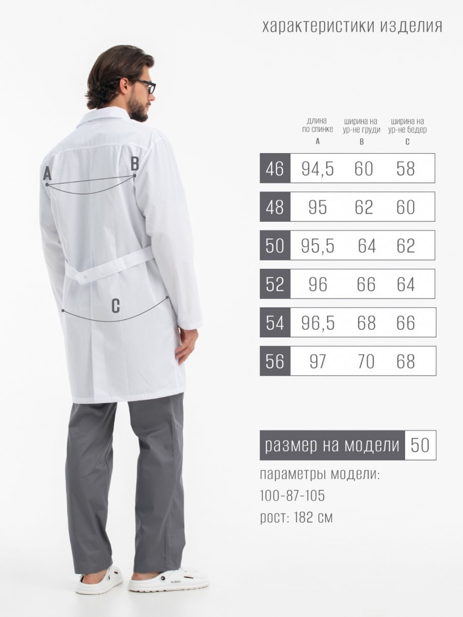 Халат медицинский мужской 65.0 прямого силуэта с центральной застежкой на 5 петель – пуговиц (кнопок). На полочке расположены 2 боковых и 1 нагрудный карман со скошенными углами. На полочке расположена кокетка. В боковых швах обработаны щели для большего комфорта. Спинка со средним швом и шлицей в нем. Спинка с кокеткой и складками из-под нее. На уровне линии талии в боковые швы втачан хлястик на 1 пуговицу. Рукав длинный. Воротник отложной.