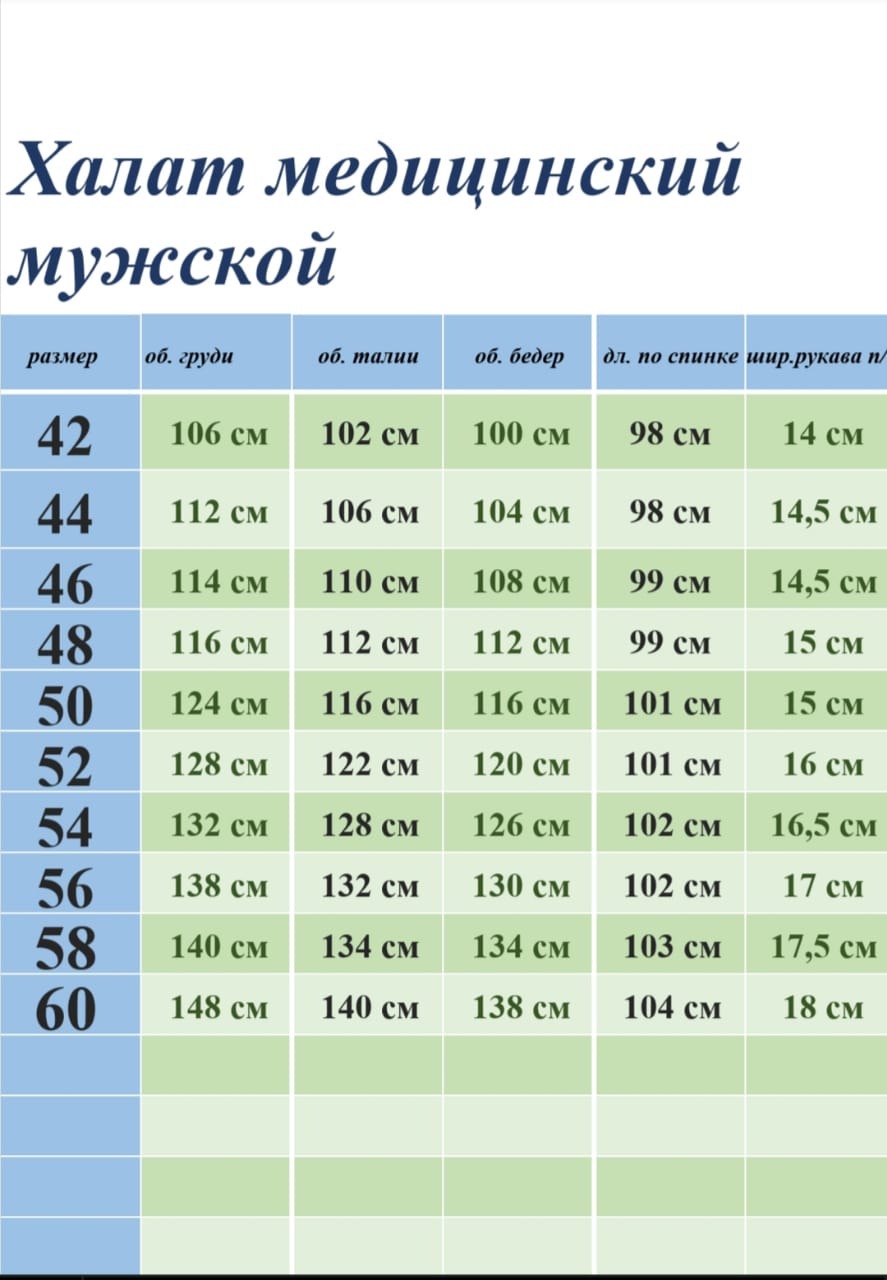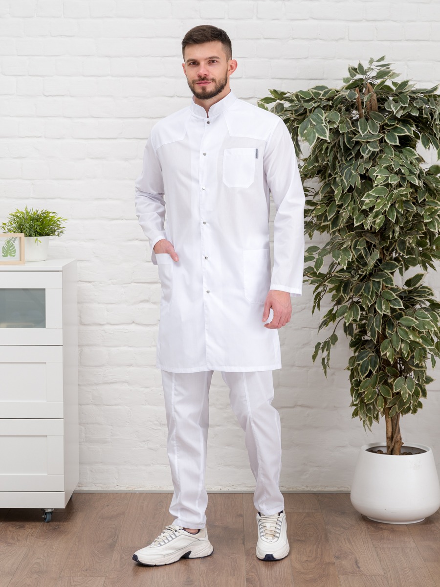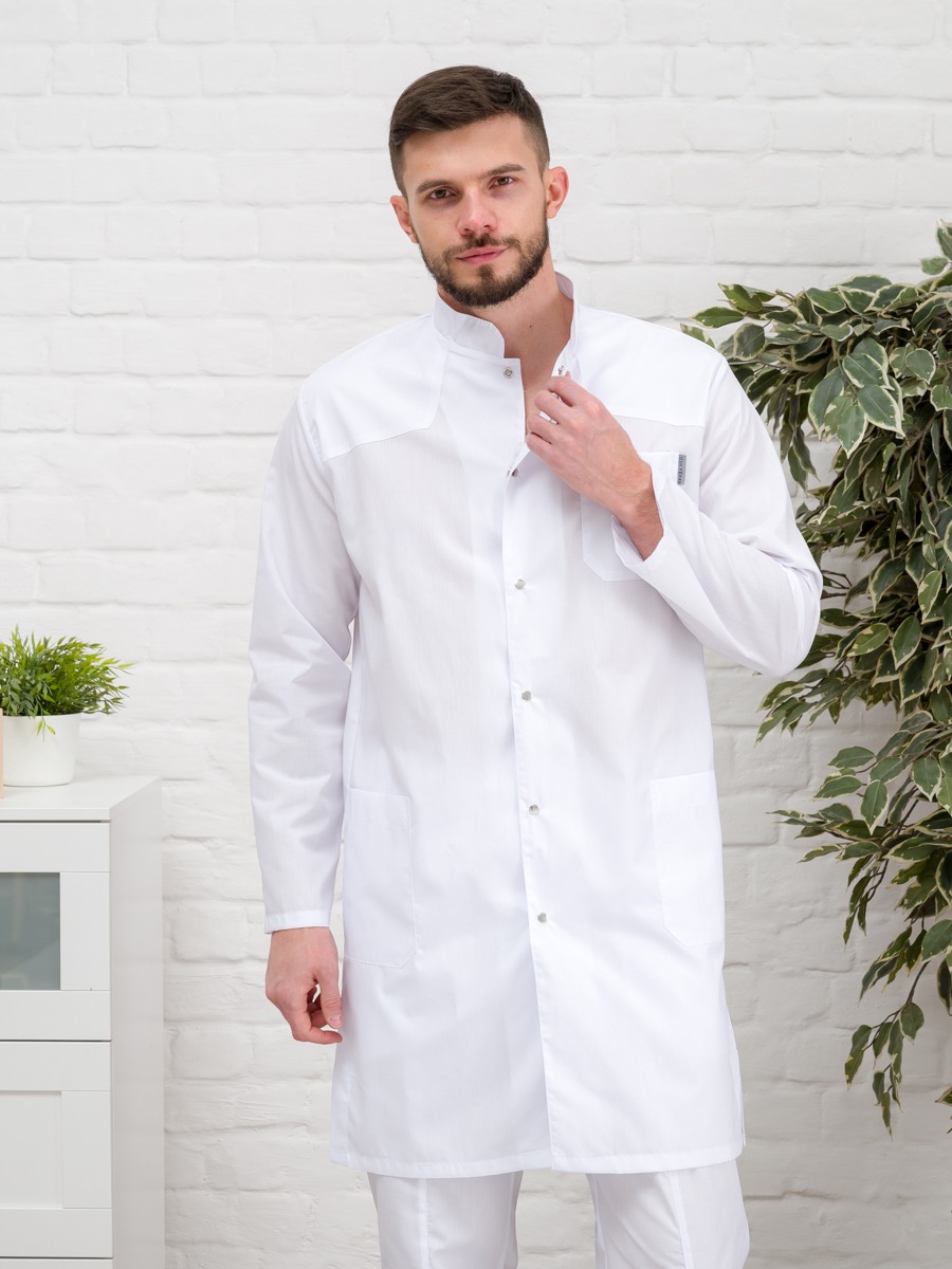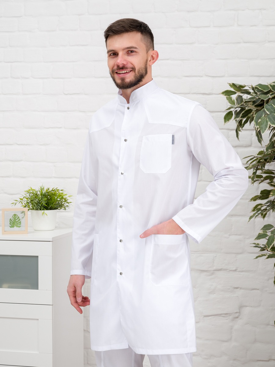 Халат медицинский имеет большой размерный ряд(от 38 до 60), для тех, кто ценит качество, комфорт и красоту. Униформа изготовлена в ткани тиси. Обратите внимание на этот мужской медицинский халат на клепках с длинным рукавом, воротником стойкой и тремя накладными карманами: 1 находится на груди, 2 других - снизу по бокам. Такой материал легкий в уходе и износостойкий.