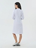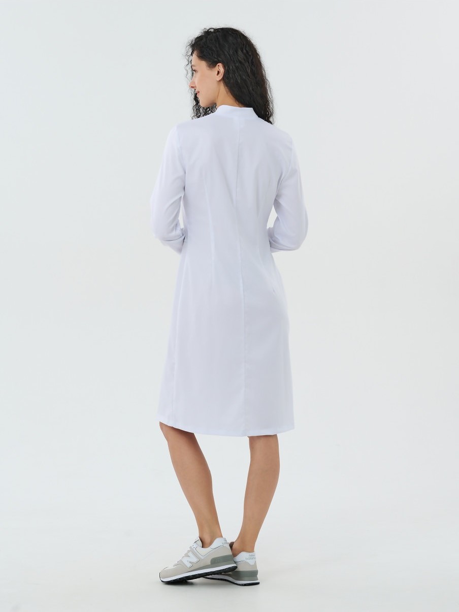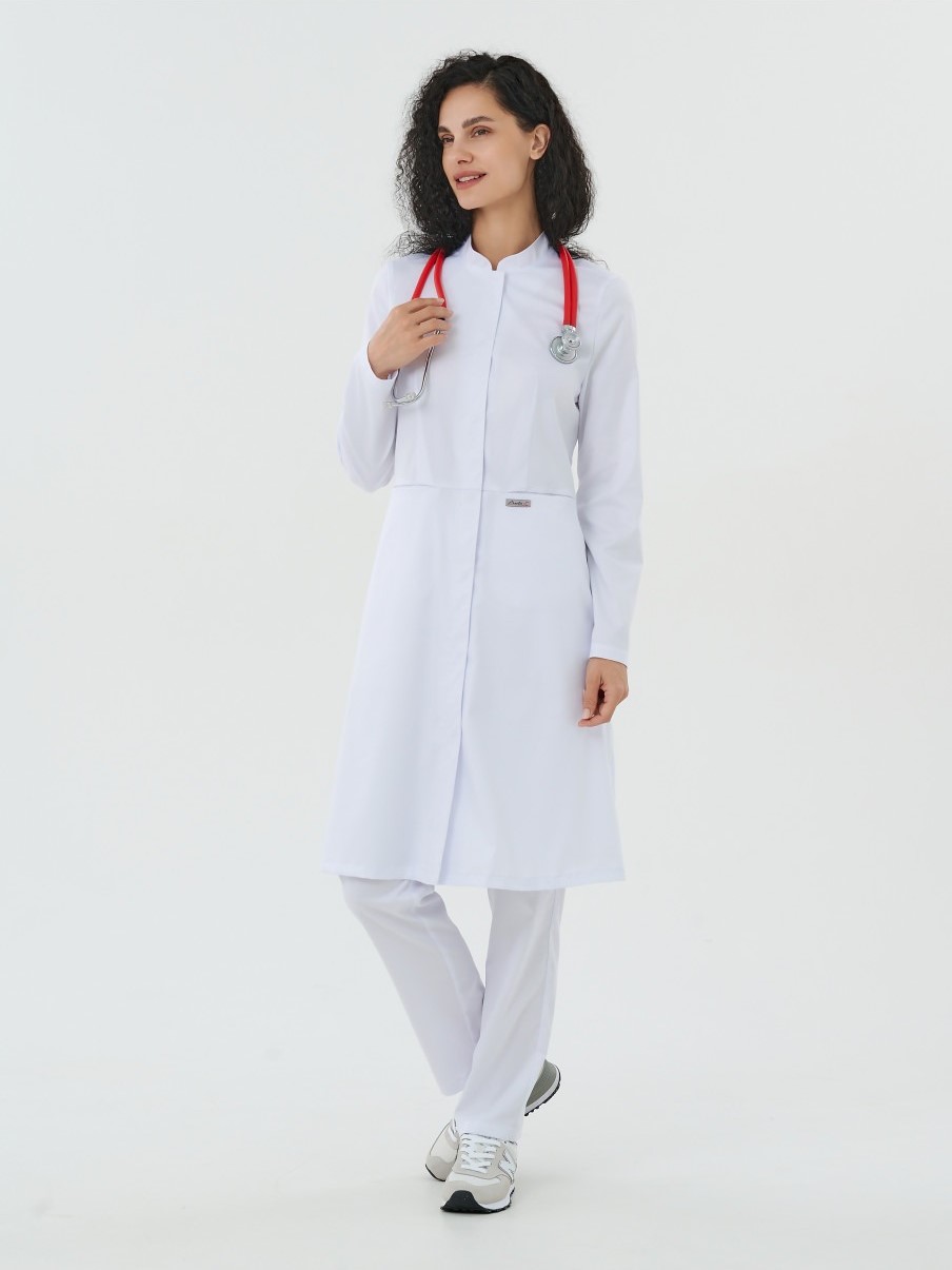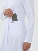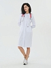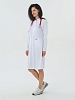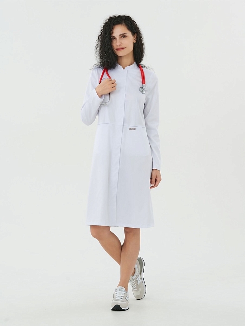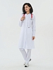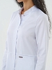 Халат медицинский женский 172.0 полуприлегающего силуэта с центральной скрытой застежкой на 7 кнопок. Изделие с воротником- стойкой. Полочка отрезная по линии талии, с талиевыми вытачками на верхней части полочки. В шве притачивания верхней части к нижней обработаны боковые карманы. Под левым карманом настрочен лейбл с фирменным знаком. Спинка со средним швом и талиевыми вытачками. Рукава длинные.