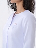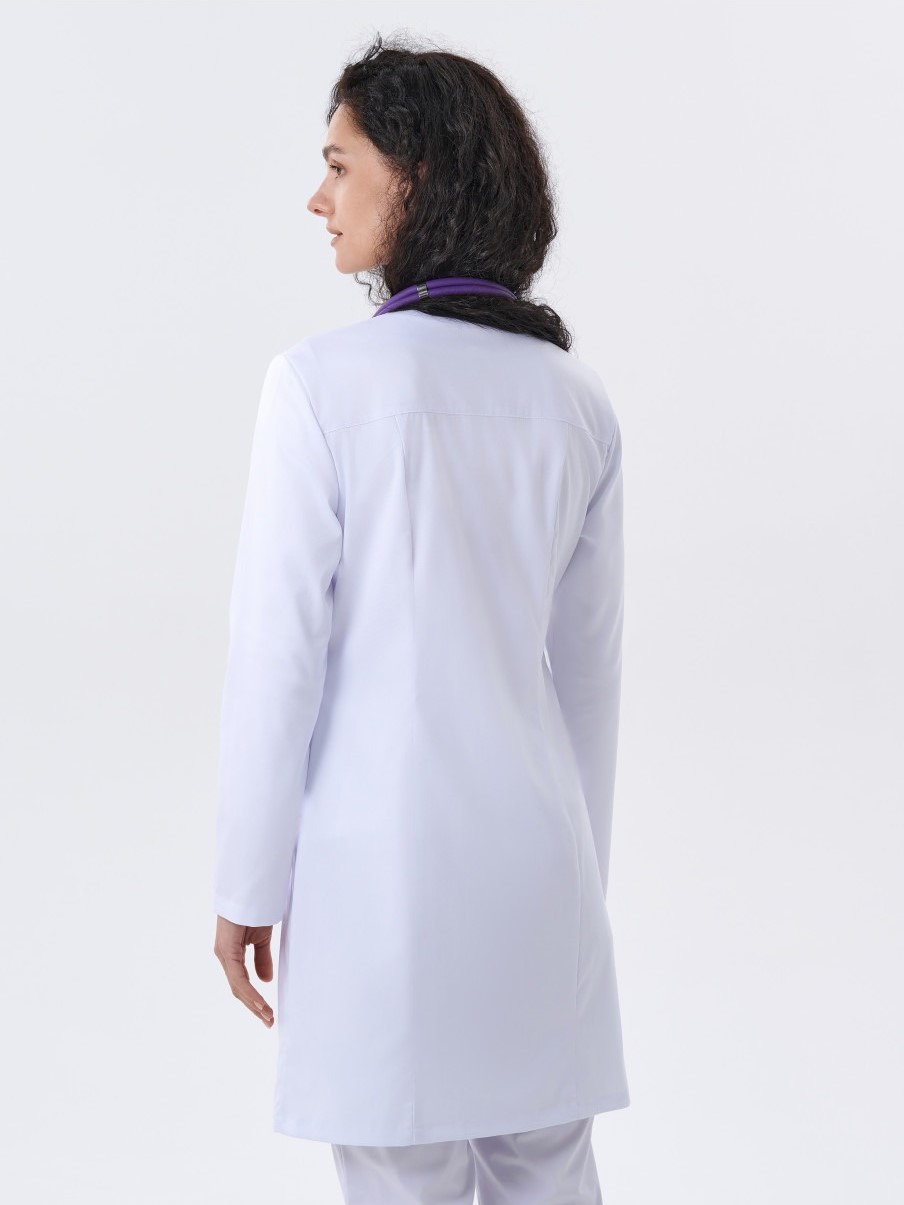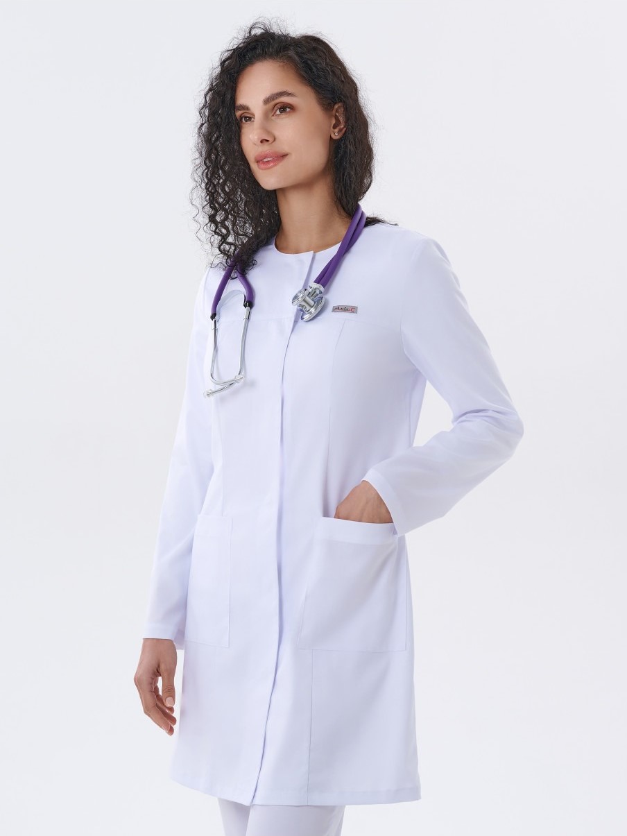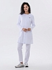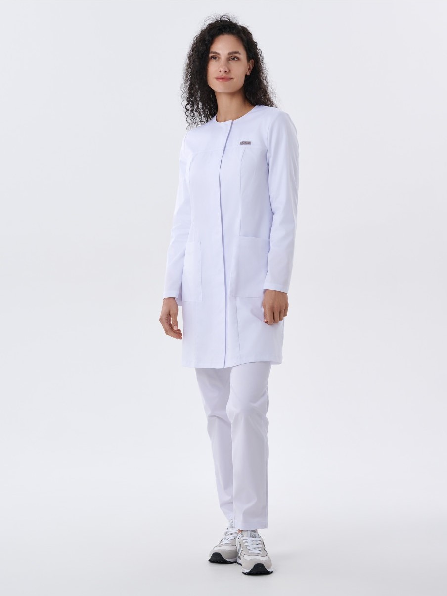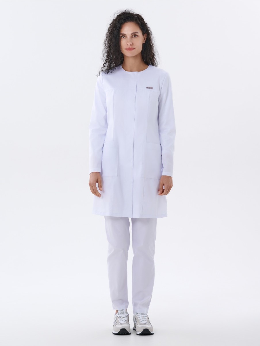 Женский медицинский халат 250.0 полуприлегающего силуэта с центральной скрытой застежкой на 6 кнопок. Изделие без воротника с круглым вырезом горловины. На полочке расположены кокетка и рельефы из-под нее, 2 боковых кармана. На кокетке слева настрочена нашивка с фирменным знаком. Спинка с кокеткой и рельефами из-под нее. Рукава длинные.