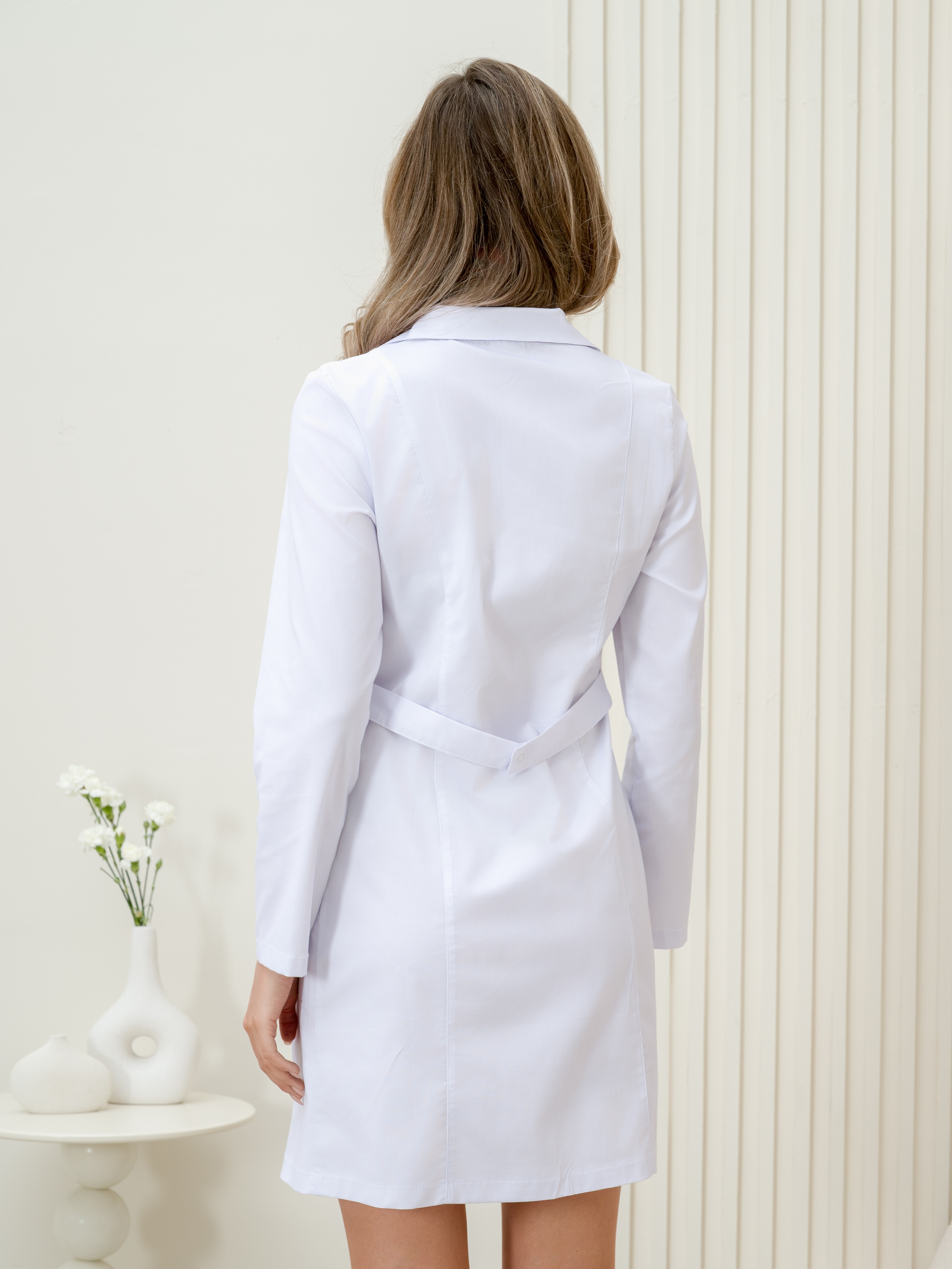 Халат лимитированной серии выполнен из уникальной ткани вискоза/стрейч. Он имеет размерный ряд от 42 до 56 и предназначен для обеспечения комфорта. Халат с длинным рукавом, английским воротником и застёжкой на кнопки.