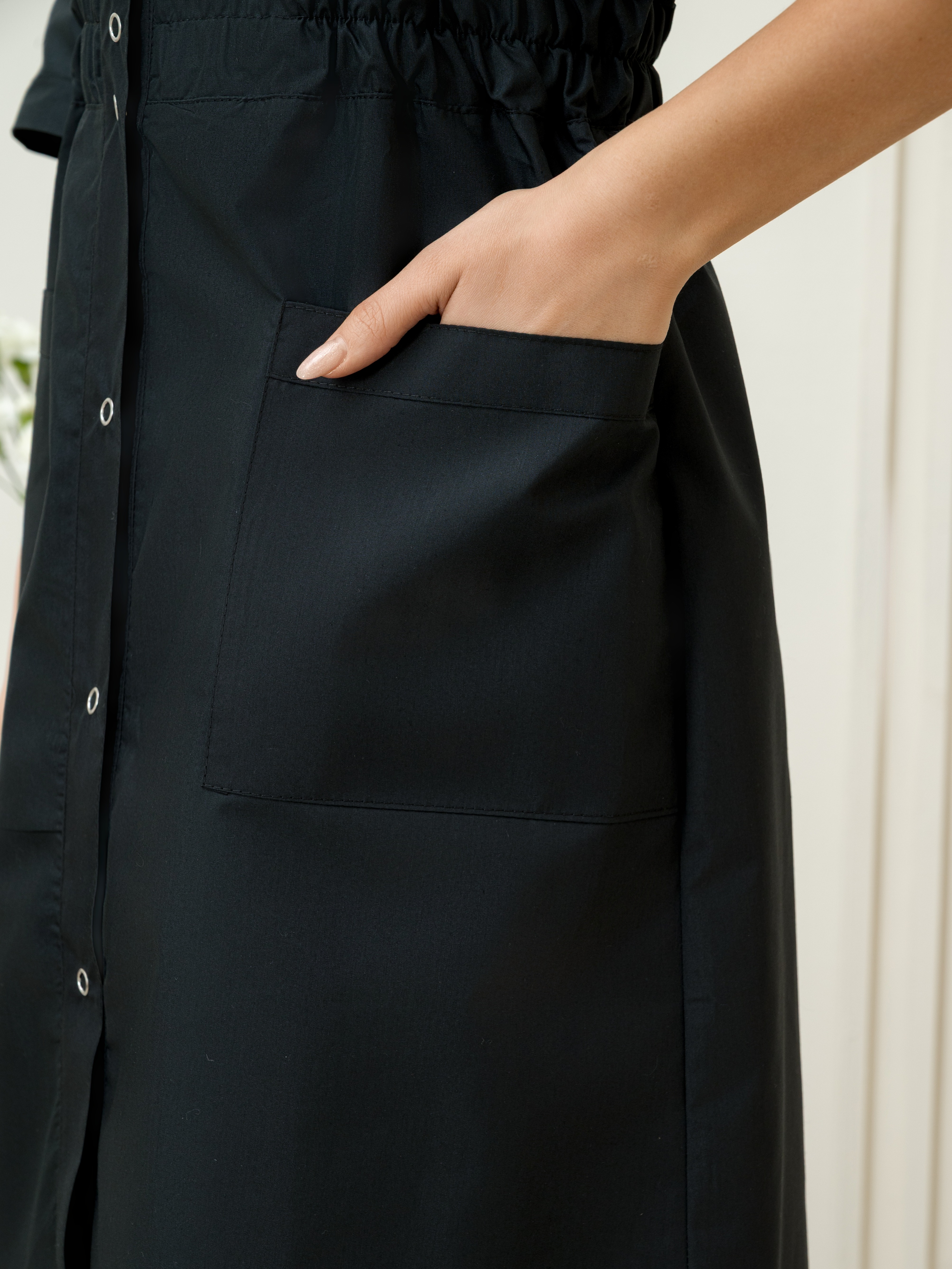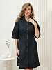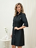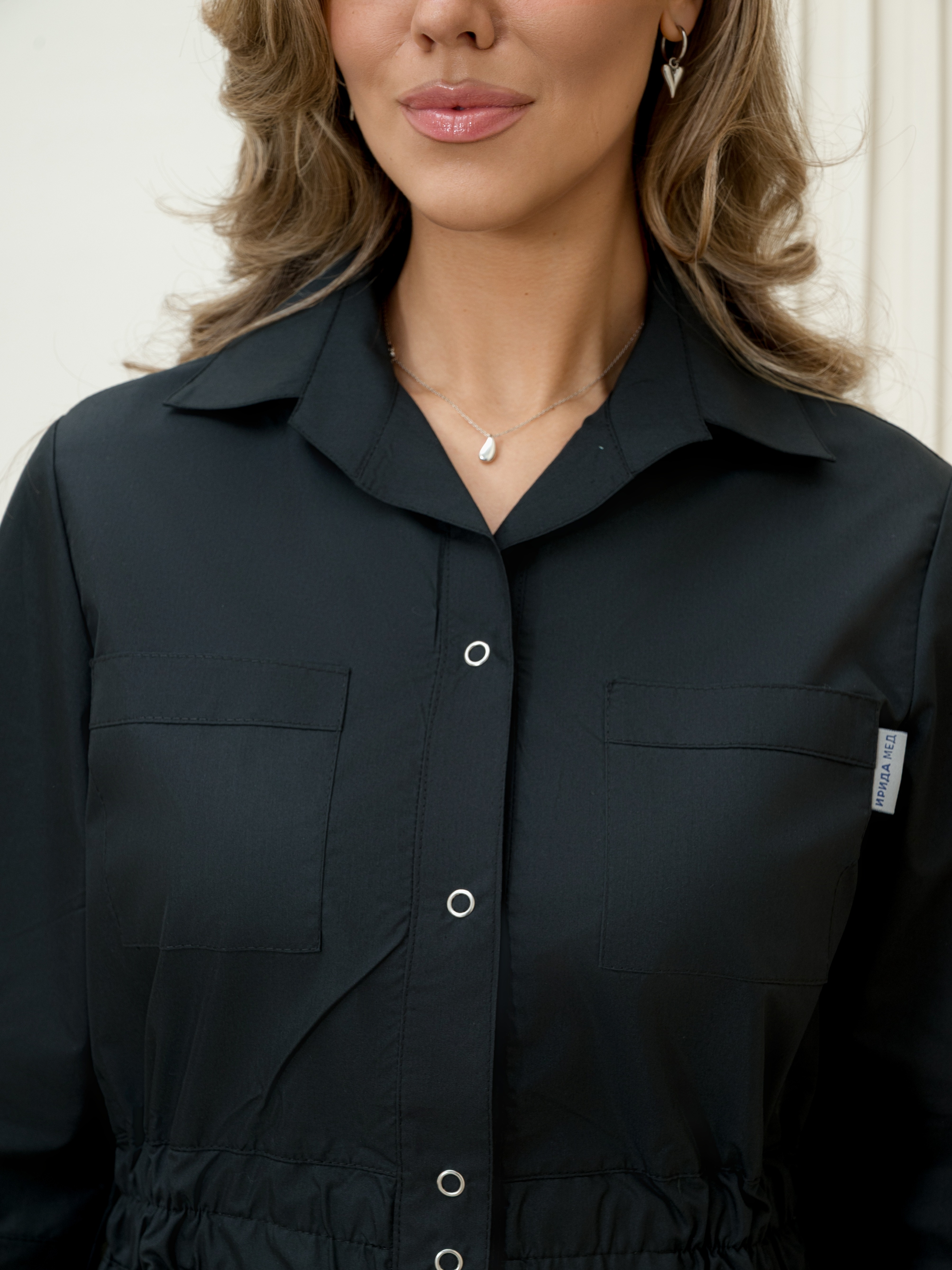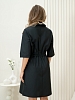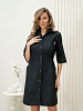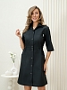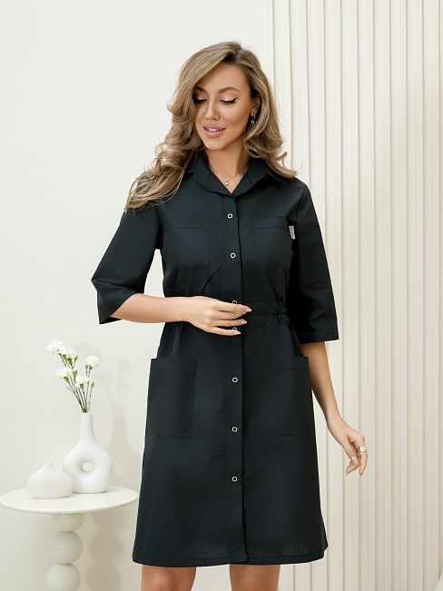 Халат медицинский женский М-075-124 ткань тиси. У халата отложной воротник на стойке, два нагрудных, два нижних боковых кармана, пояс на втачной резинке, рукав 3/4 с манжетой, вид застежки-кнопки.
