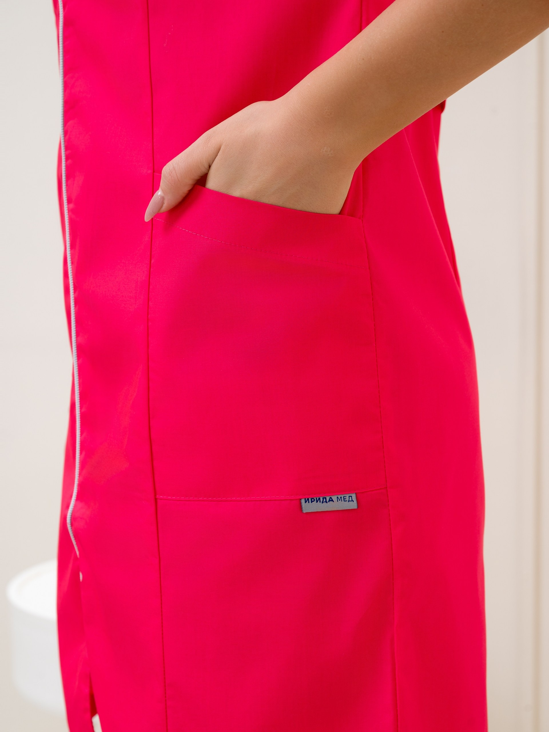 Классический, медицинский, женский халат, на молнии, без воротника и рукавом 3/4. Широкий размерный ряд с 42 по 60 размер. Смесовая ткань ТиСи, с содержанием хлопка 35% и полиэфира 65%, с плотностью 120г/м2, имеющая ВО пропитку.