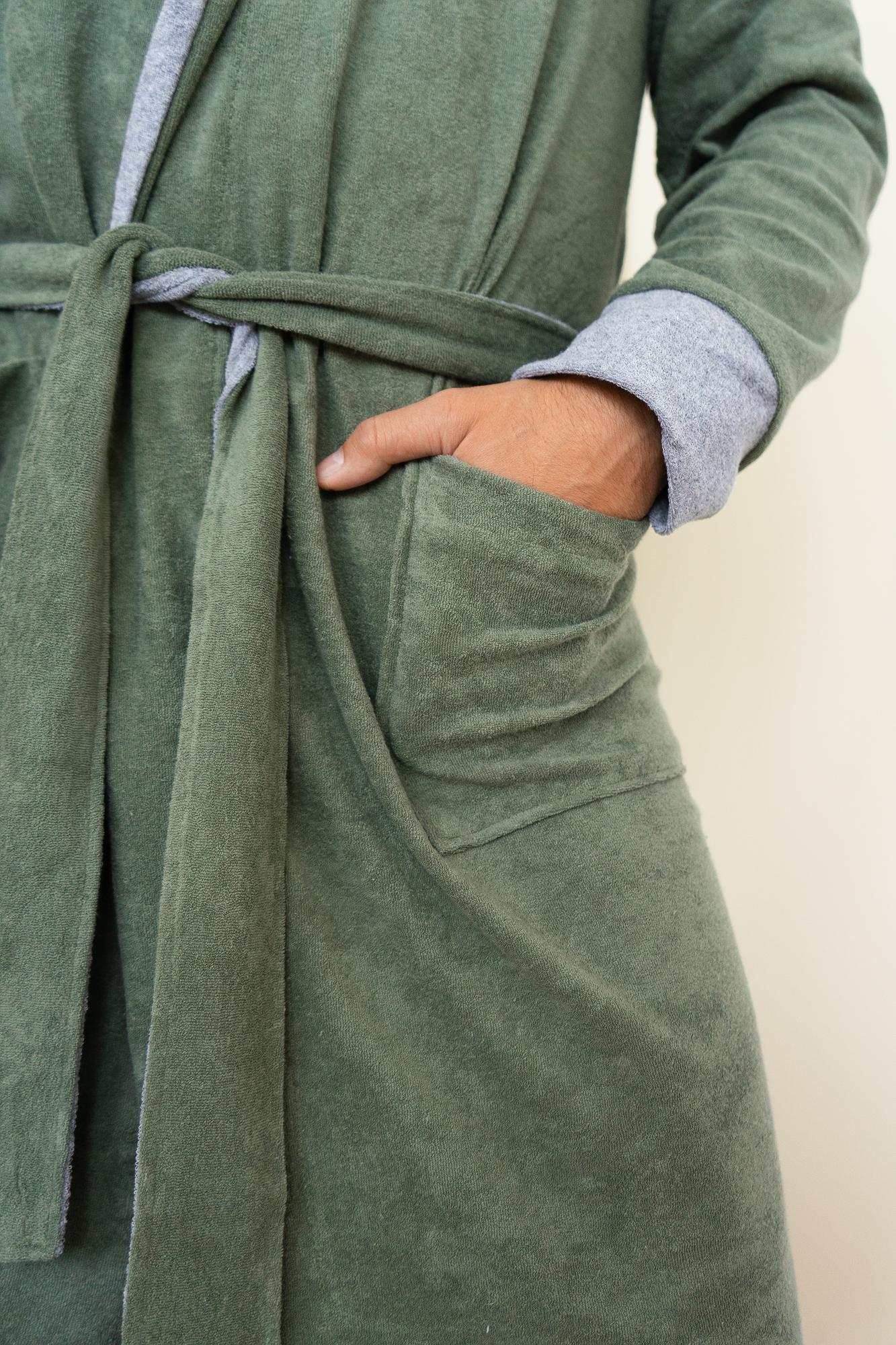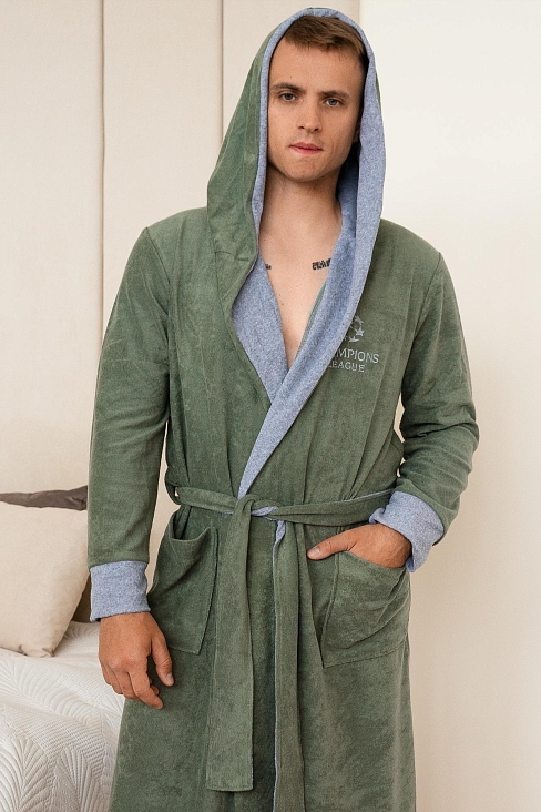 Махровый домашний мужской халат для отдыха и после водных процедур. Красивый и стильный халат с капюшоном, накладными карманами, манжетами и креплением на пояс. Необходимая вещь после трудных рабочих будней, в нем также можно с комфортом отдохнуть и расслабиться после бани или душа.