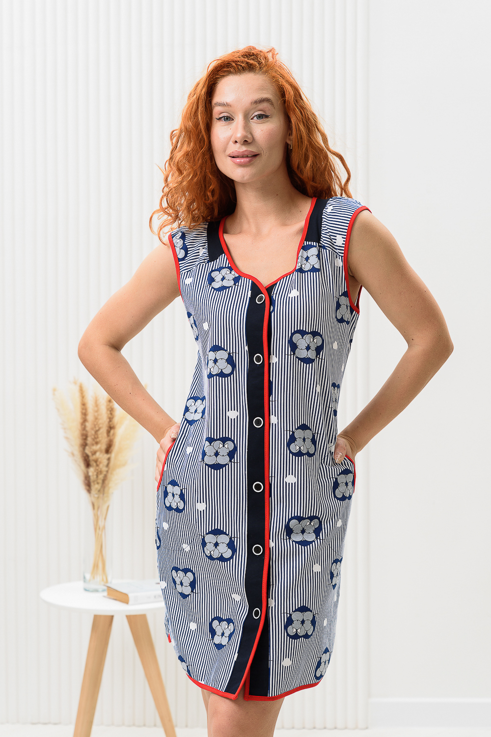 Халат без рукавов, на пуговицах. По бокам расположены карманы. Прекрасно подойдет на каждый день