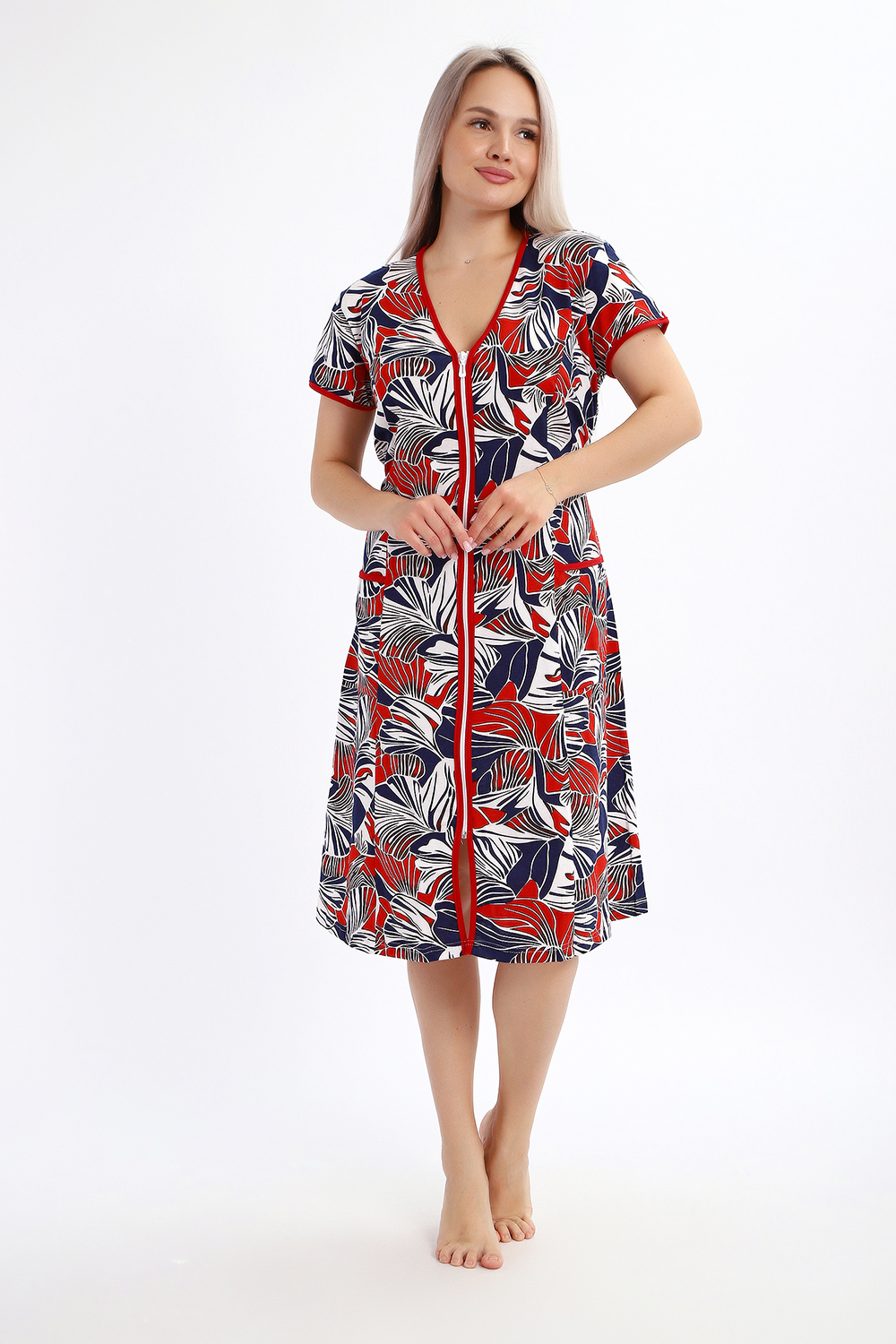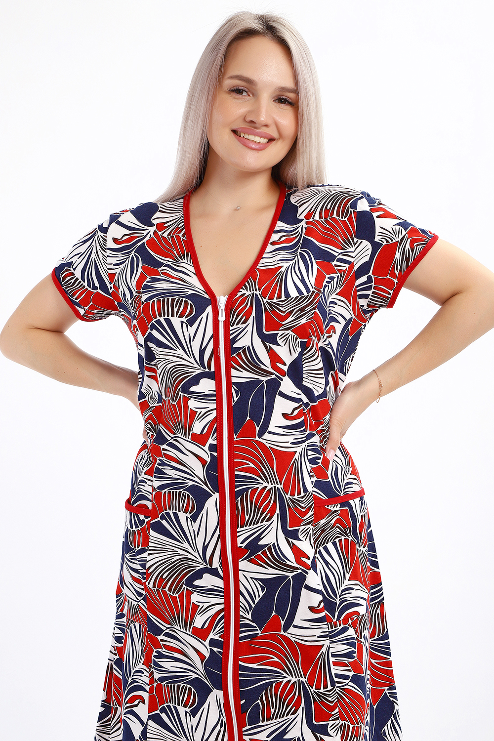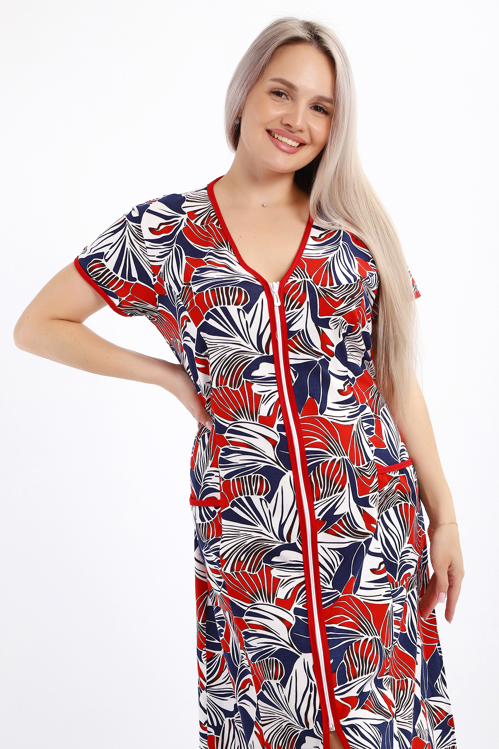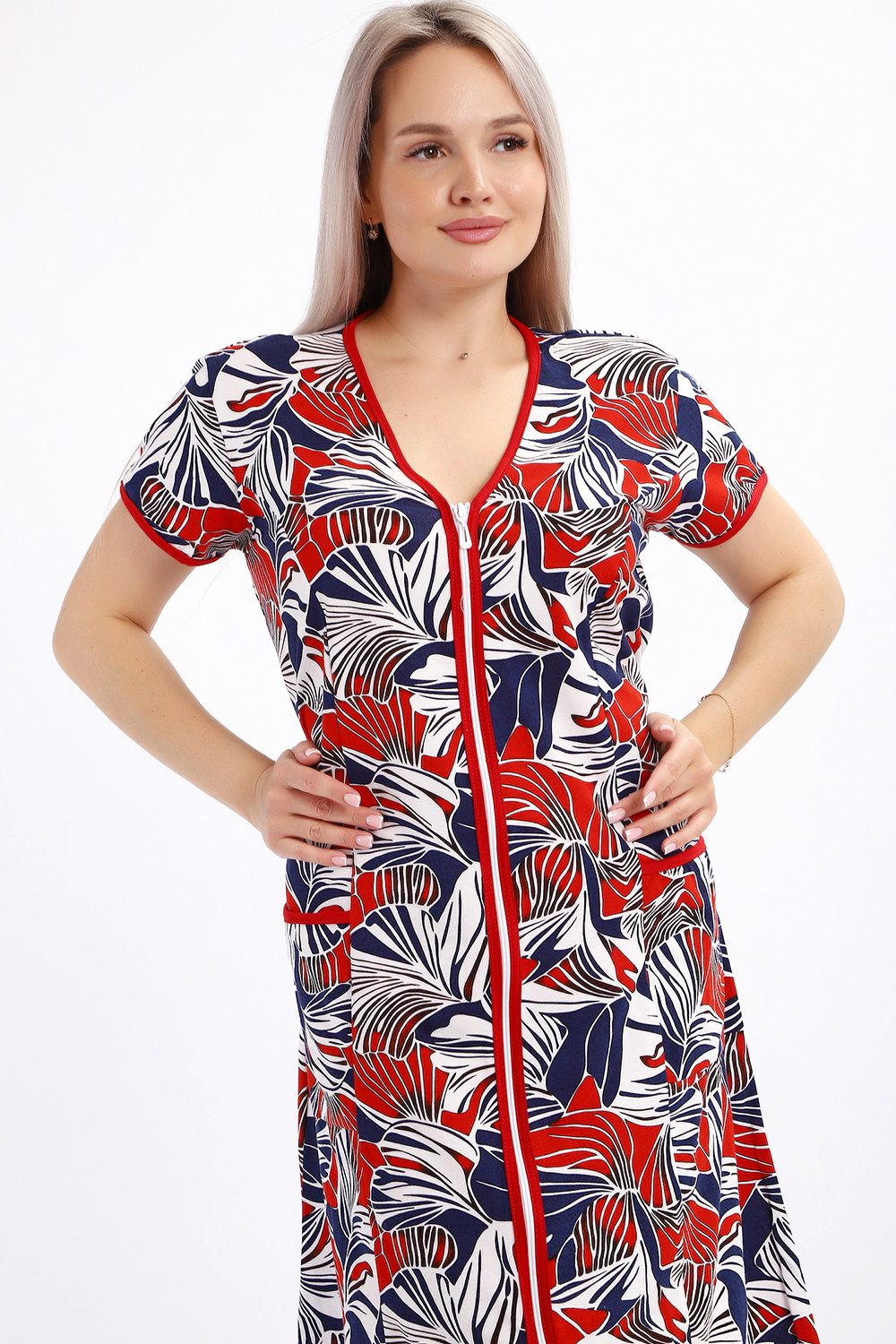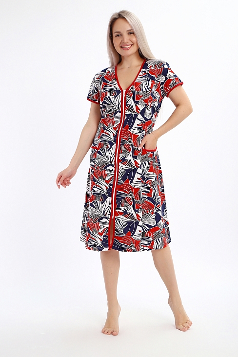 Халат женский на молнии с короткими рукавами, цветной окантовкой, по бокам имеются карманы - это стильный и удобный выбор для комфортного отдыха дома или после душа. Он изготовлен из высококачественного трикотажного материала 100% хлопок, который приятен к телу и обеспечивает мягкость и комфорт в носке. Одной из главных характеристик этого халата является его наличие молнии. Молния предоставляет удобство и легкость при надевании и снятии халата, а также позволяет регулировать степень открытости или закрытости в зависимости от предпочтений и комфорта. Женский халат на молнии доступен в больших размерах, что делает его идеальным выбором для женщин, которые ценят свободу движений и комфорт в одежде. Большие размеры обеспечивают свободу и расслабленность, не сковывая движений и создавая ощущение свободы.