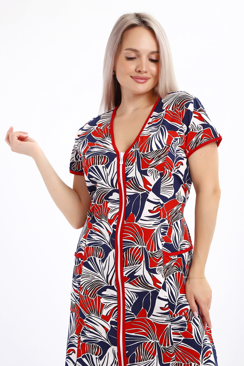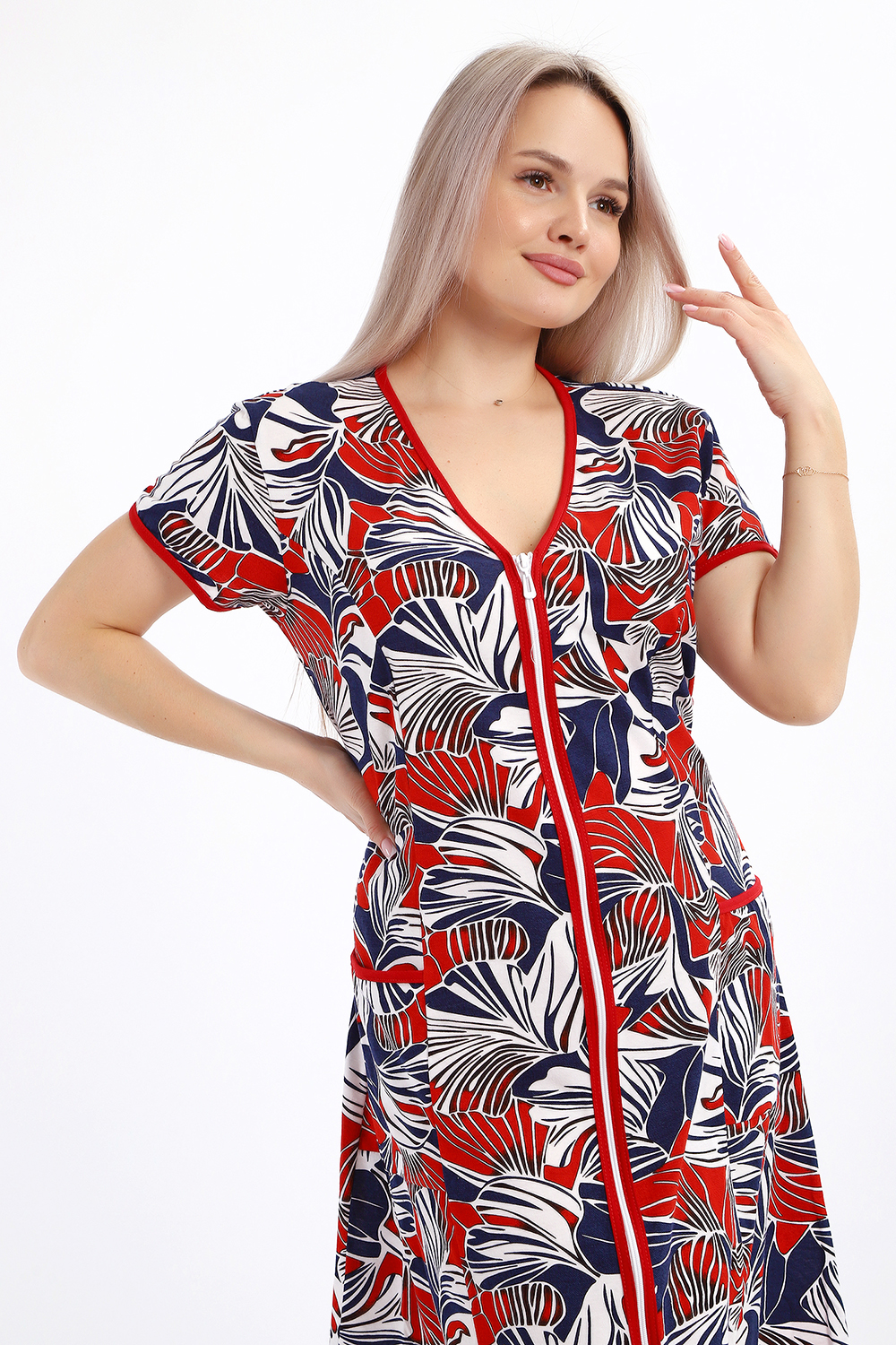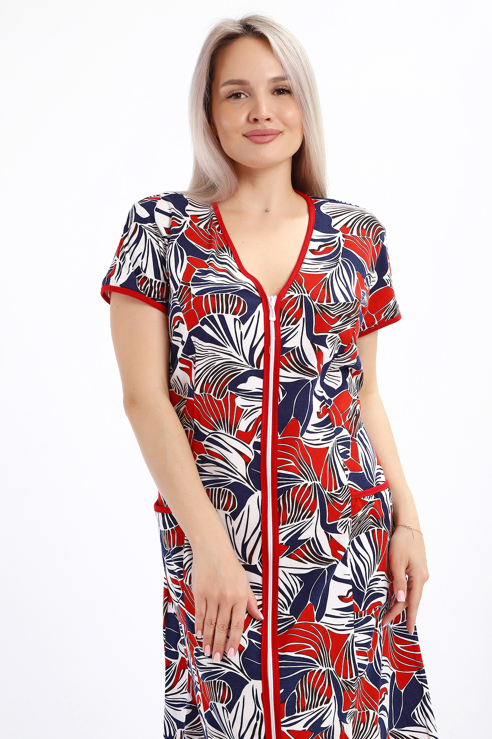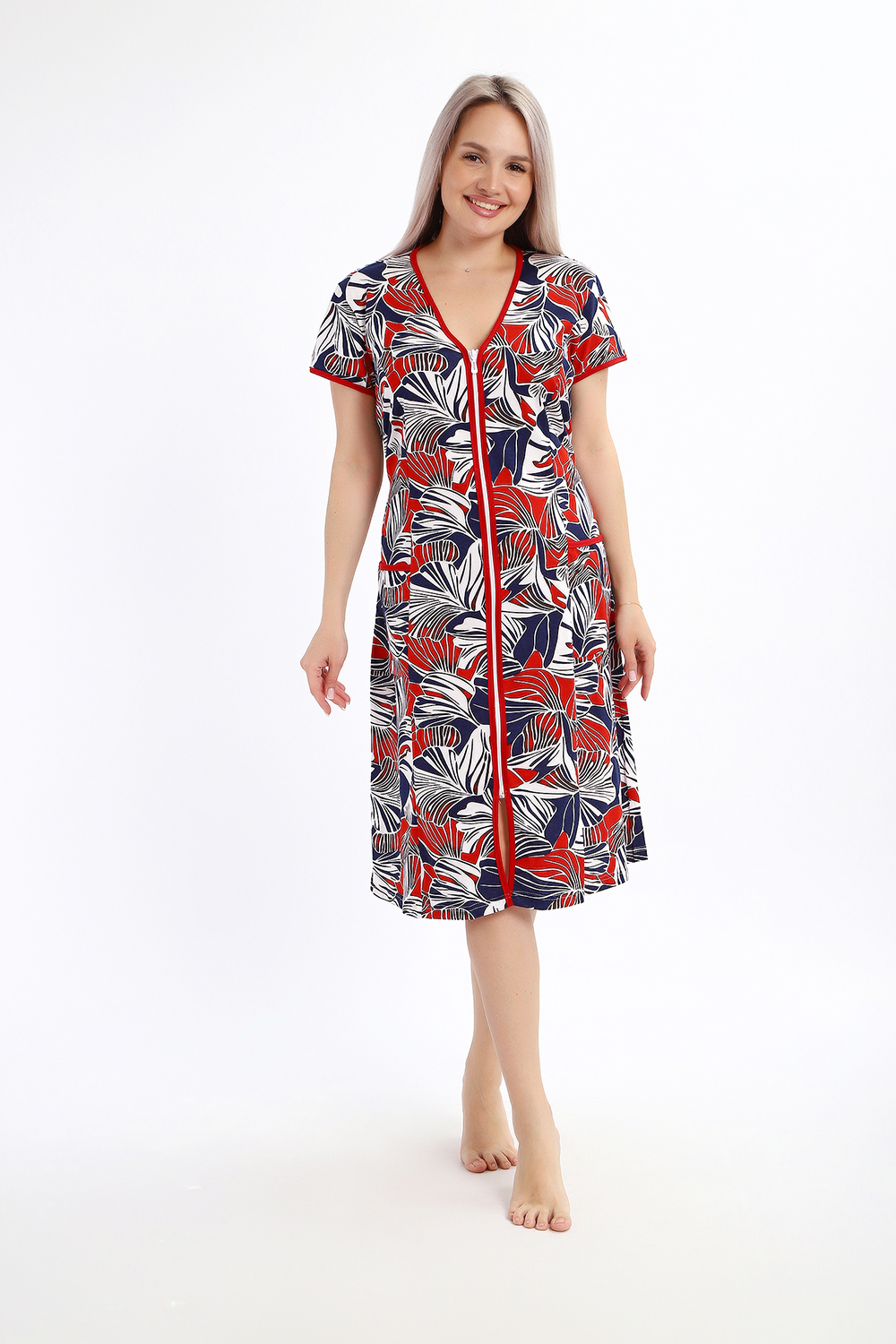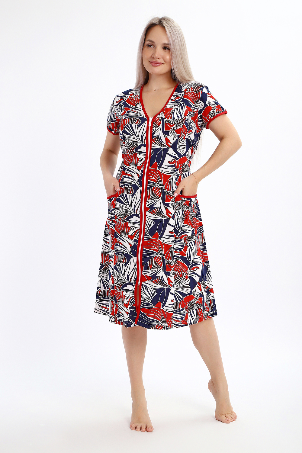 Халат женский на молнии с короткими рукавами, цветной окантовкой, по бокам имеются карманы - это стильный и удобный выбор для комфортного отдыха дома или после душа. Он изготовлен из высококачественного трикотажного материала 100% хлопок, который приятен к телу и обеспечивает мягкость и комфорт в носке. Одной из главных характеристик этого халата является его наличие молнии. Молния предоставляет удобство и легкость при надевании и снятии халата, а также позволяет регулировать степень открытости или закрытости в зависимости от предпочтений и комфорта. Женский халат на молнии доступен в больших размерах, что делает его идеальным выбором для женщин, которые ценят свободу движений и комфорт в одежде. Большие размеры обеспечивают свободу и расслабленность, не сковывая движений и создавая ощущение свободы.