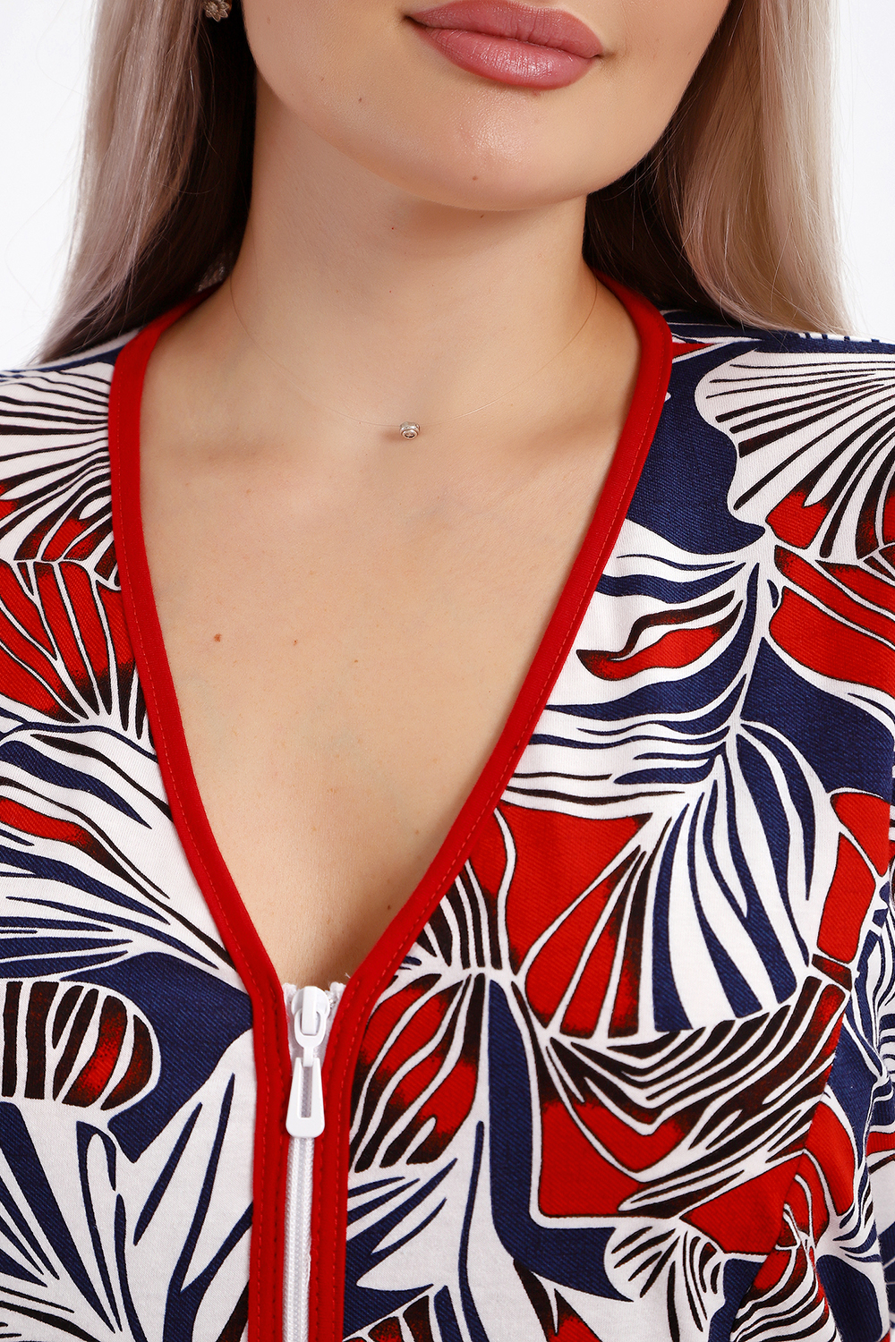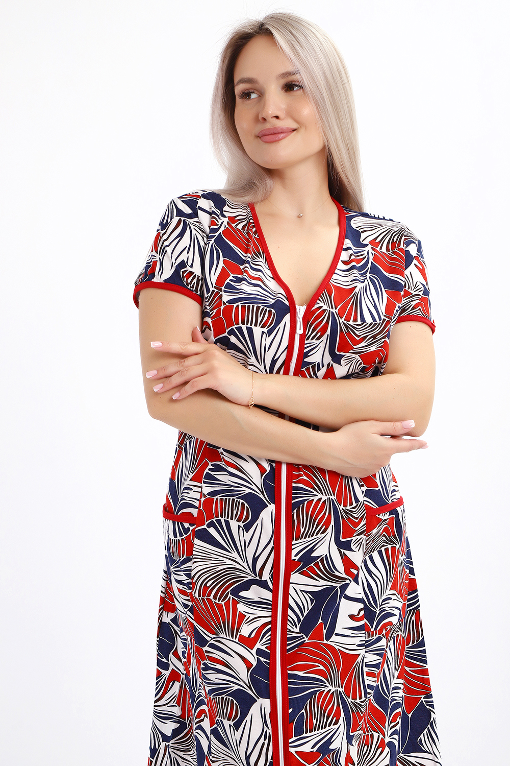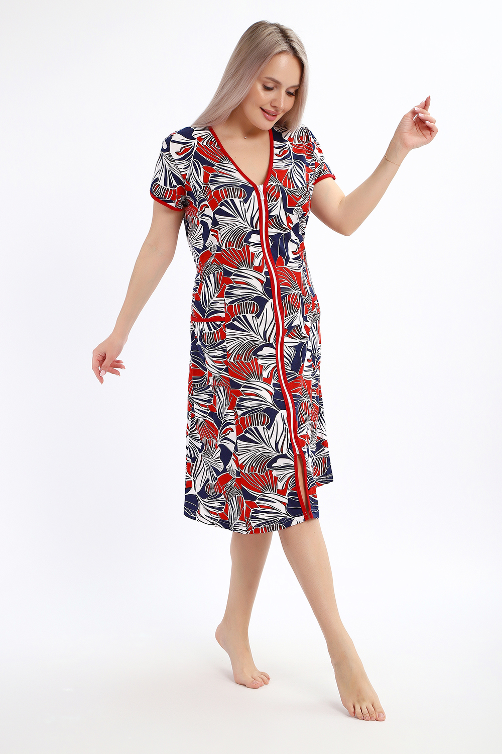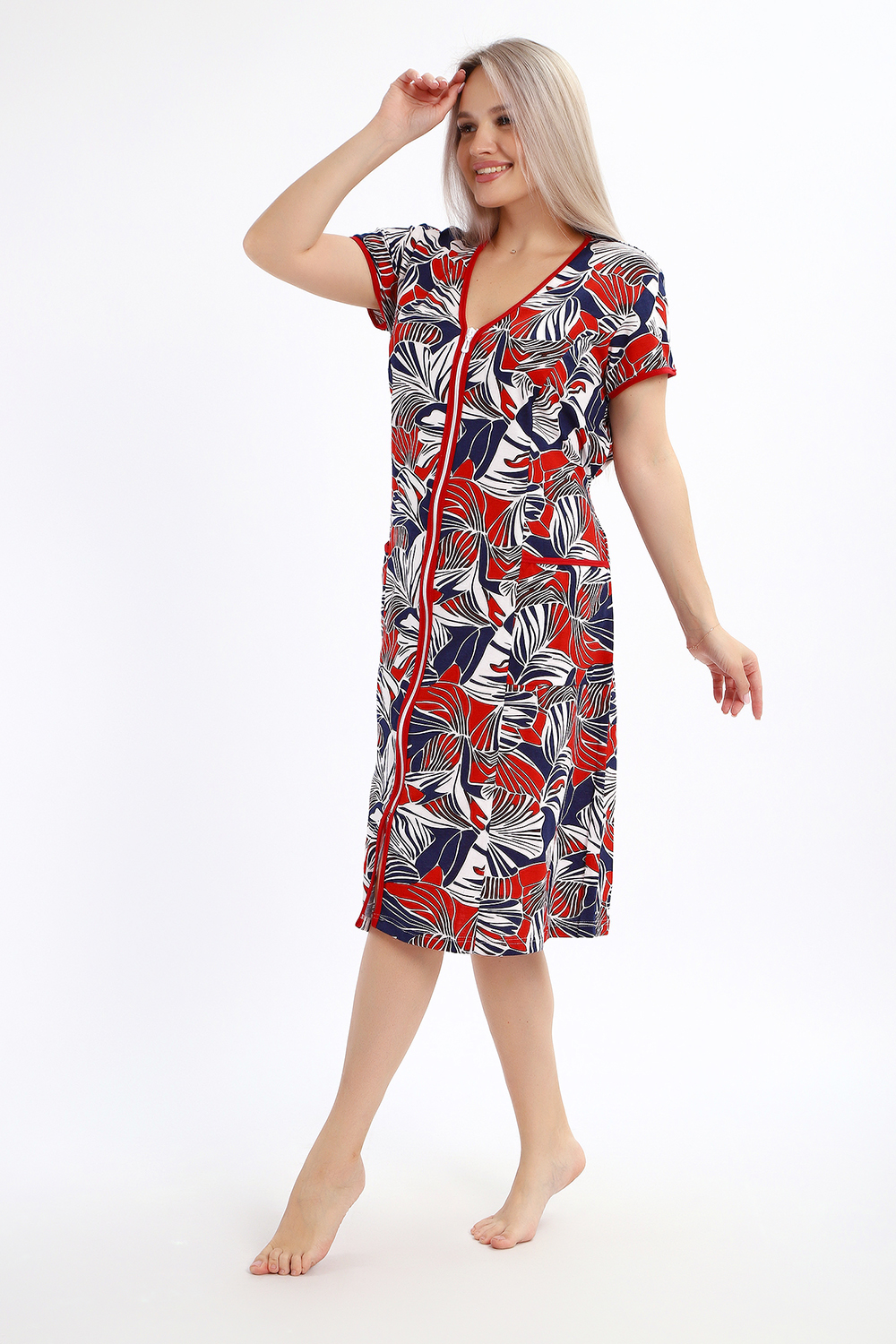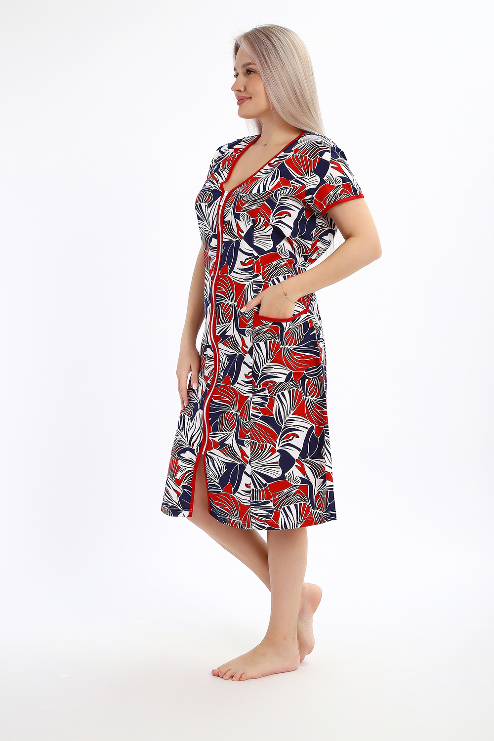 Халат женский на молнии с короткими рукавами, цветной окантовкой, по бокам имеются карманы - это стильный и удобный выбор для комфортного отдыха дома или после душа. Он изготовлен из высококачественного трикотажного материала 100% хлопок, который приятен к телу и обеспечивает мягкость и комфорт в носке. Одной из главных характеристик этого халата является его наличие молнии. Молния предоставляет удобство и легкость при надевании и снятии халата, а также позволяет регулировать степень открытости или закрытости в зависимости от предпочтений и комфорта. Женский халат на молнии доступен в больших размерах, что делает его идеальным выбором для женщин, которые ценят свободу движений и комфорт в одежде. Большие размеры обеспечивают свободу и расслабленность, не сковывая движений и создавая ощущение свободы.