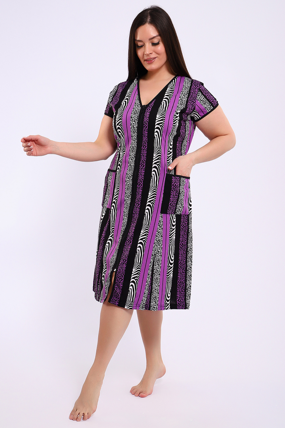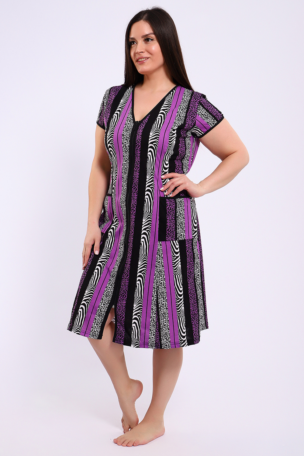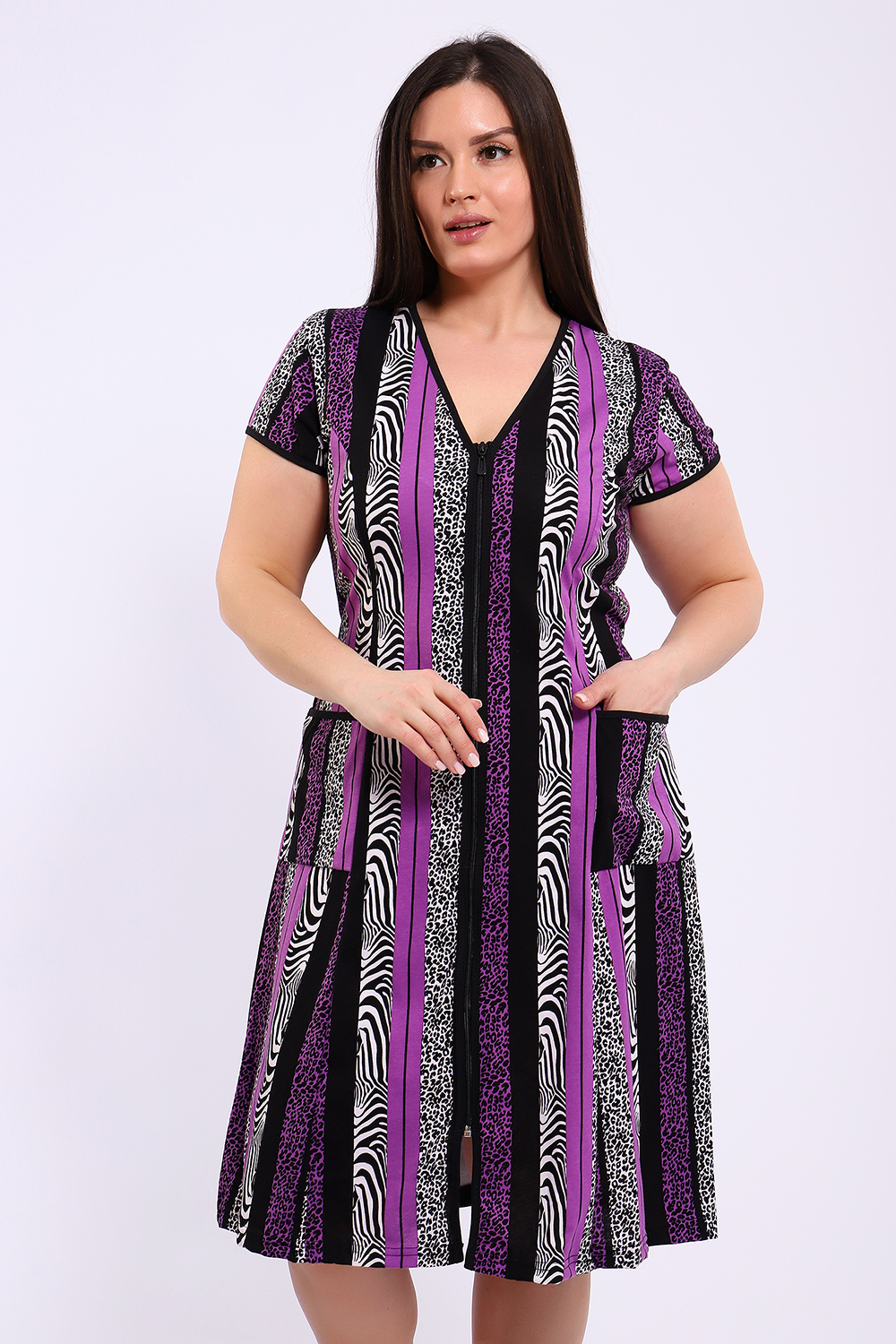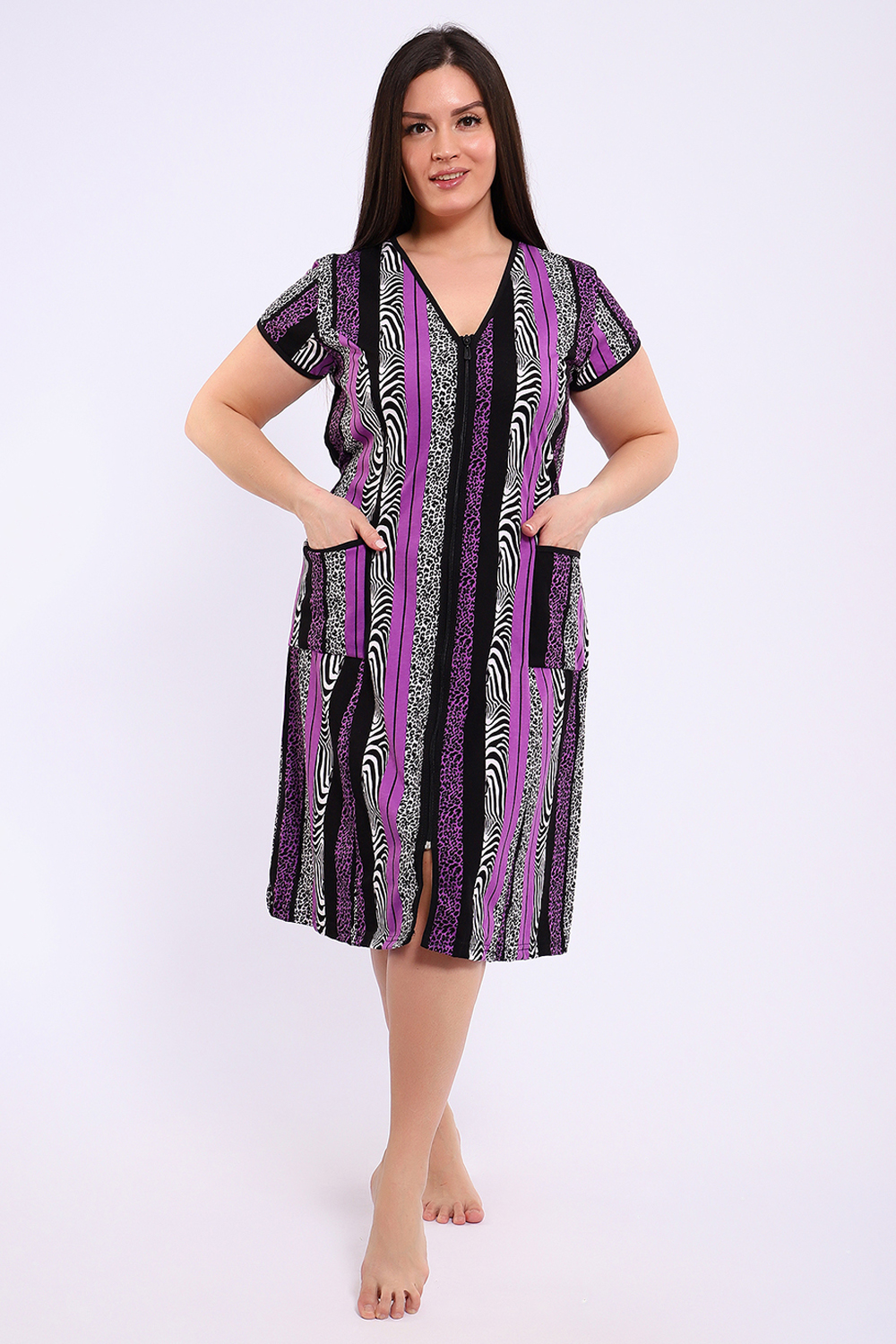 Халат женский на молнии с короткими рукавами, цветной окантовкой, по бокам имеются карманы - это стильный и удобный выбор для комфортного отдыха дома или после душа. Он изготовлен из высококачественного трикотажного материала 100% хлопок, который приятен к телу и обеспечивает мягкость и комфорт в носке. Одной из главных характеристик этого халата является его наличие молнии. Молния предоставляет удобство и легкость при надевании и снятии халата, а также позволяет регулировать степень открытости или закрытости в зависимости от предпочтений и комфорта. Женский халат на молнии доступен в больших размерах, что делает его идеальным выбором для женщин, которые ценят свободу движений и комфорт в одежде. Большие размеры обеспечивают свободу и расслабленность, не сковывая движений и создавая ощущение свободы.