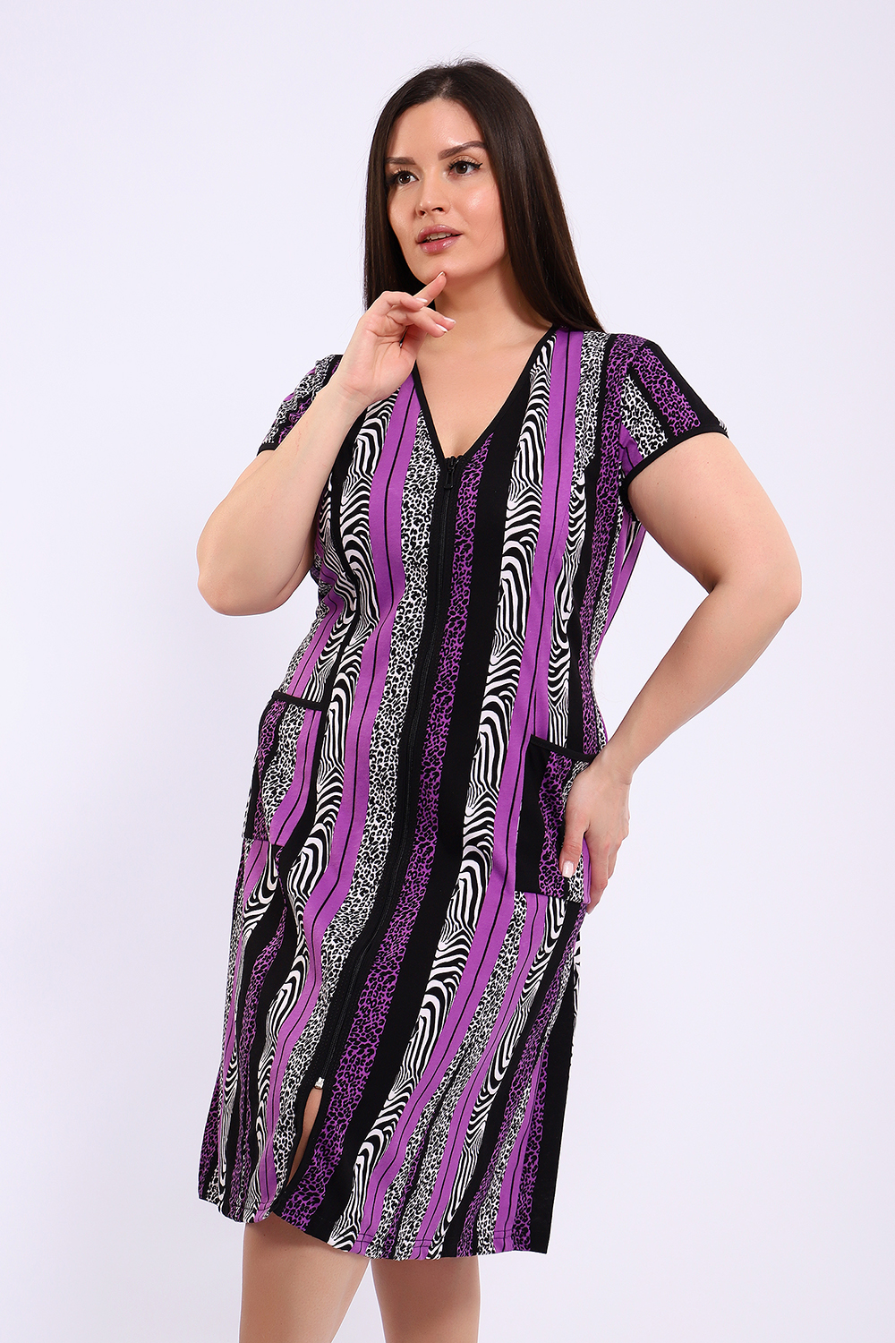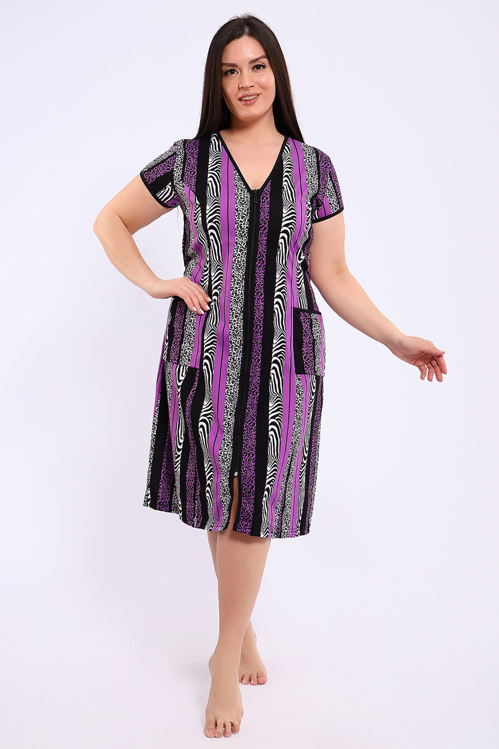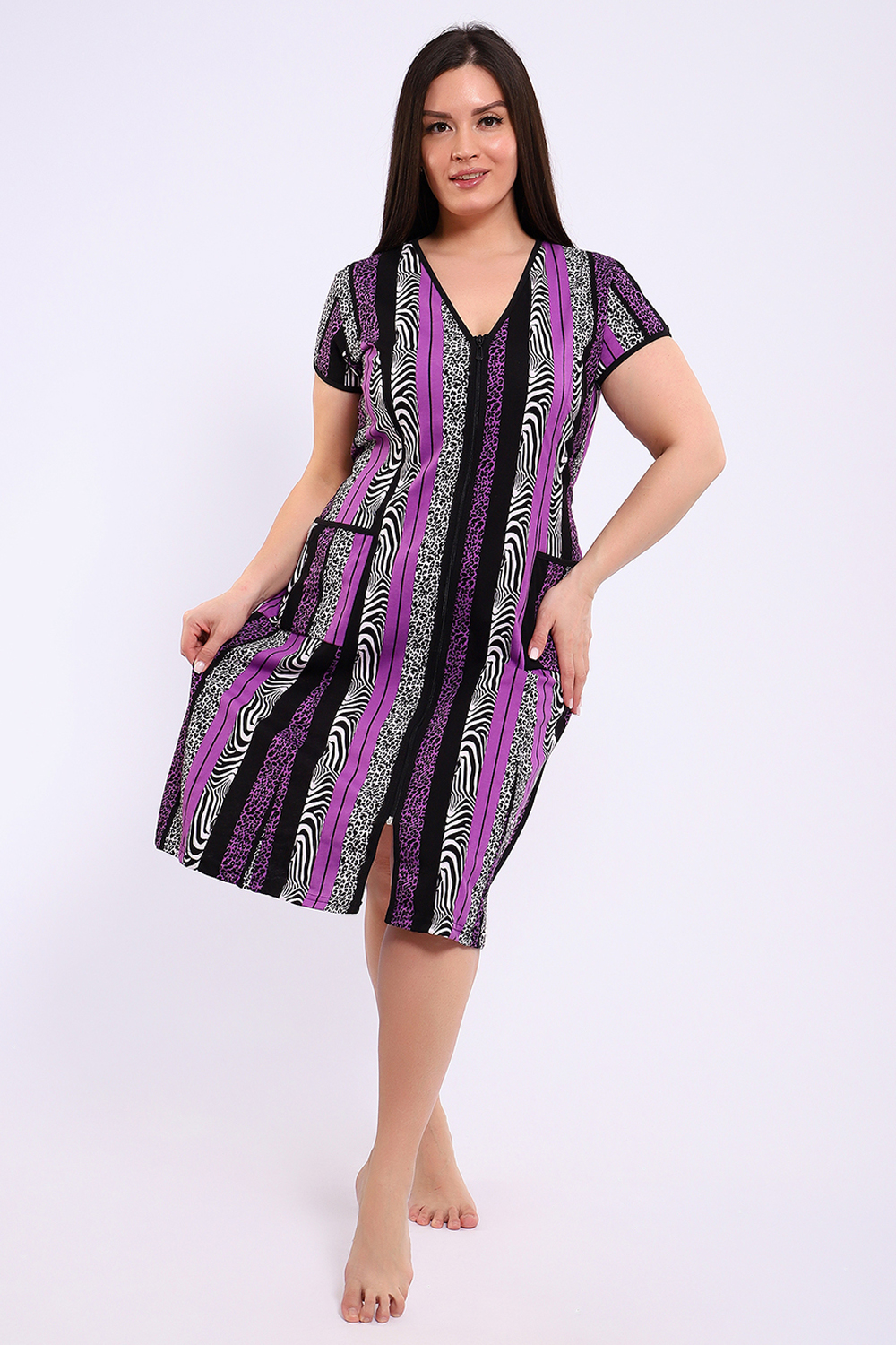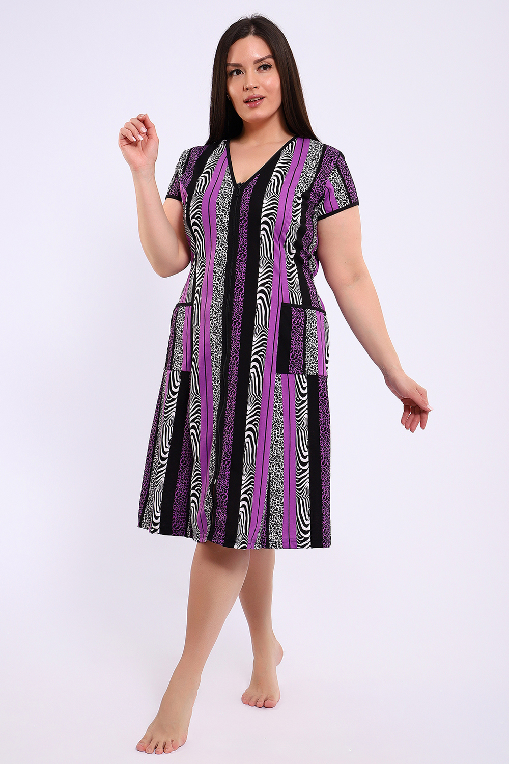 Халат женский на молнии с короткими рукавами, цветной окантовкой, по бокам имеются карманы - это стильный и удобный выбор для комфортного отдыха дома или после душа. Он изготовлен из высококачественного трикотажного материала 100% хлопок, который приятен к телу и обеспечивает мягкость и комфорт в носке. Одной из главных характеристик этого халата является его наличие молнии. Молния предоставляет удобство и легкость при надевании и снятии халата, а также позволяет регулировать степень открытости или закрытости в зависимости от предпочтений и комфорта. Женский халат на молнии доступен в больших размерах, что делает его идеальным выбором для женщин, которые ценят свободу движений и комфорт в одежде. Большие размеры обеспечивают свободу и расслабленность, не сковывая движений и создавая ощущение свободы.
