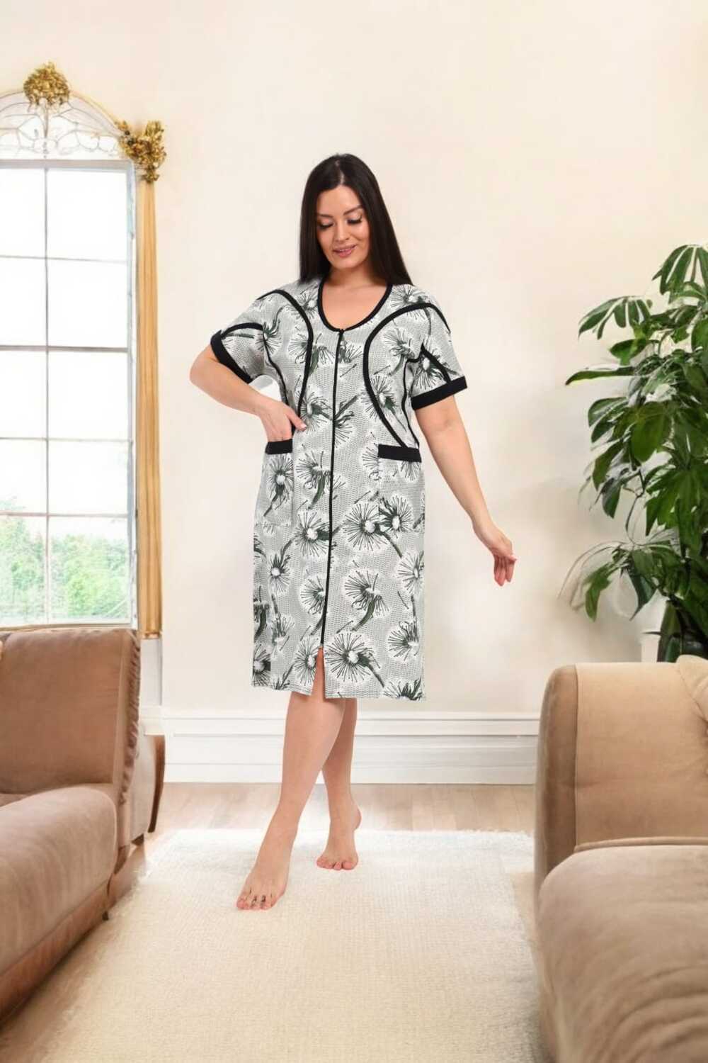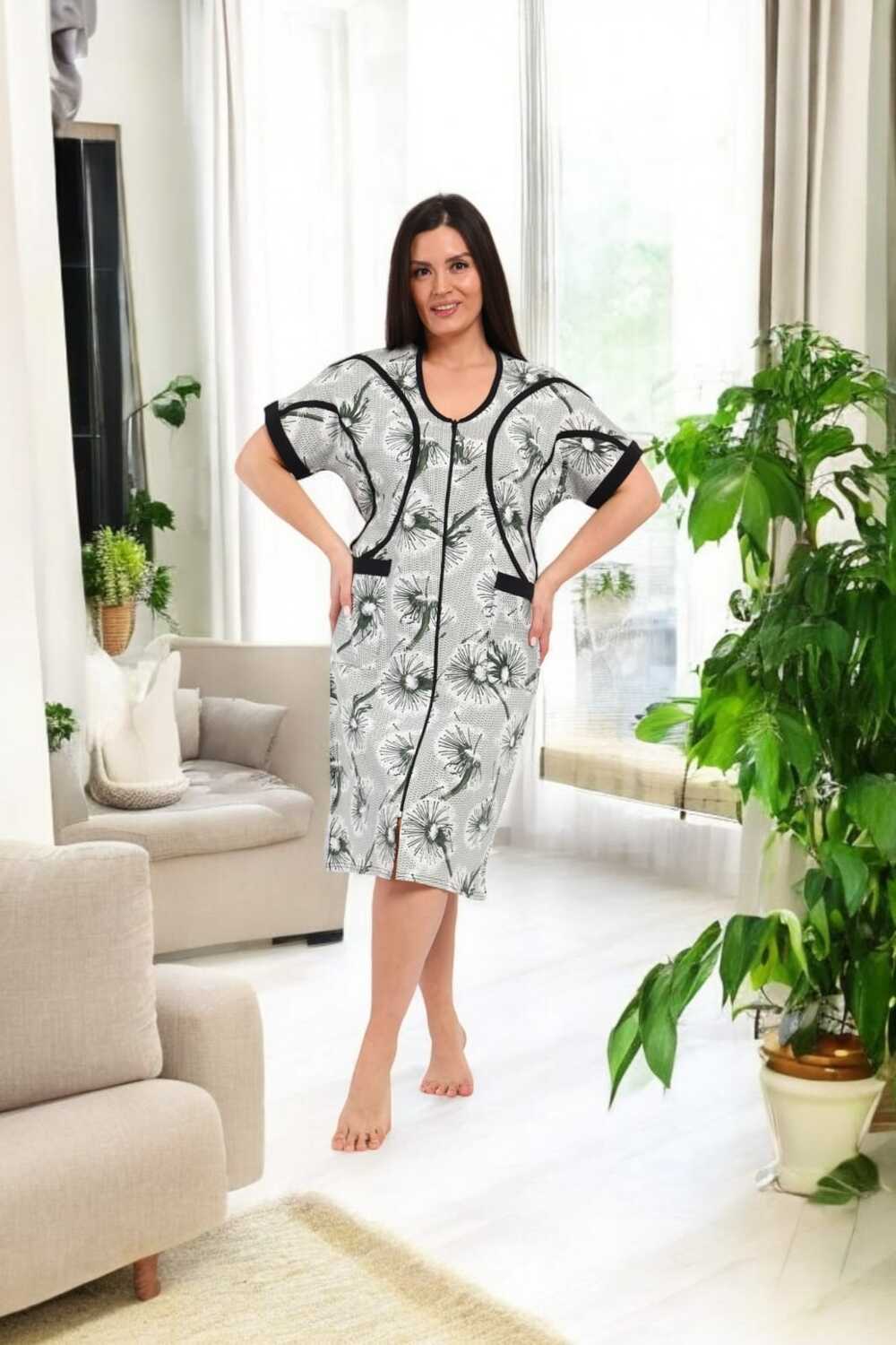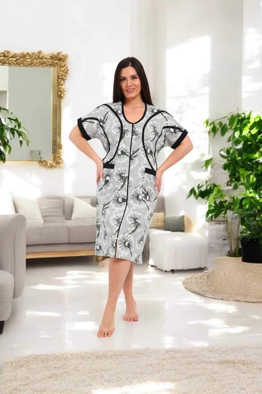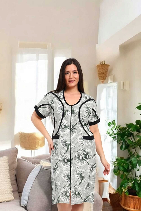 В удобном домашнем халате на молнии с короткими рукавами и длиной до колен. Халат выполнен в светлых тонах с изящным цветочным принтом и дополнен контрастной черной окантовкой, придающей ему стильный вид. Функциональные карманы спереди делают модель практичной для повседневного ношения.